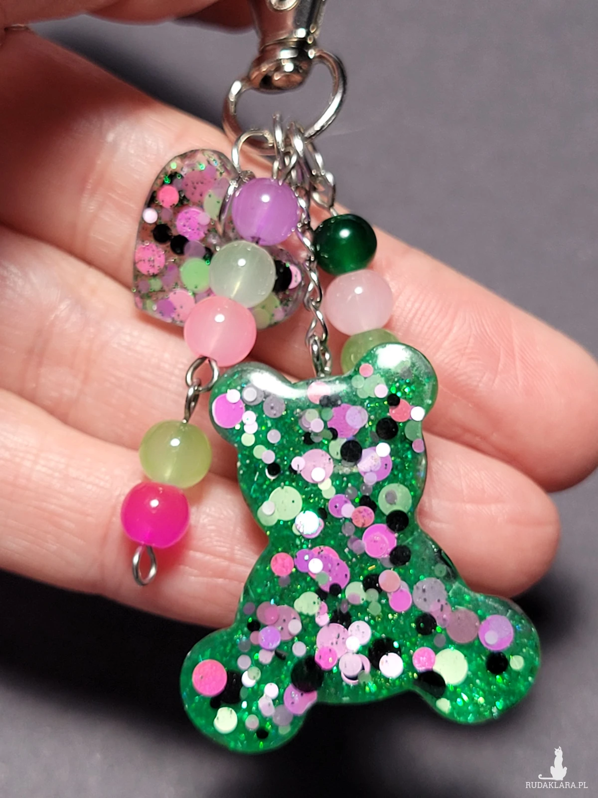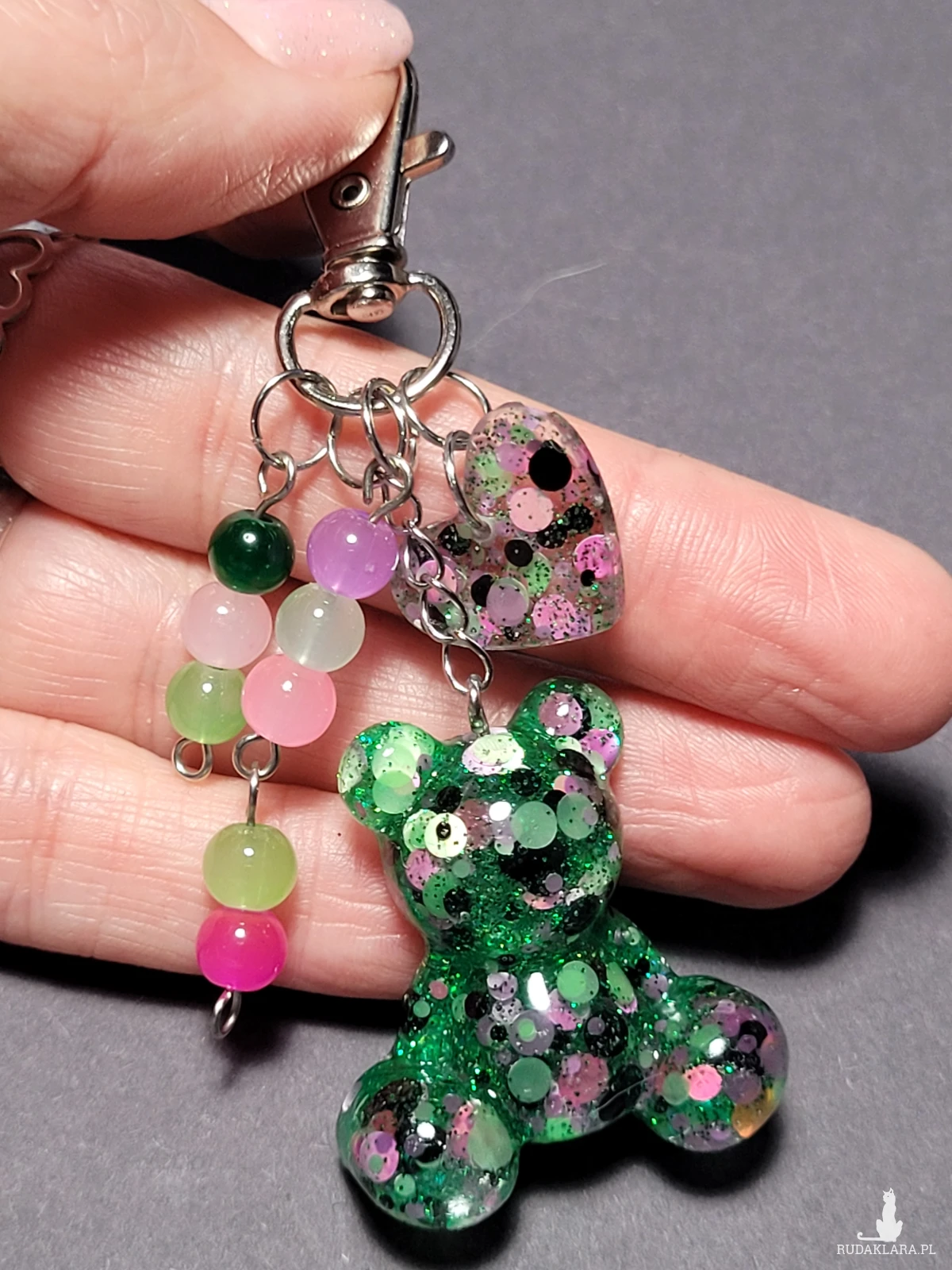 Brelok zawieszka zielony z Misiem i sercem z żywicy do kluczy, torebki, plecaka