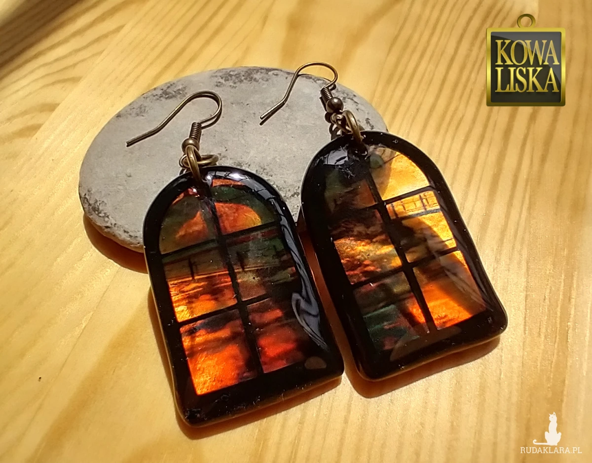 Ciemnobursztynowy, przejrzysty pejzażyk zamknięty w obramowaniu czarnej, okiennej framugi. Ciekawe, błyszczące, utrzymane w ciemnej tonacji efektowne kolczyki.