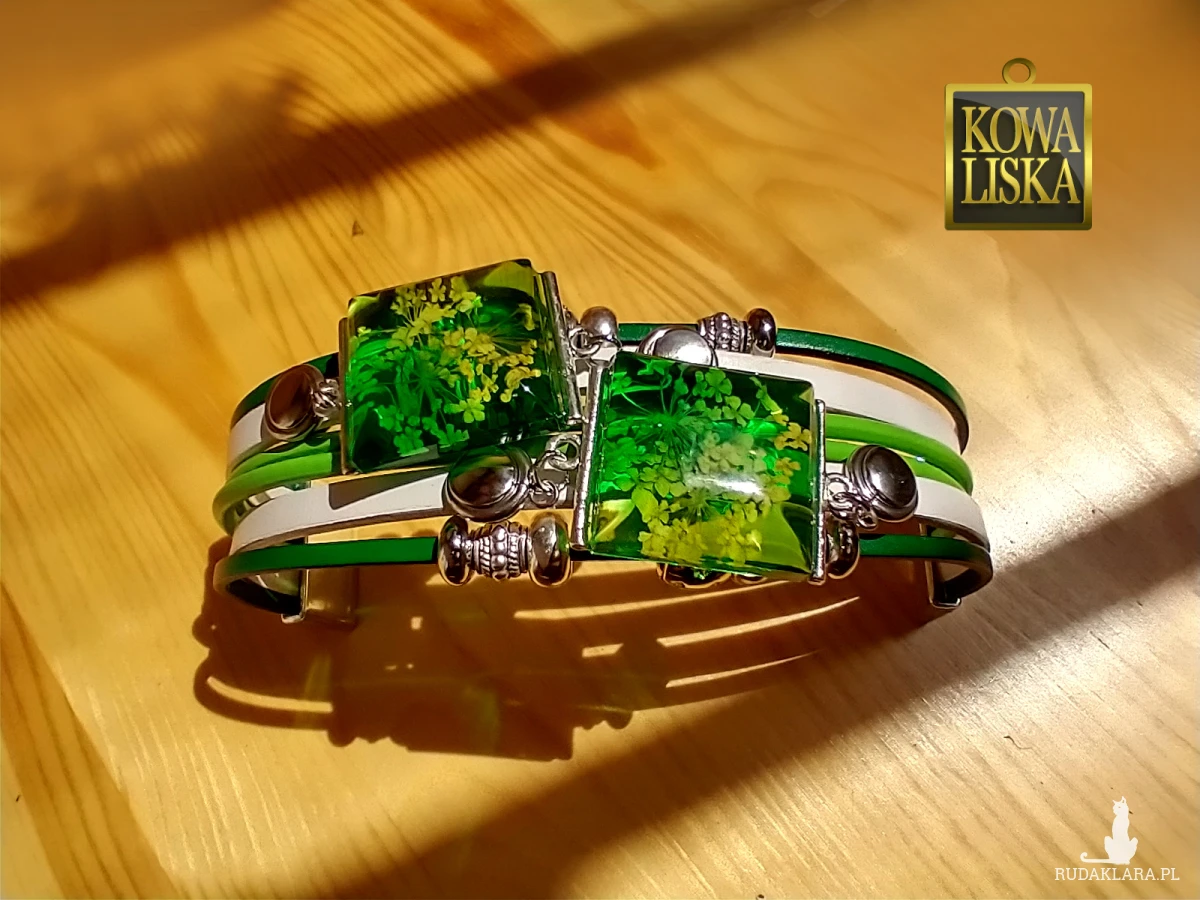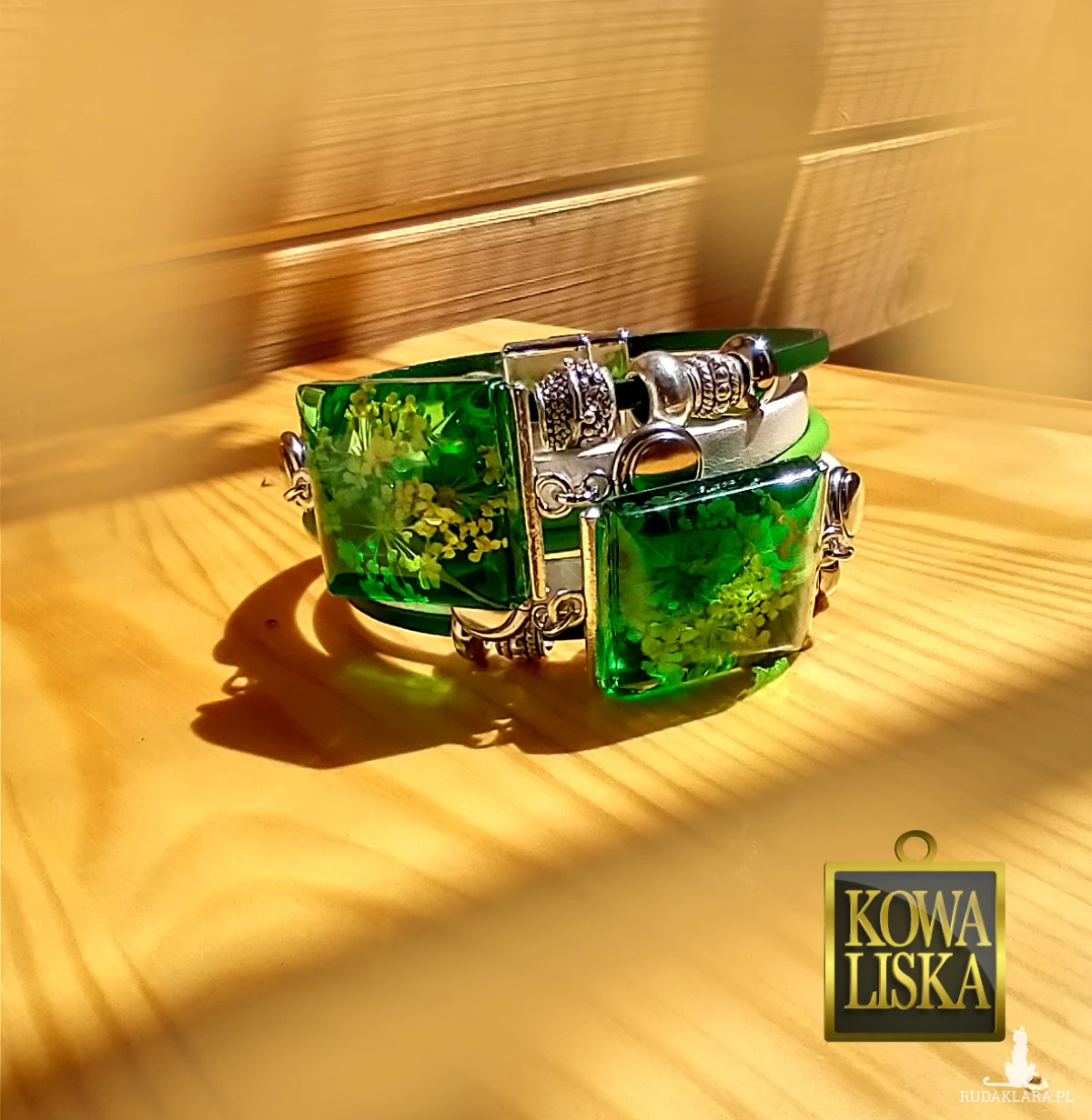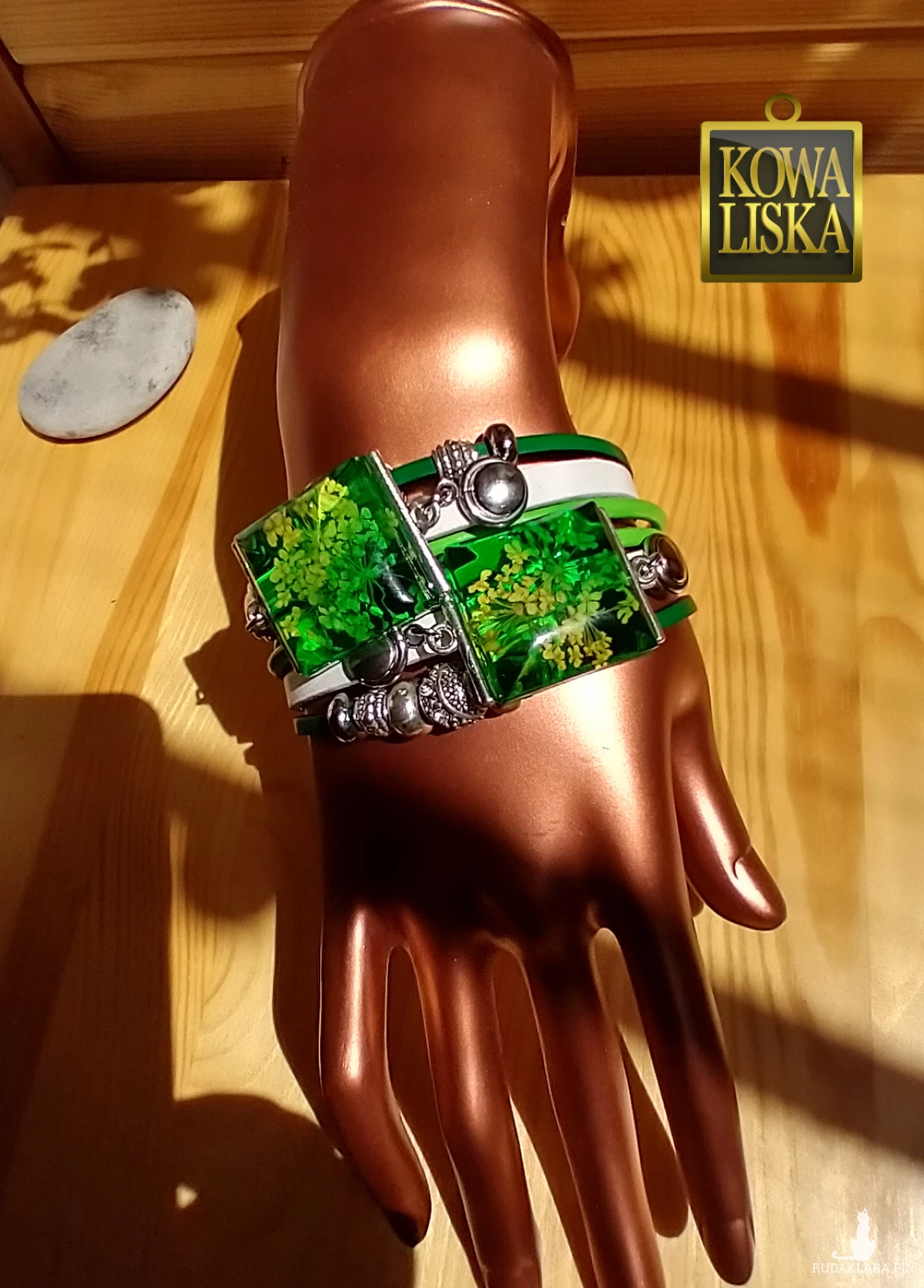 Ciężkość rzemieni i metalu pięknie się uzupełnia z eterycznością żywicy i kwiatów. Bransoleta pięknie odbija światło, jest widoczna z daleka. Srebrzyste przekładki nadają charakteru i blasku - można je dowolnie przesuwać i układać po swojemu.