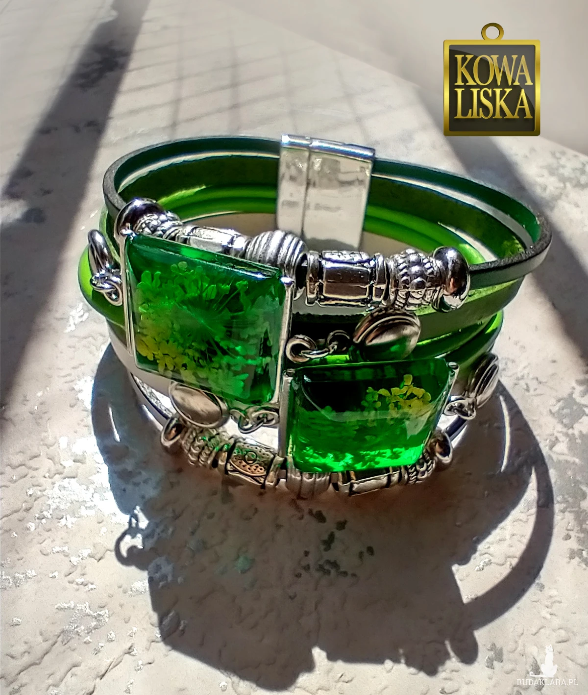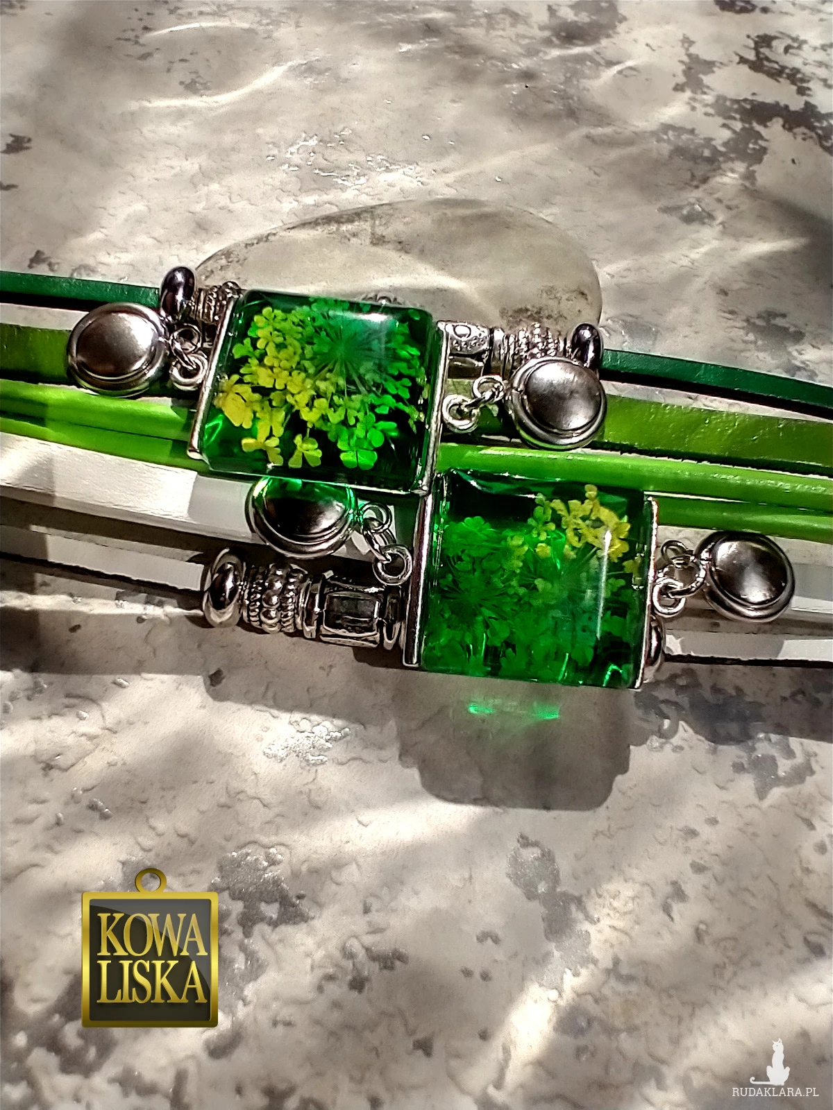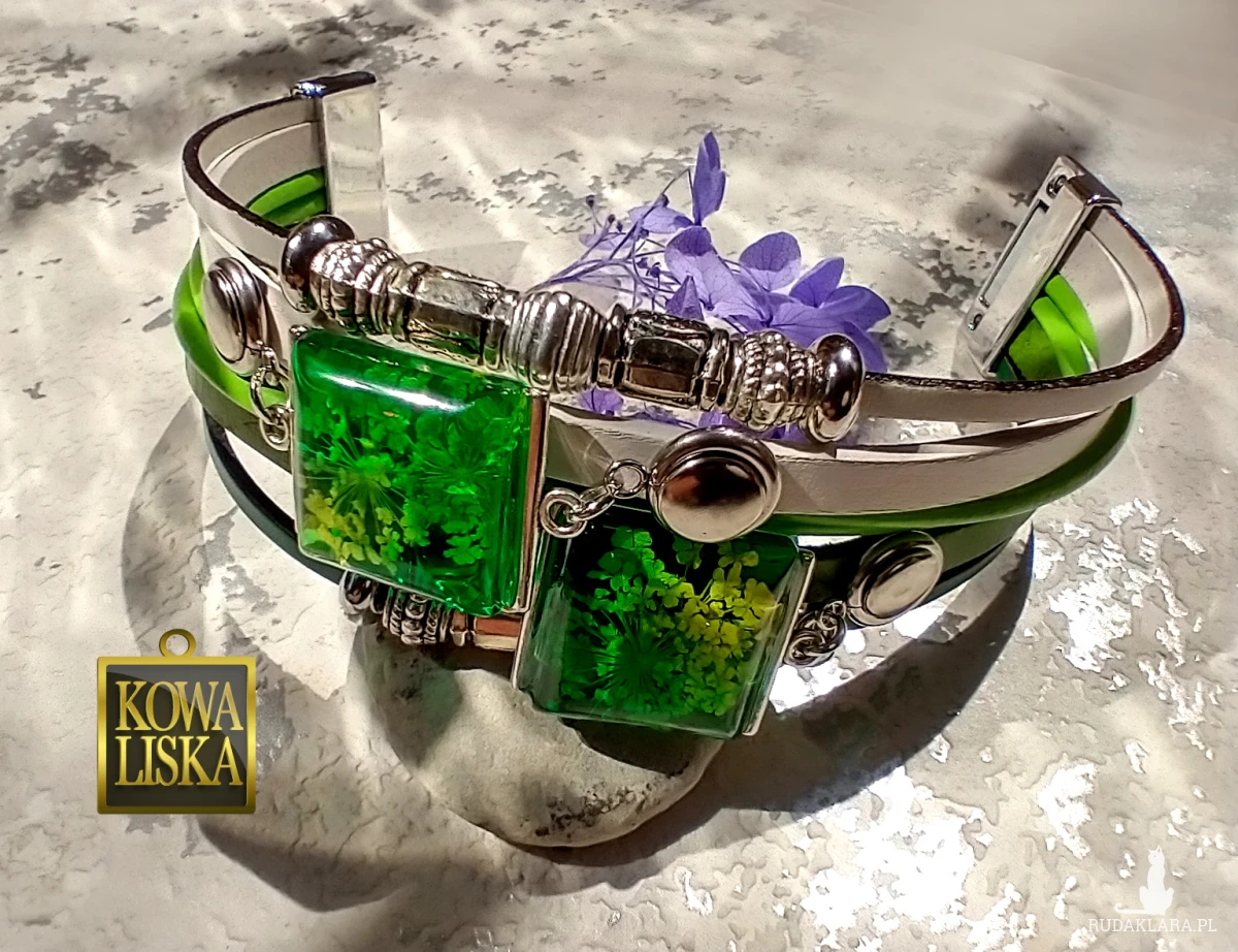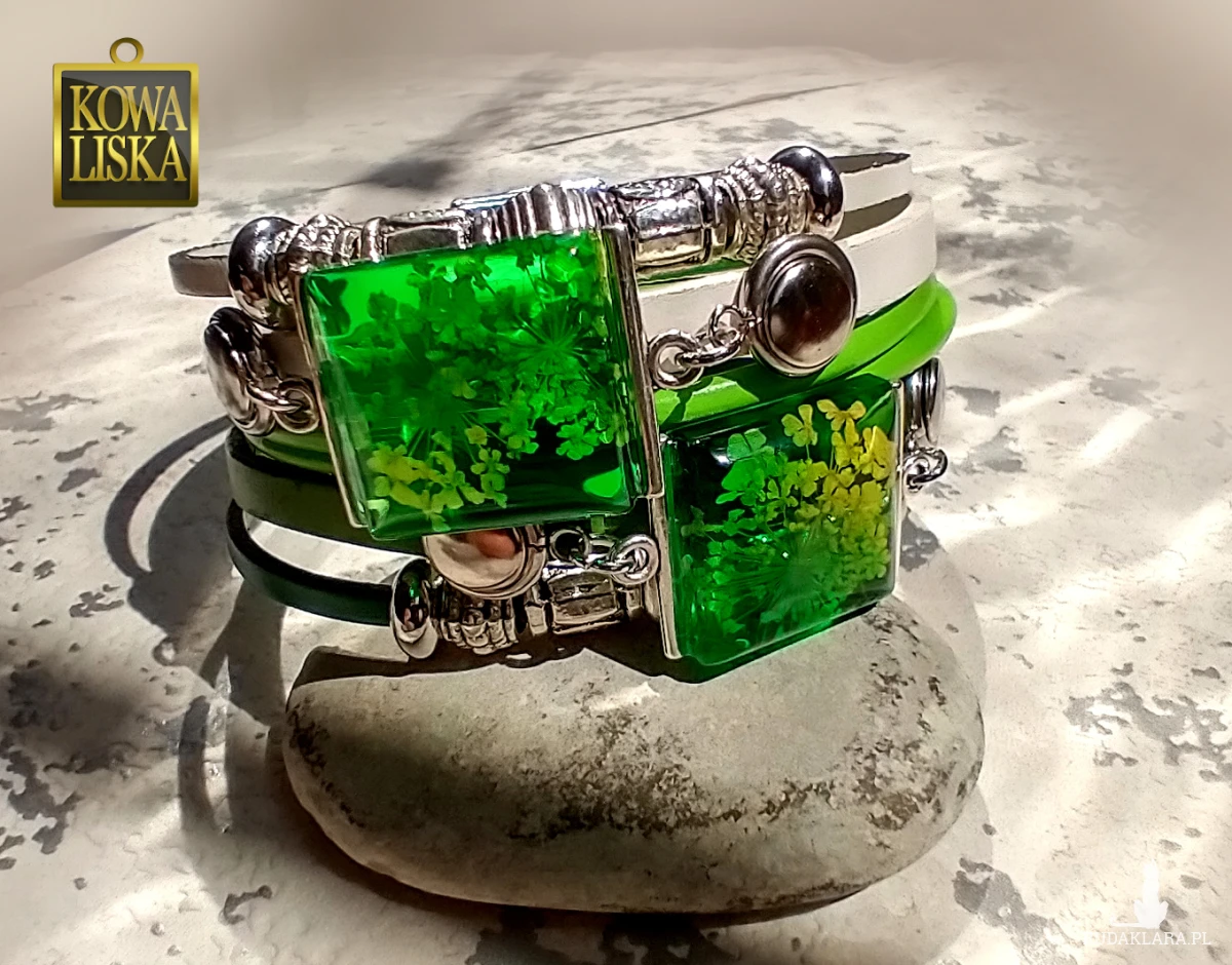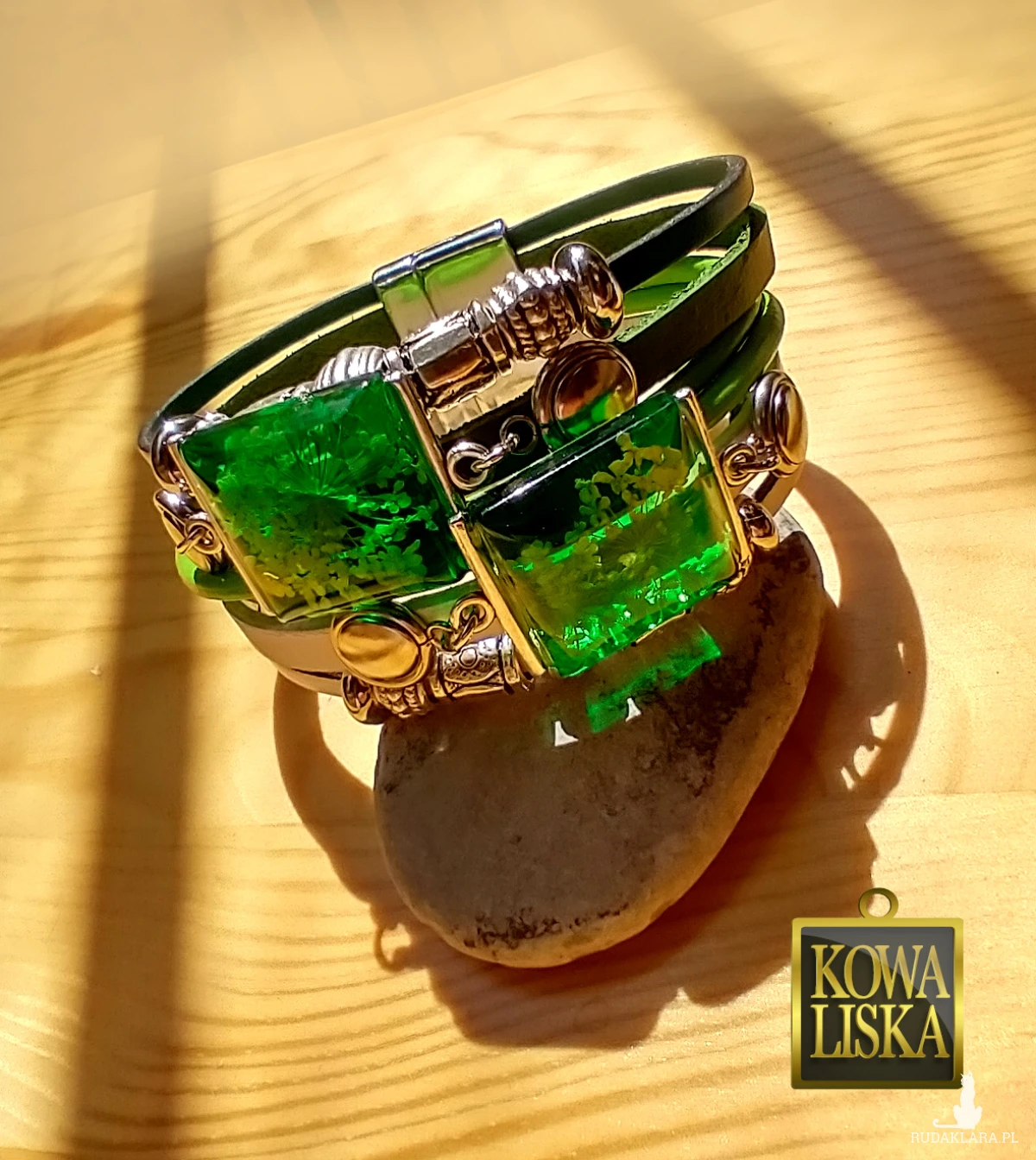 Efektowna, asymetryczna bransoleta, której centralnym elementem są zielone kwadraty z zatopionymi kwiatami, zamontowane na skórzanych pasach.