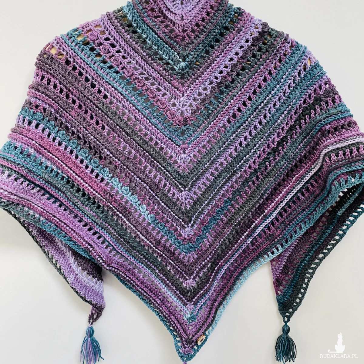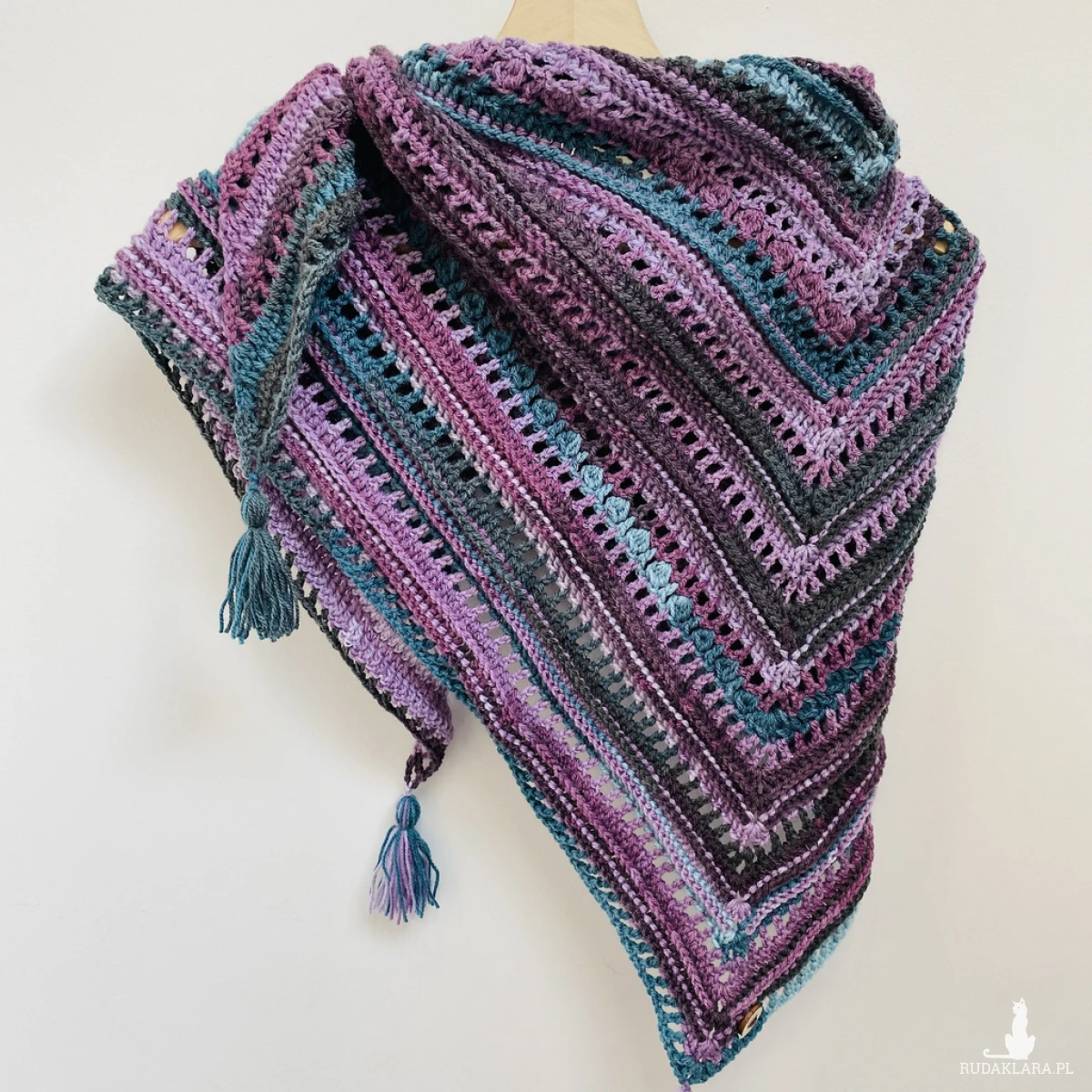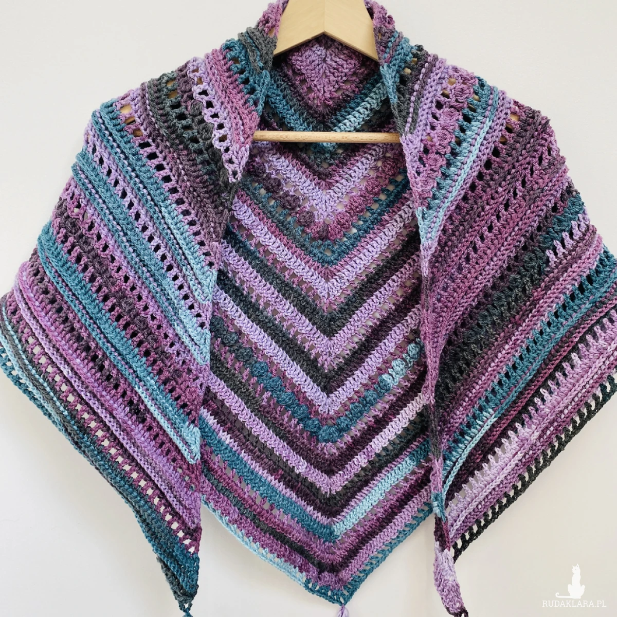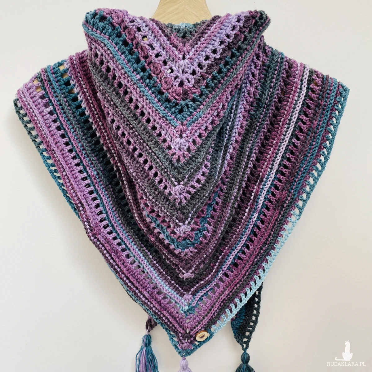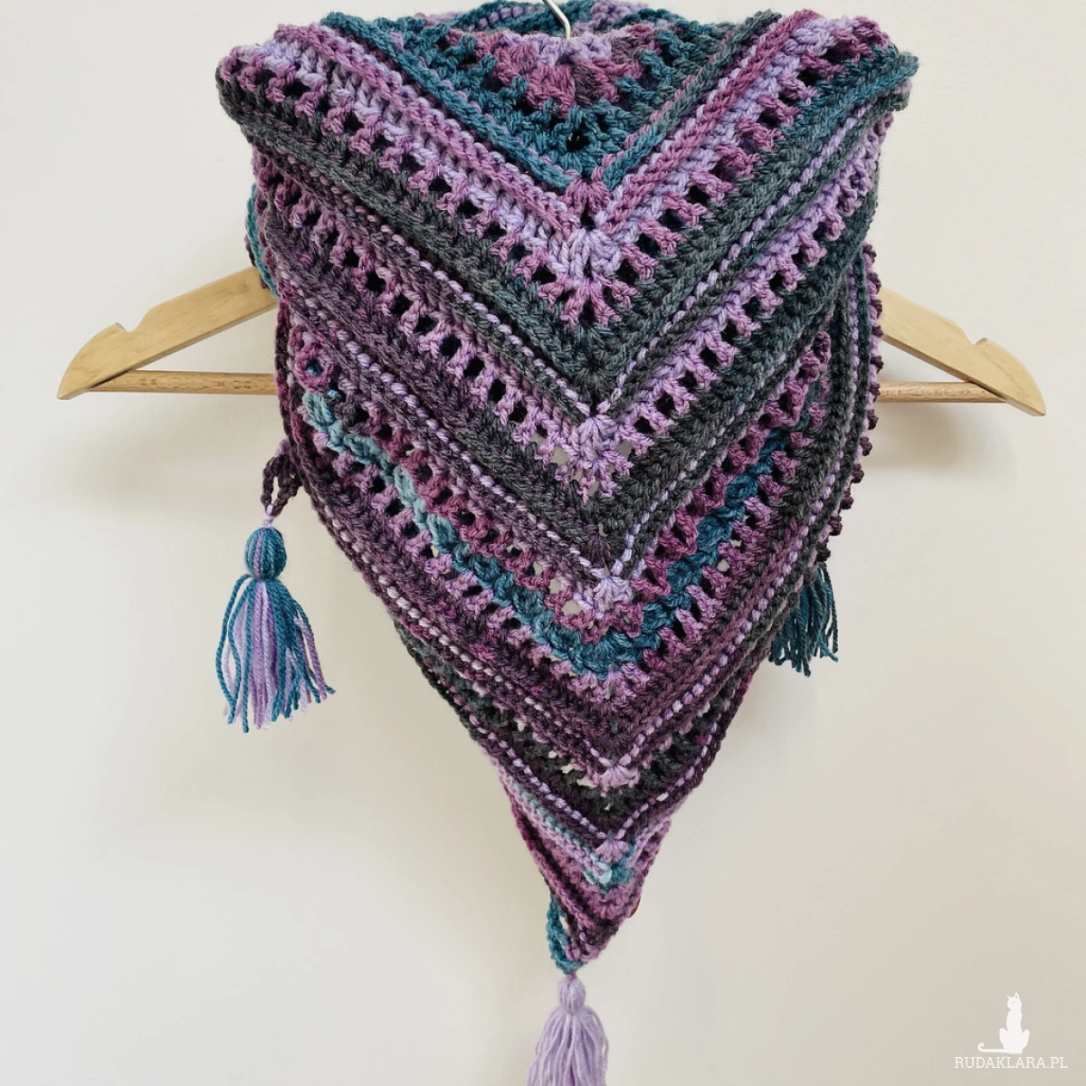 Chustę wykonałam na szydełku z miękkiej włóczki akrylowej, która zachwyca intensywnością koloru i delikatnością. Certyfikat OEKO-TEX® Standard 100 potwierdza, że jest bezpieczna dla a zdrowia materiały użyte do jej produkcji są wolne od szkodliwych substancji chemicznych.