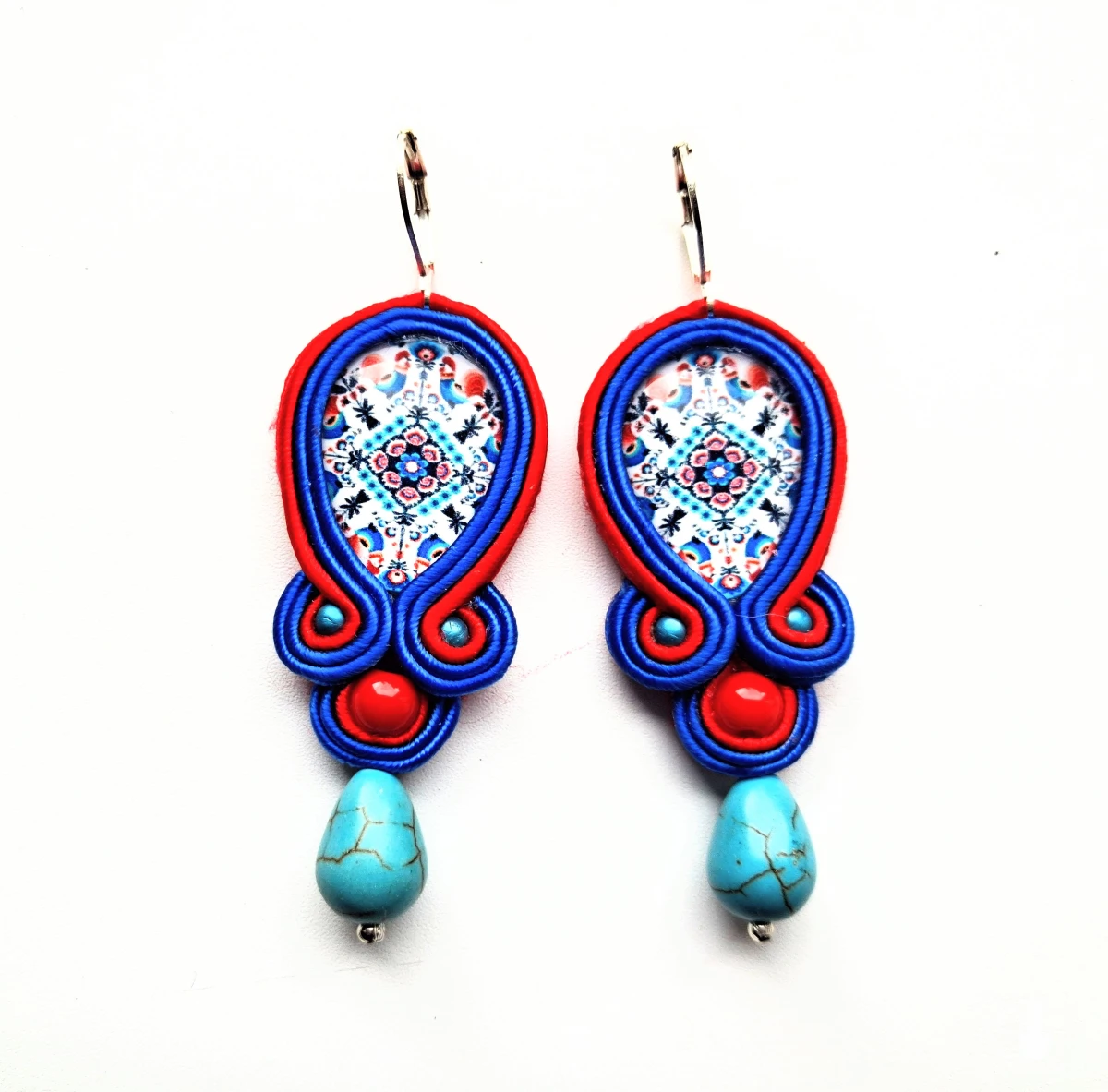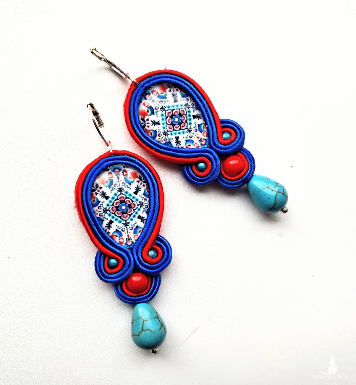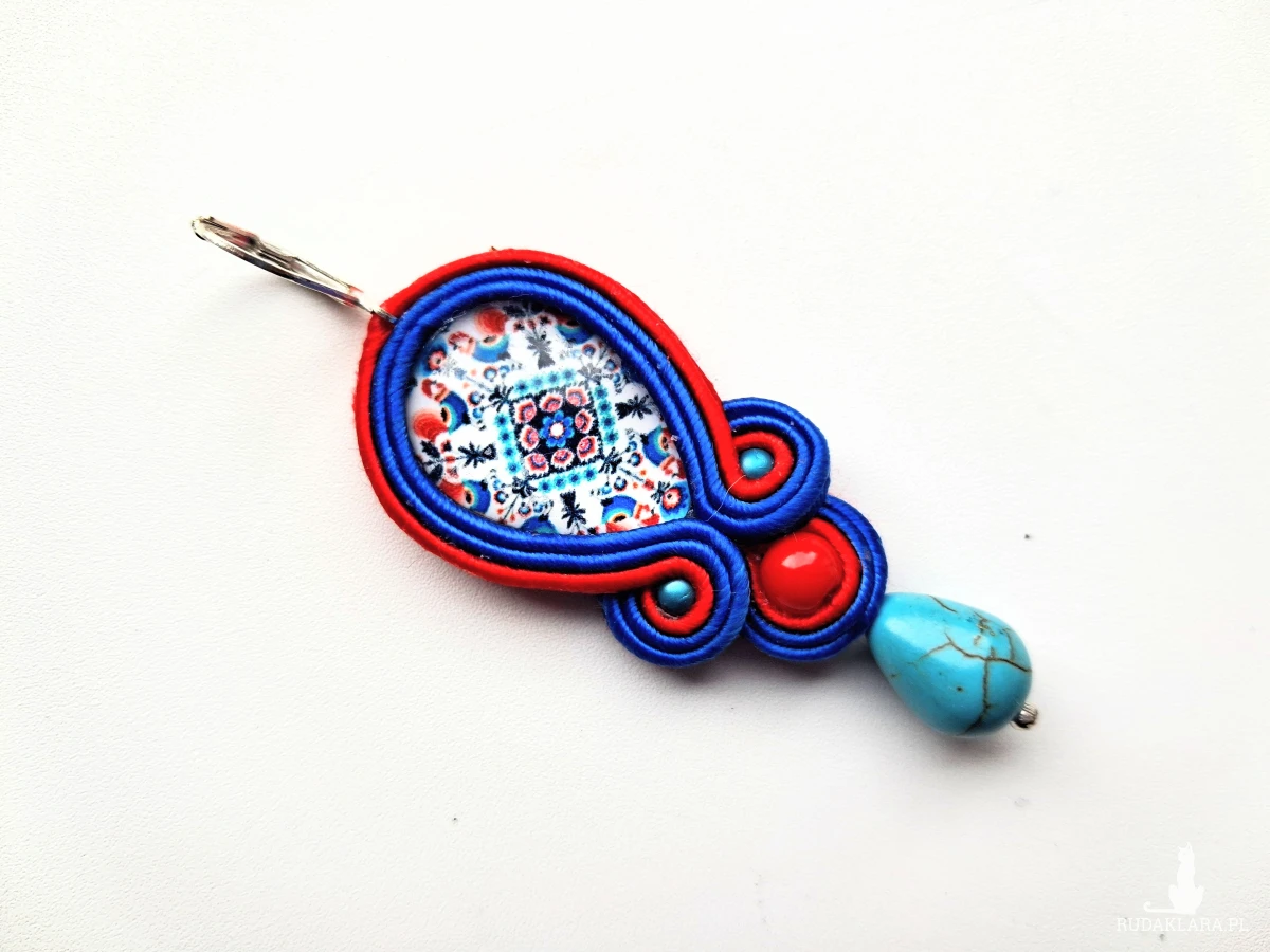 Materiał: turkusowy howlit, sutasz, koraliki szklane, kaboszon z wzorem tradycyjnej polskiej wycinanki
