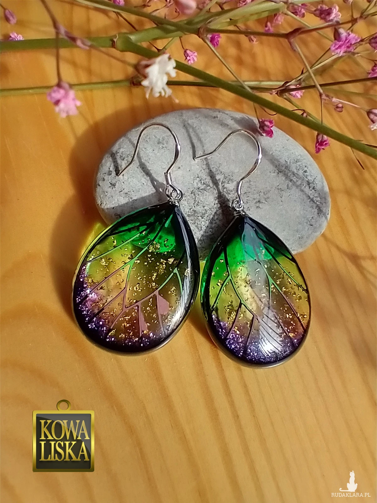 Lśniące fioletowo-zielonym blaskiem skrzydła motyla przepięknie podkreślą Twoją urodę, zarówno w ciepłe, słoneczne dni, jak i podczas wieczornego wyjścia. Złote żyłowania mienią się w słońcu... Skuś się...