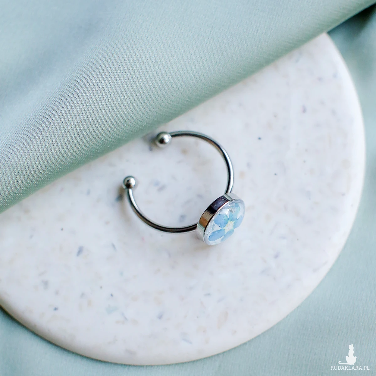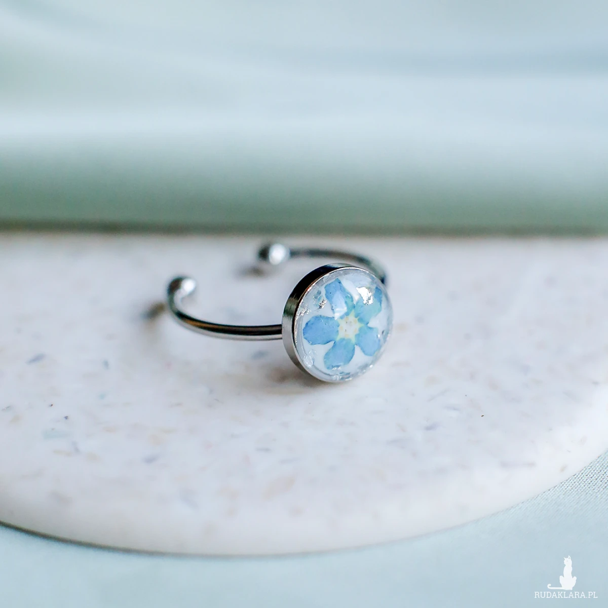 Pierścionek wykonany jest z żywicy epoksydowej z wykorzystaniem suszonych kwiatów. Metalowe elementy to stal nierdzewna szlachetna chirurgiczna.