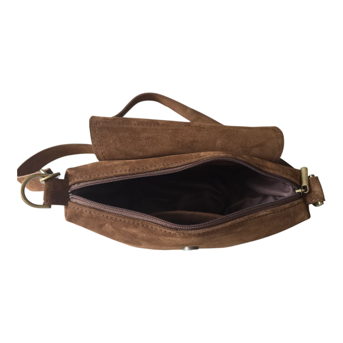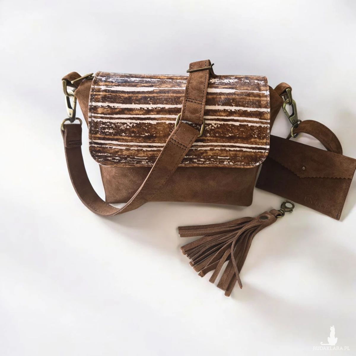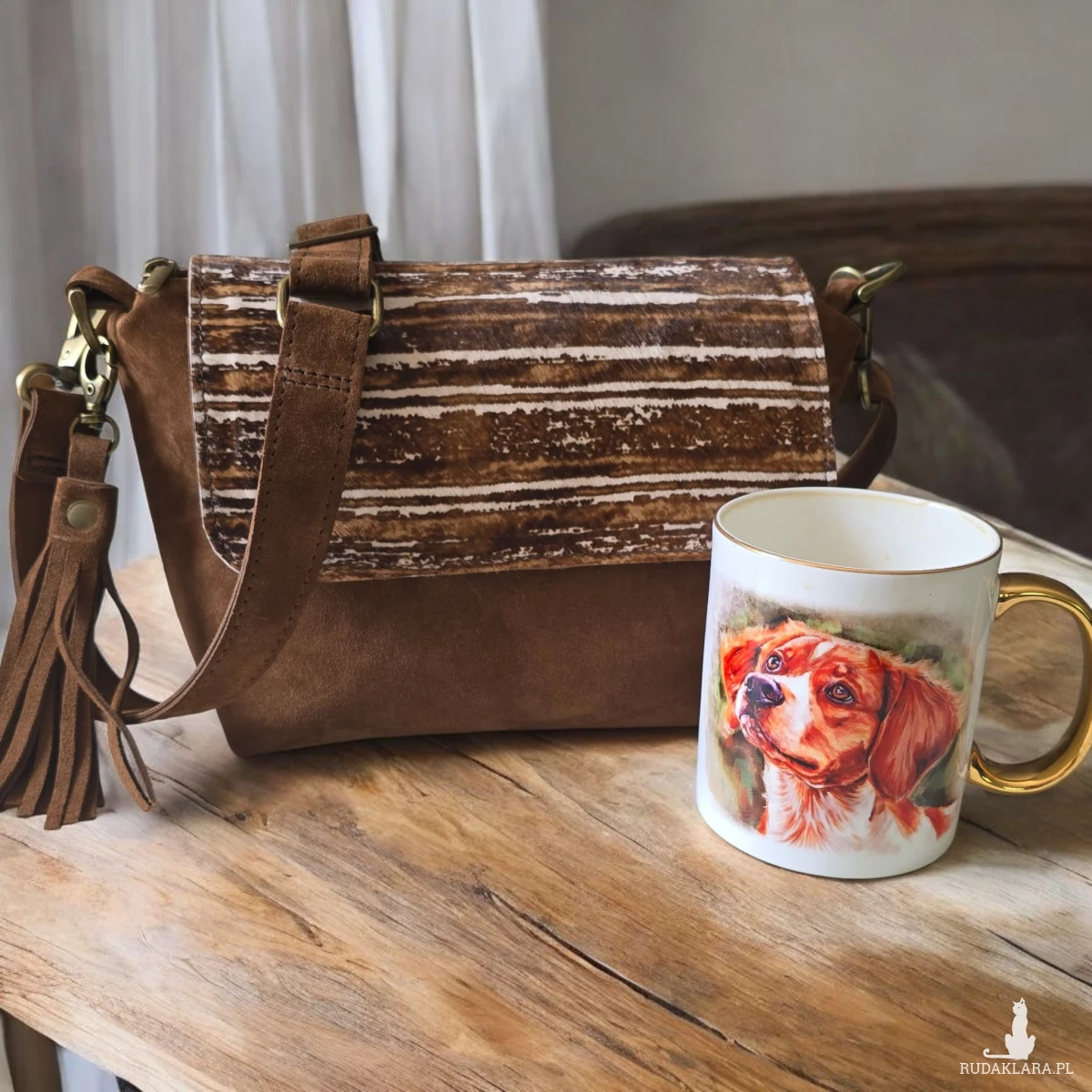Uszyta z naturalnej skóry zamszowej w kolorze tobacco. Wyjątkowości dodaje klapka wykończona skórą z delikatnym włosem.