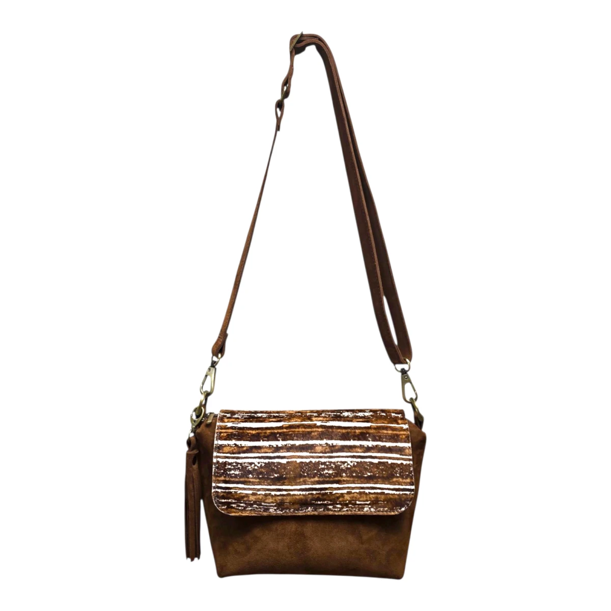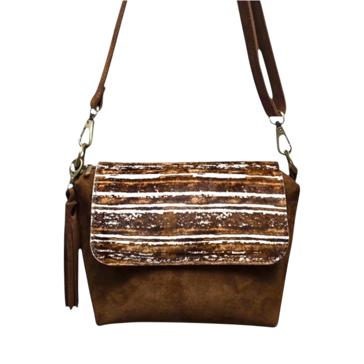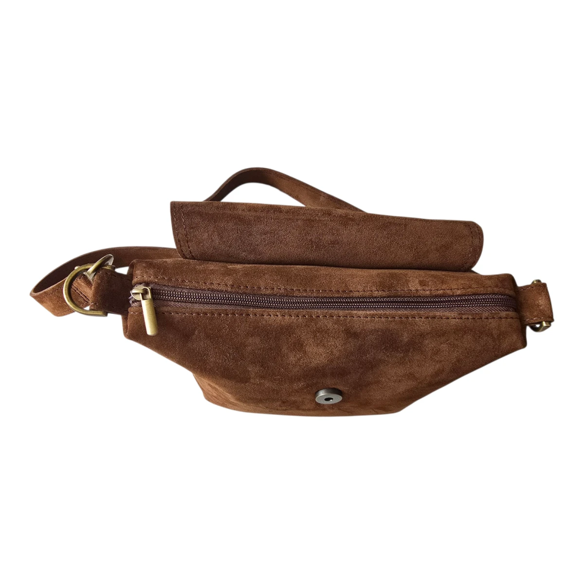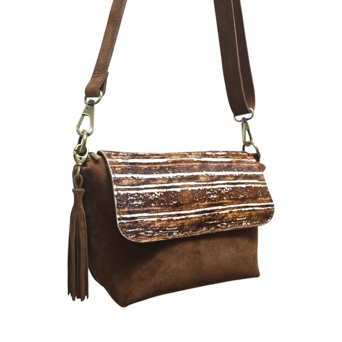 Uszyta z naturalnej skóry zamszowej w kolorze tobacco. Wyjątkowości dodaje klapka wykończona skórą z delikatnym włosem.