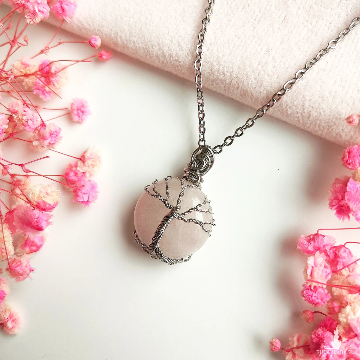 Naszyjnik Drzewo Życia z Kwarcem Różowym – stal chirurgiczna, wire wrapping, ręcznie wykonana biżuteria z naturalnym kamieniem