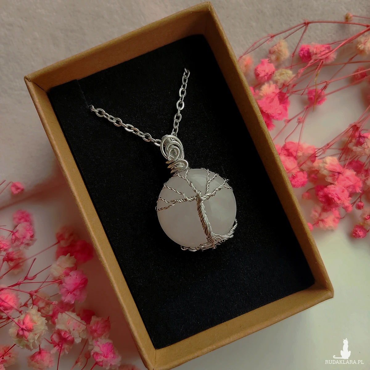 Naszyjnik Drzewo Życia - Kwarc Różowy zapakowany w pudełko z logo.