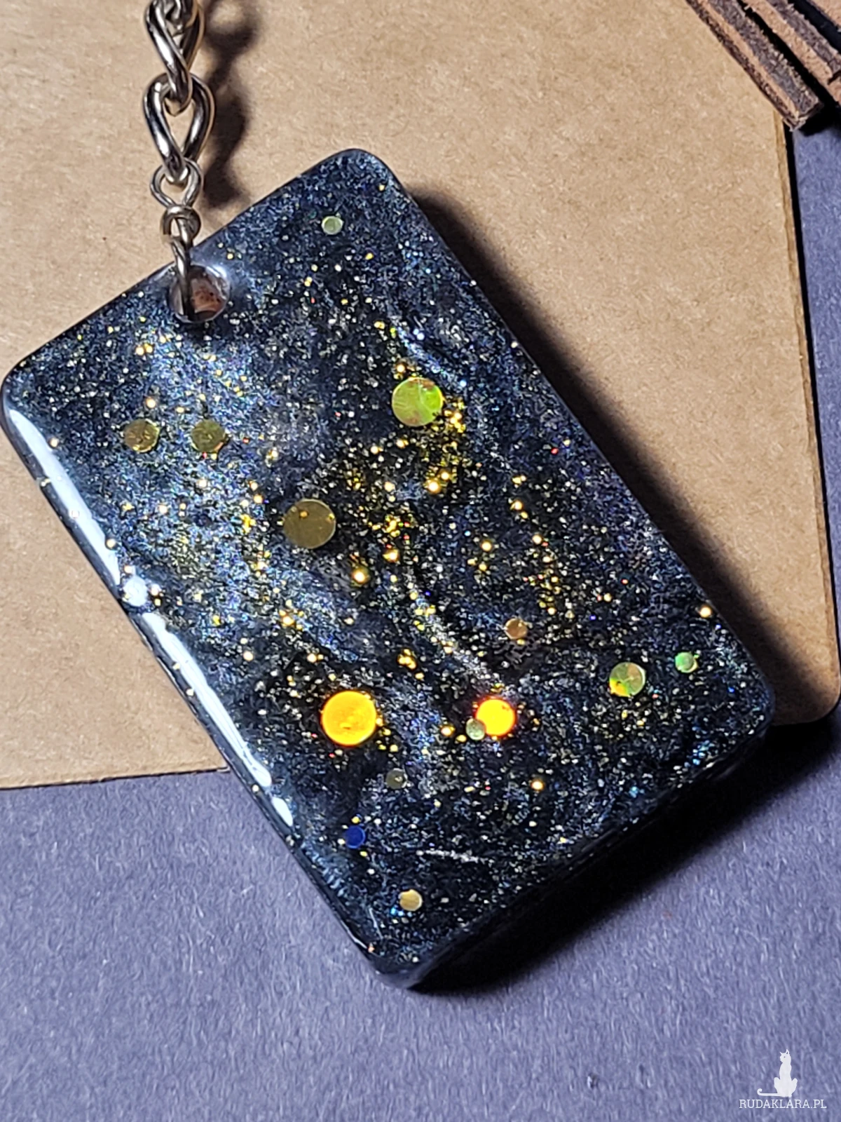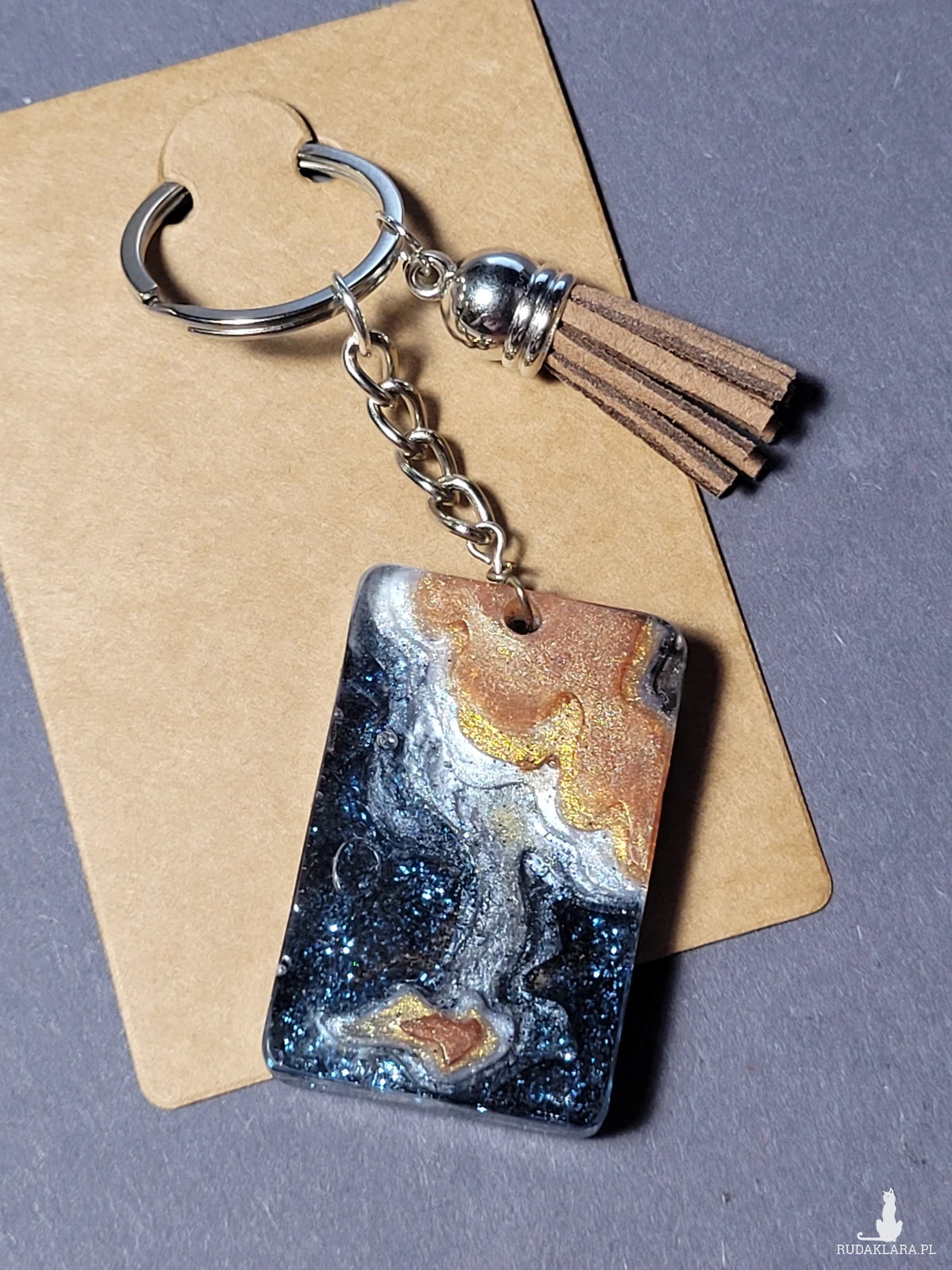 • Brelok zawieszka Wyspa czarno-brązowy to unikatowy stylowy dodatek do kluczy lub torebki. Jego element główny jest własnoręcznie zrobiony z żywicy epoksydowej z dodaniem pyłków różnych odcieni na rożnych etapach pracy dla odzyskania efektu warsw i głęmbi. Prostokątny kształt i ciemne kolory dodają breloku poważnego, powściągliwego charakteru, a designerski styl sprawia, że wyróżnia się spośród innych akcesoriów. Idealny dla miłośników oryginalnych i nietypowych dodatków.