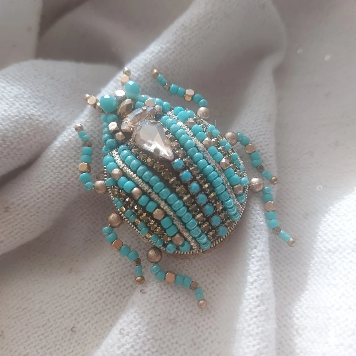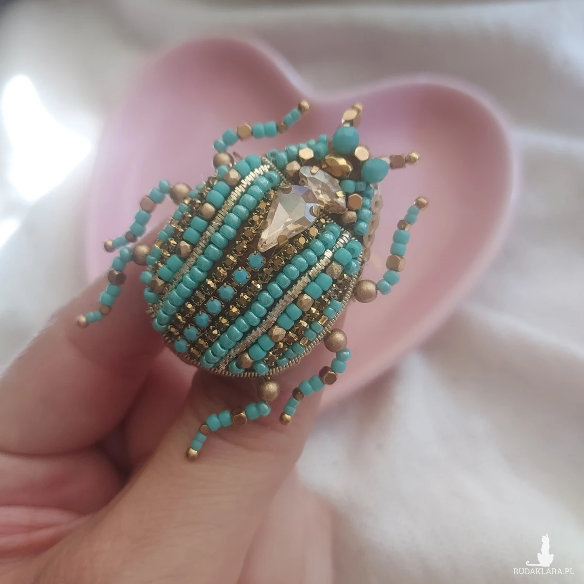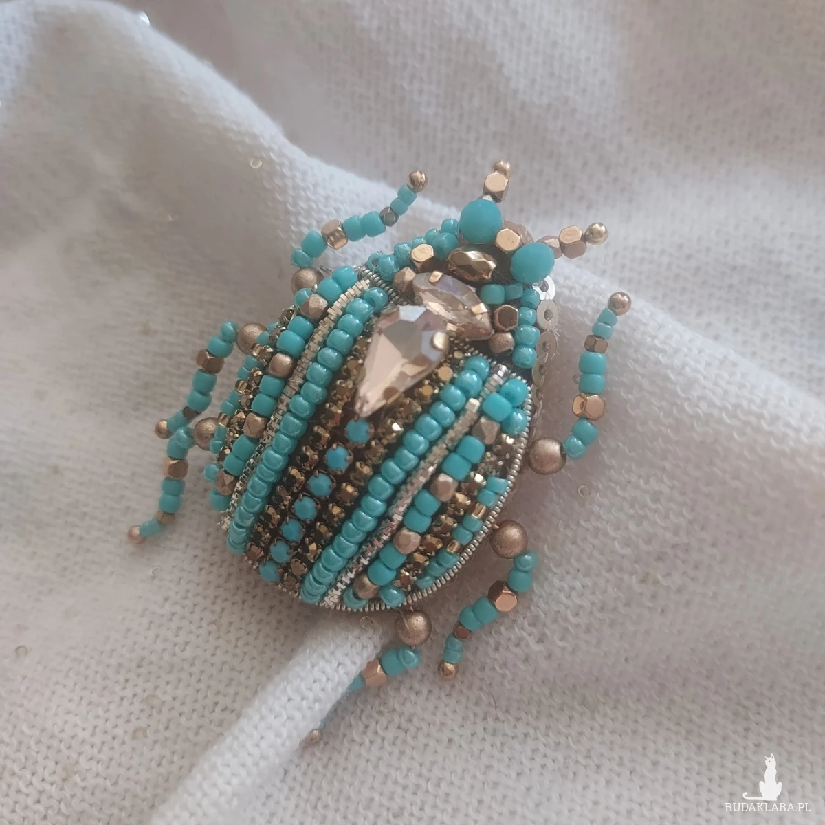 Broszka SKARABEUSZ w uroczym turkusowo-złotym kolorze dla miłośniczek turkusu, złota, owadów oraz natury.