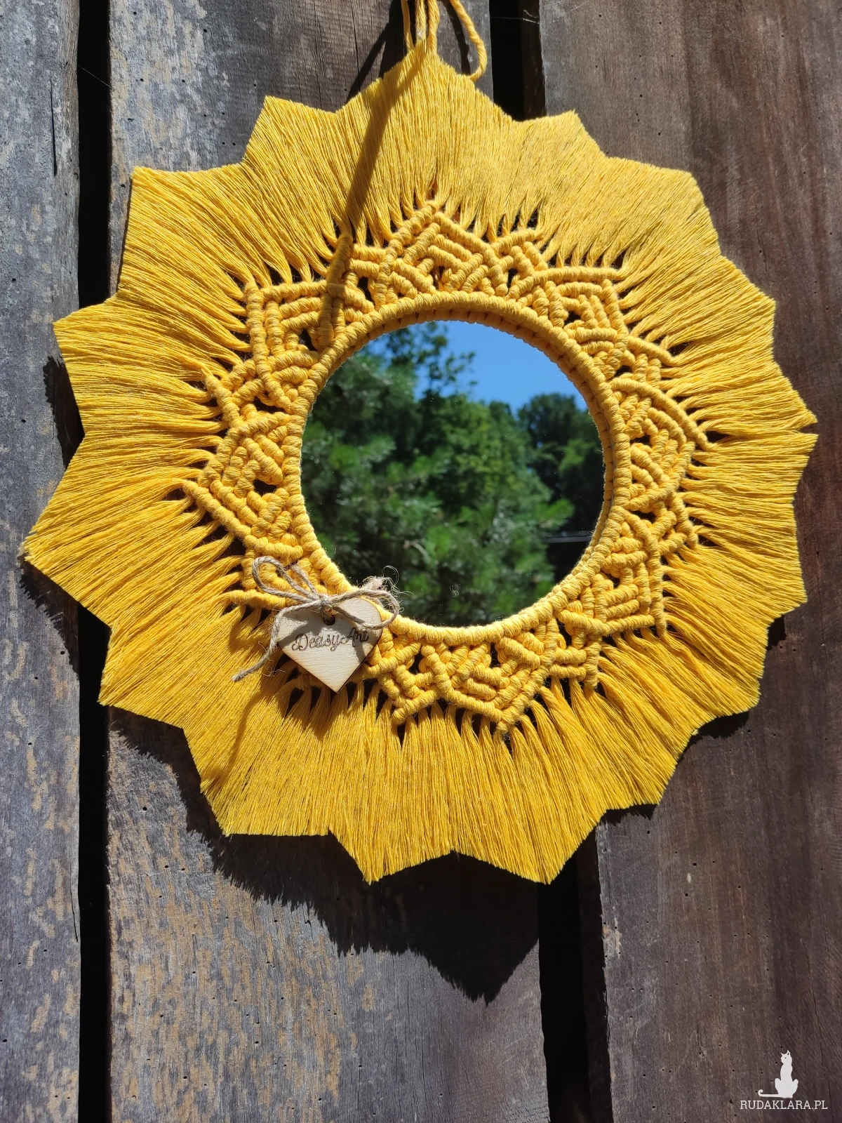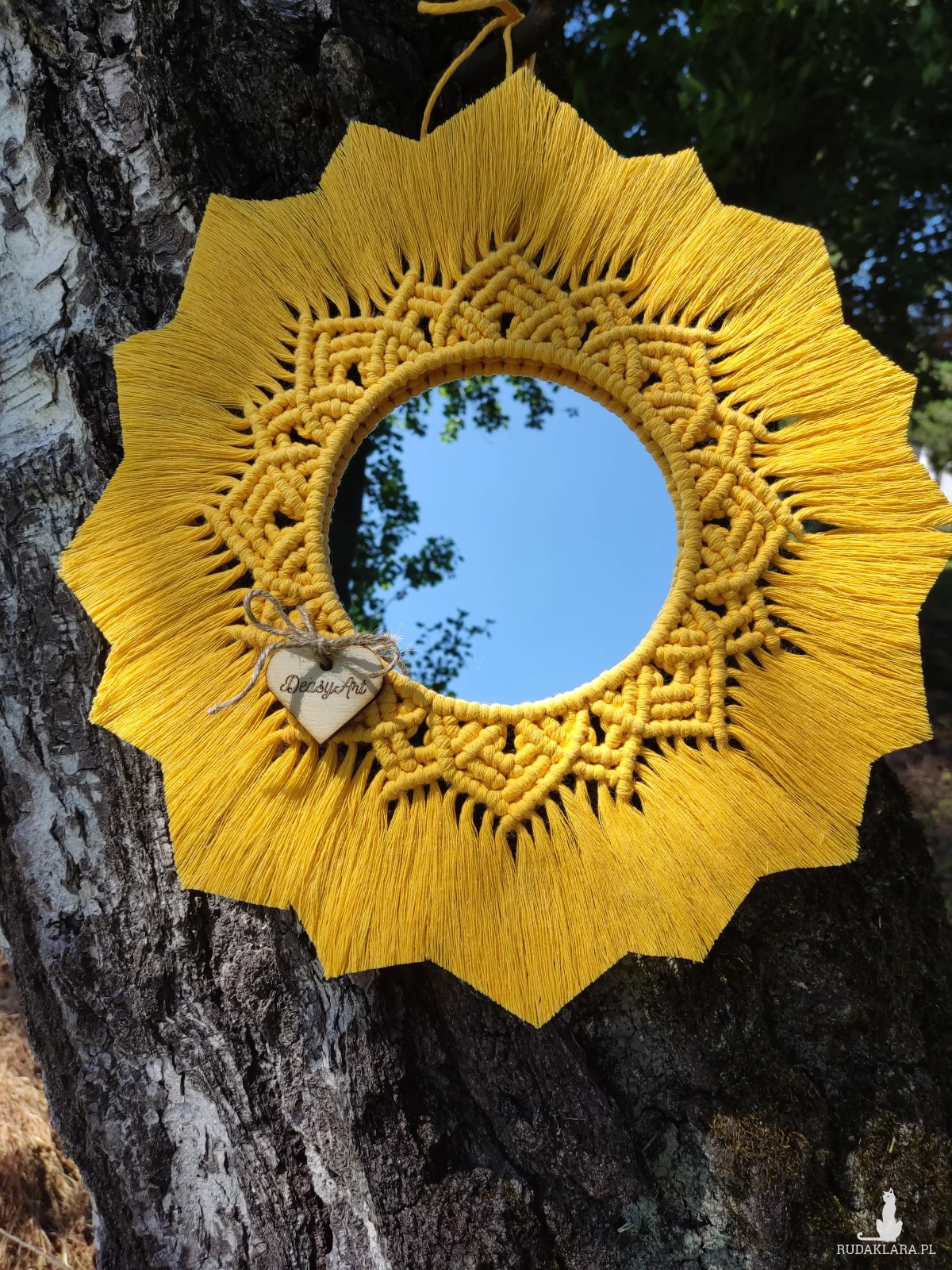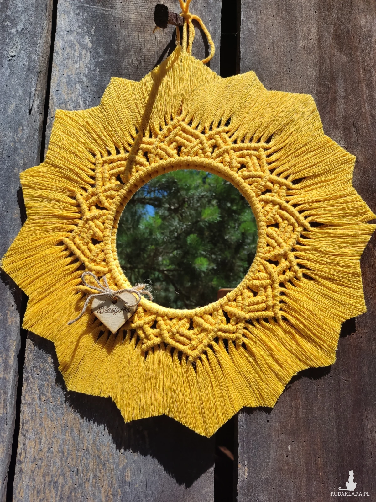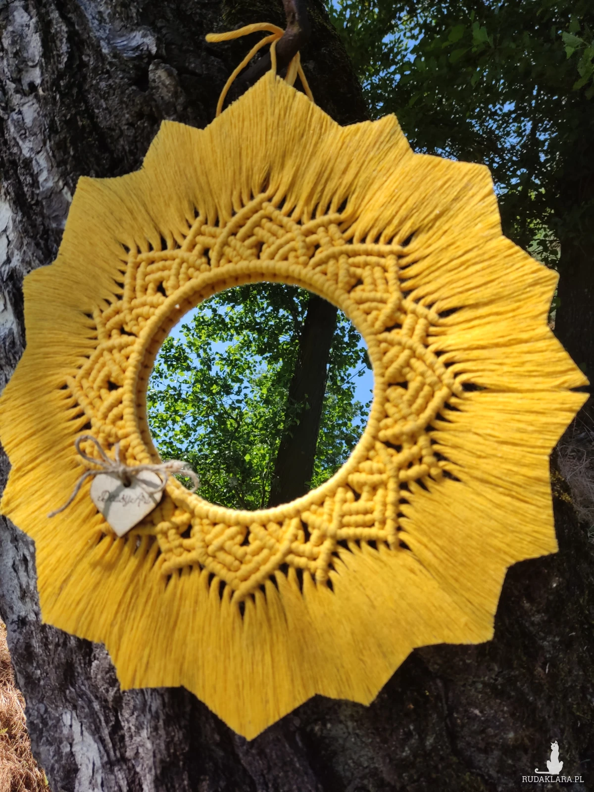 Sprzedam nową, ręcznie wykonaną mandalę z lusterkiem, całkowita średnica wynosi 35 cm (średnica lusterka 15 cm). Mandala została wypleciona ze sznurka skręcanego sznurka 3 mm w w kolorze żółtym.