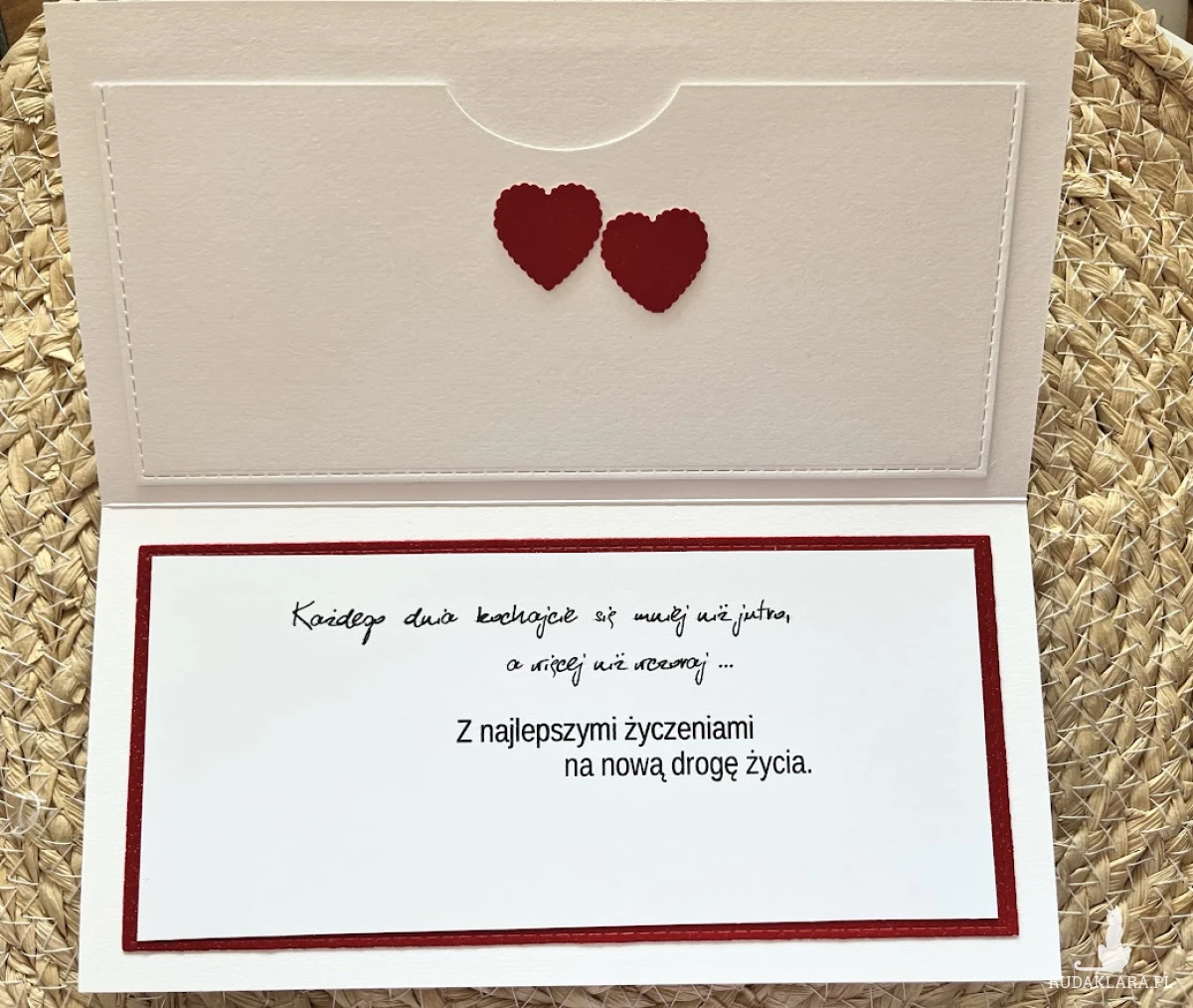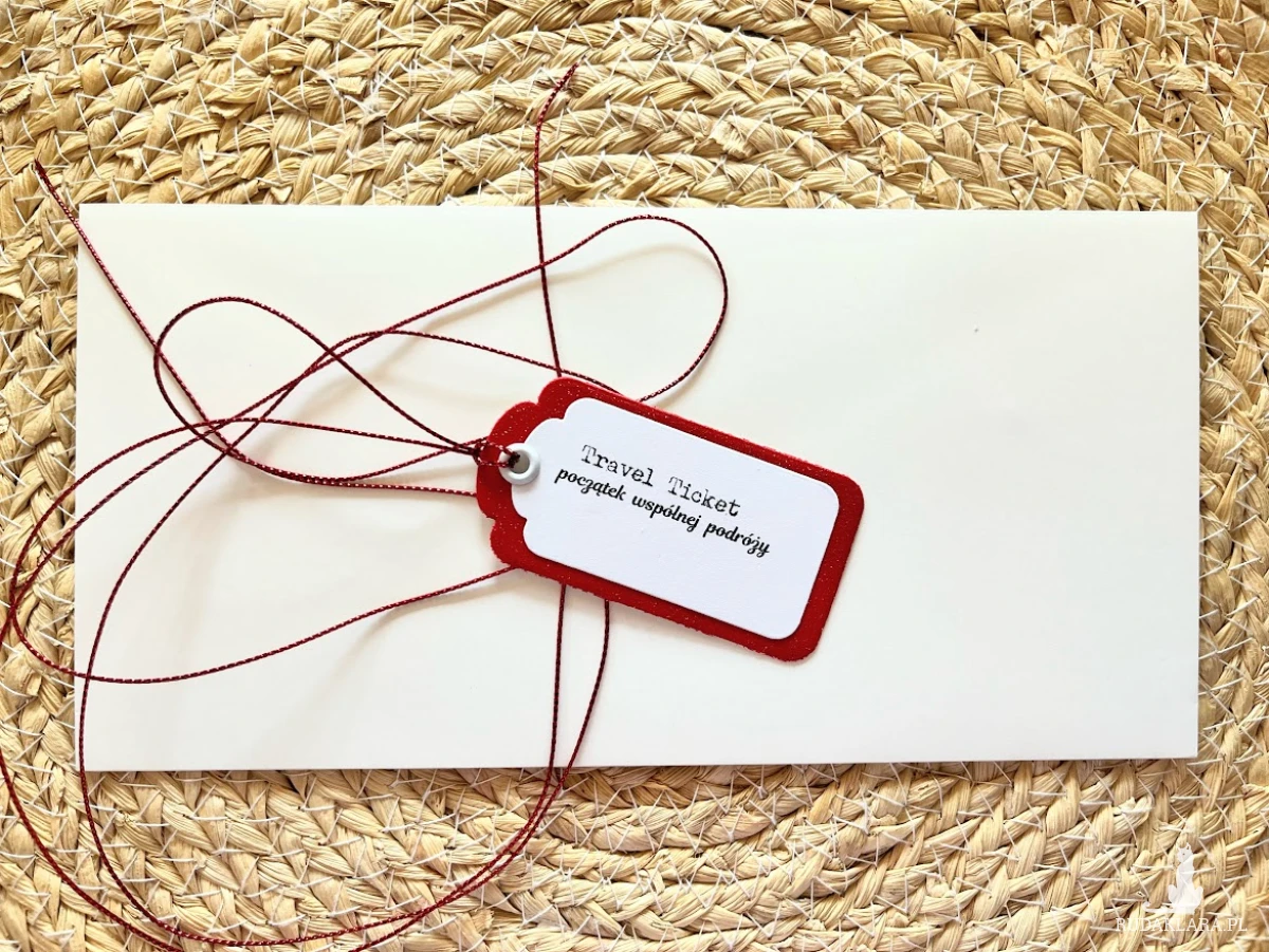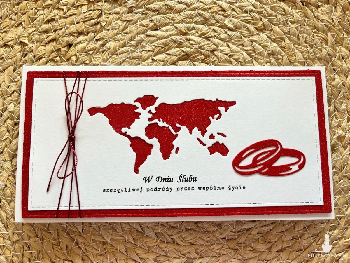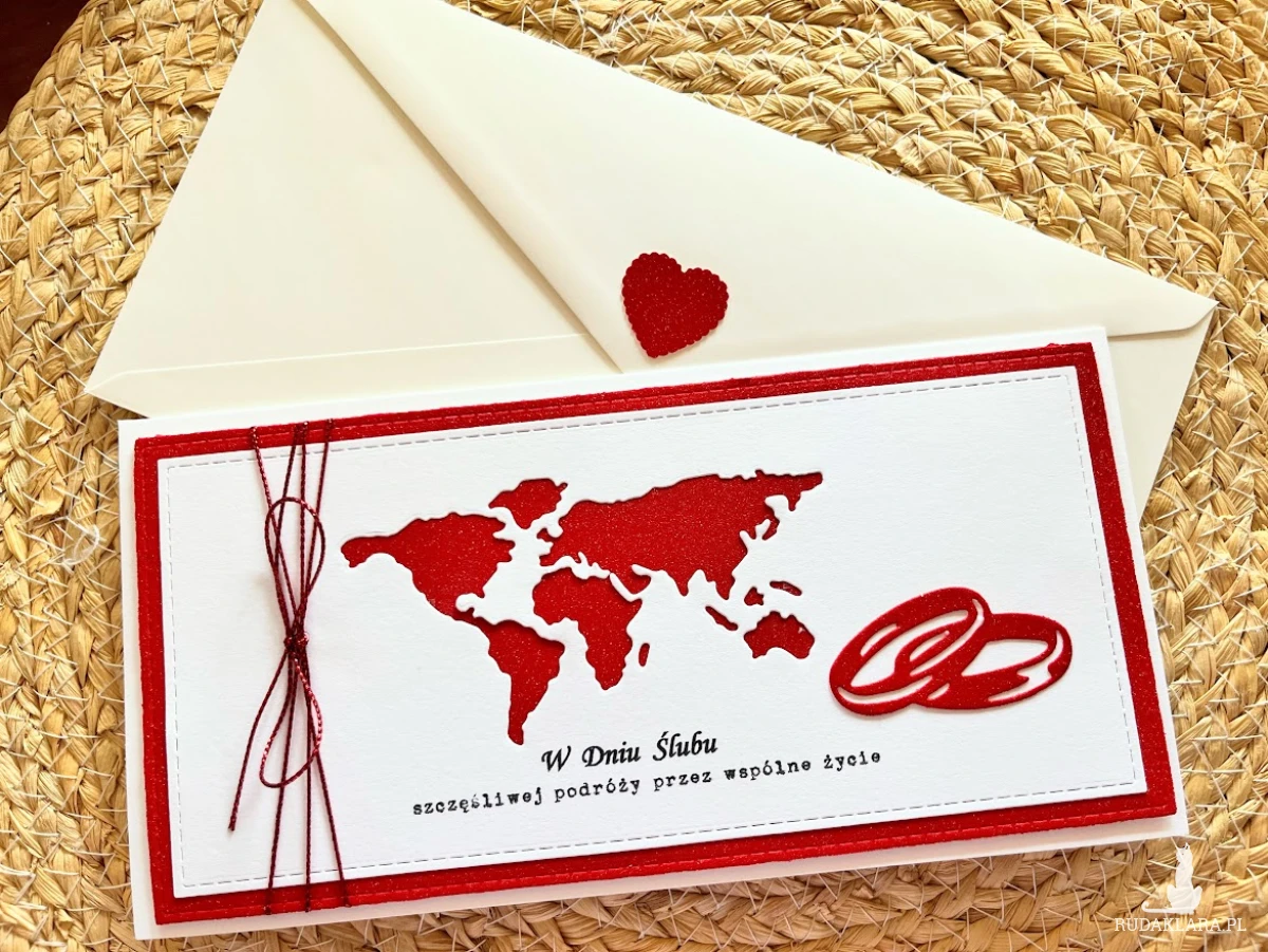 Kartka z okazji Ślubu do koperty dla Młodej Pary , która kocha podróże i wybiera się w szczęśliwą podróż przez wspólne życie. Komplet stworzony na bazie papieru białego z dodatkiem czerwieni. Kartka ma wymiary 10,5 x 21,0 , Całość obwiązana czerwonym sznurkiem z tagiem - biletem .W środku kartki znajdują się gotowe życzenia do własnoręcznego podpisu oraz kieszonka na małe co nieco lub kupon lotto. W tej postaci produkt dostępny od ręki .Zapraszam