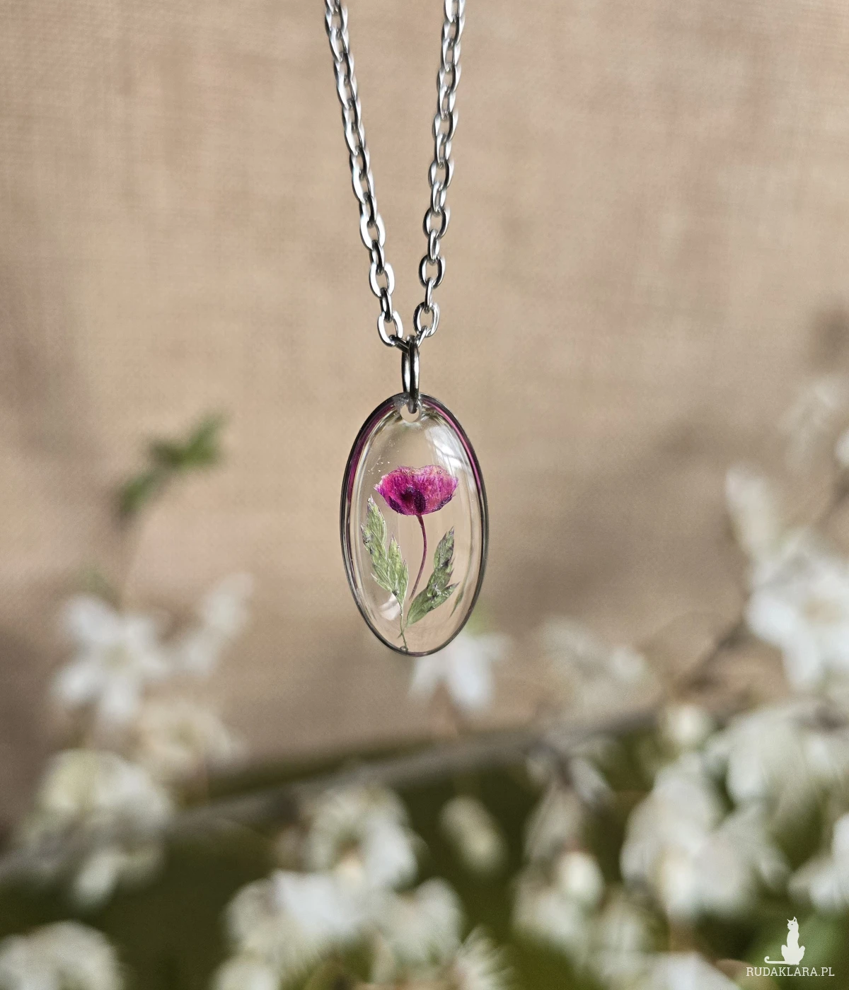 Oferuję Państwu unikalną biżuterię. Zawieszka jest wykonana z suszonych kwiatów i żywicy epoksydowej. Biżuteria jest wspaniałym i oryginalnym prezentem na lata.