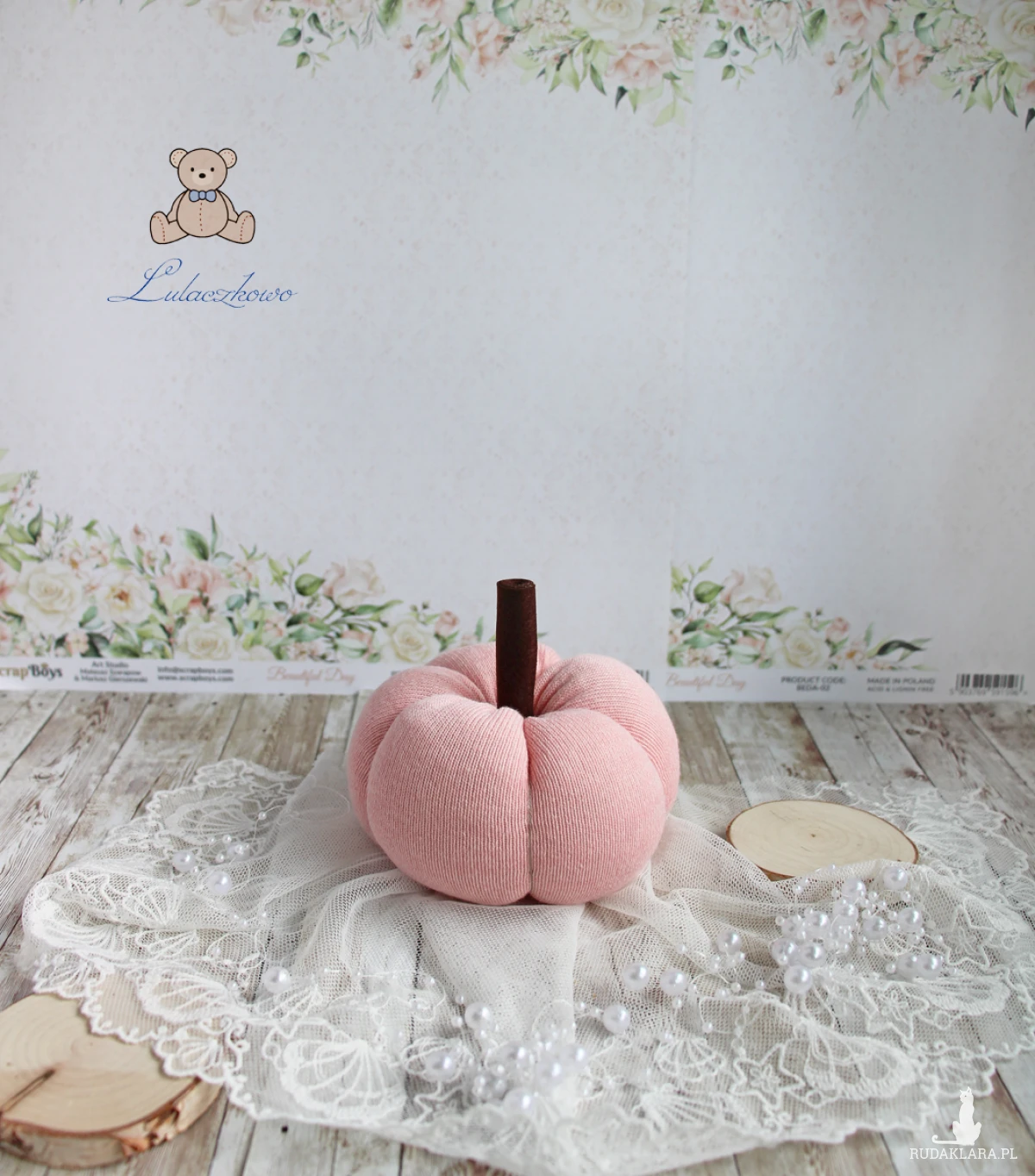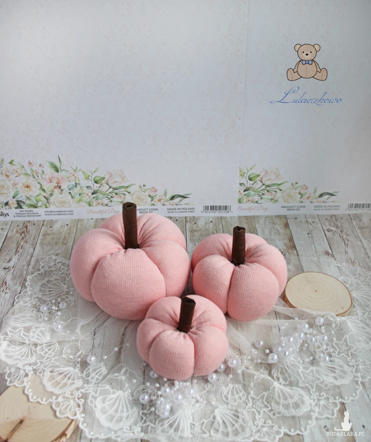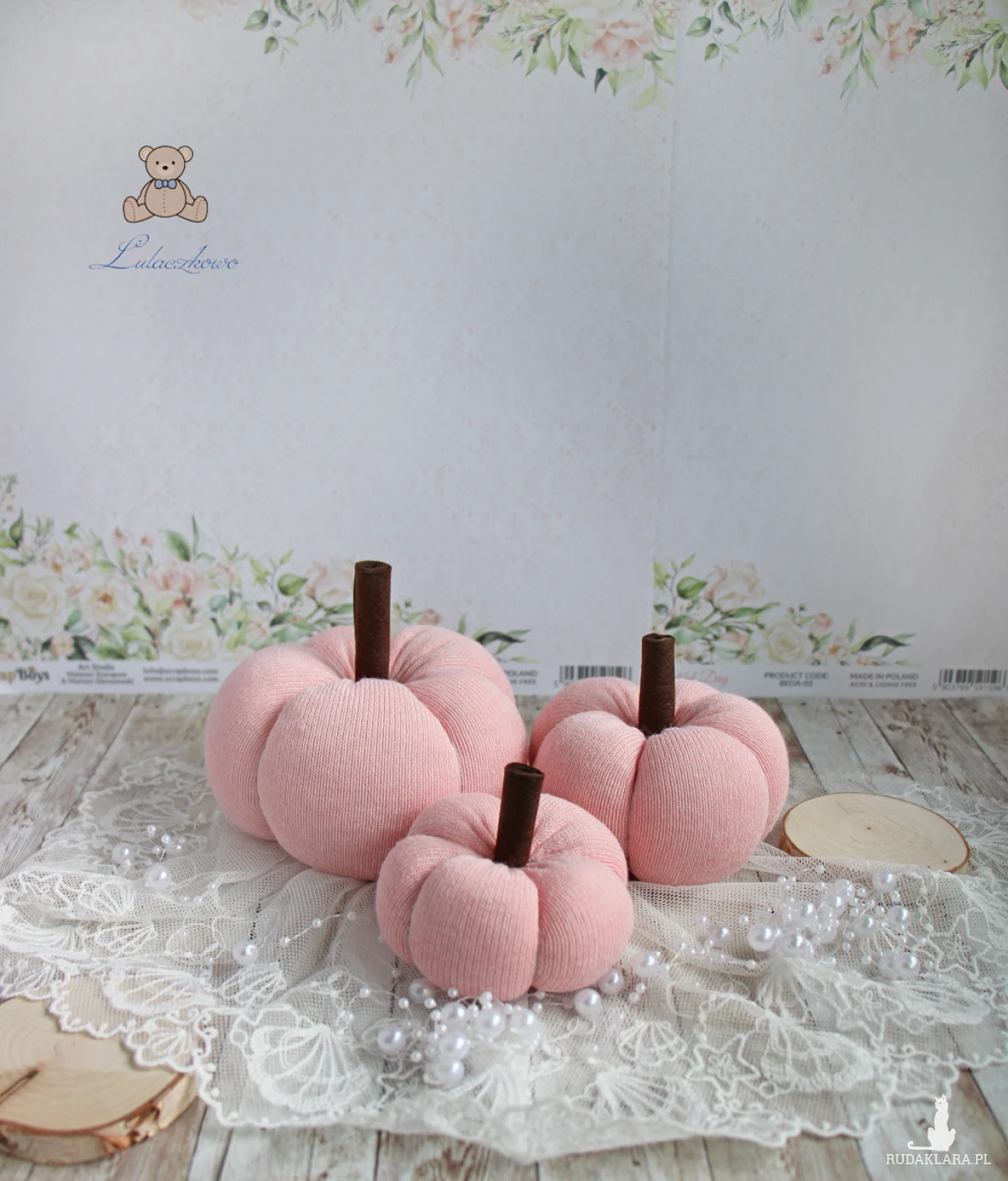 Komplet 3 sztuk pięknych dekoracyjnych dyń uszytych ręcznie, z dbałością o każdy detal. Każda z dyń jest uszyta z mięciutkiej, sweterkowej dzianiny w kolorze różowym.