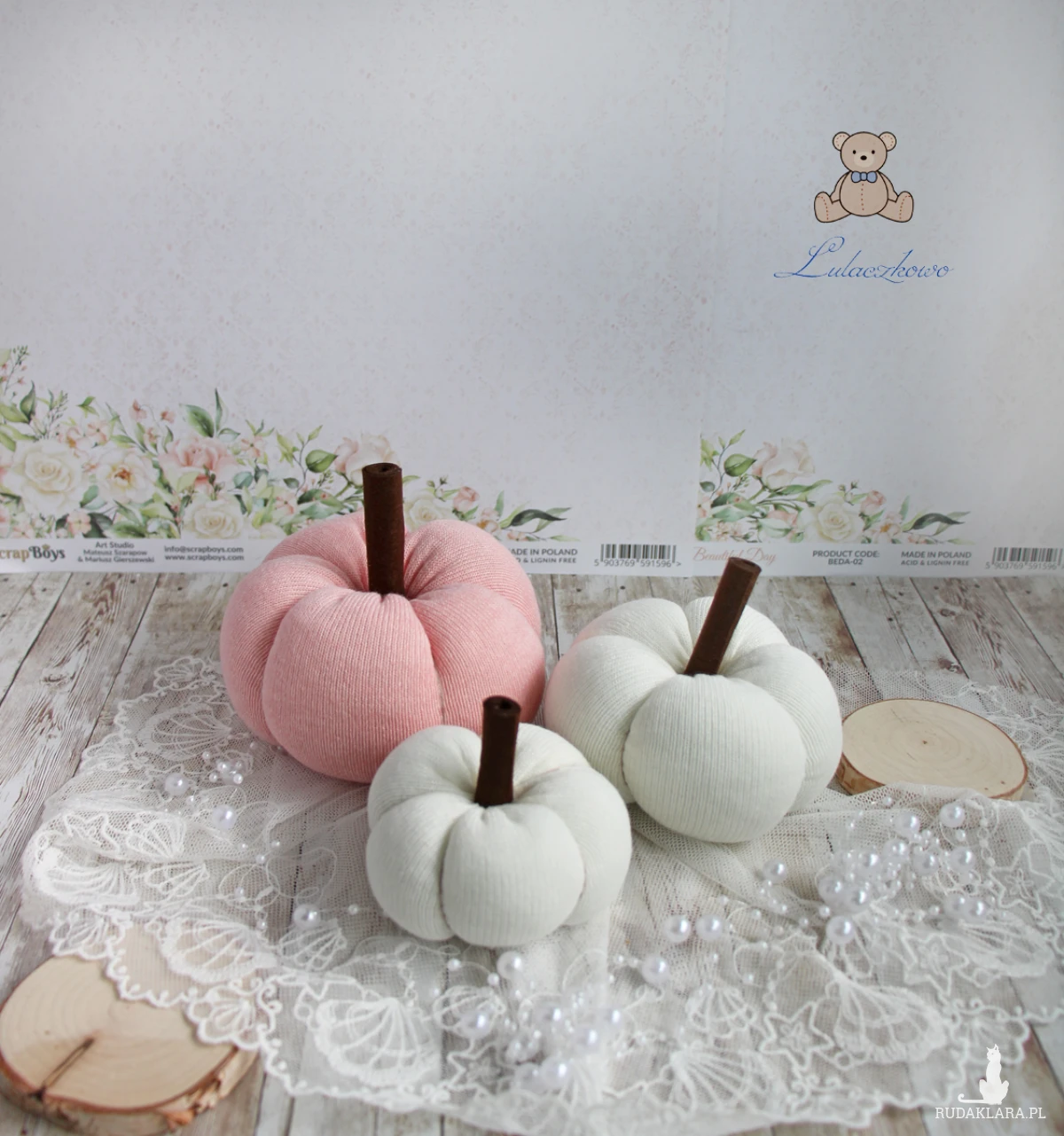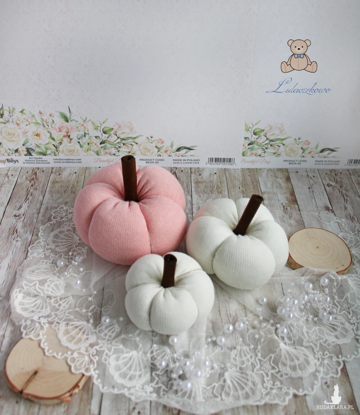 Komplet 3 sztuk pięknych dekoracyjnych dyń uszytych ręcznie, z dbałością o każdy detal. Każda z dyń jest uszyta z mięciutkiej, sweterkowej dzianiny w kolorze białym oraz różowym.