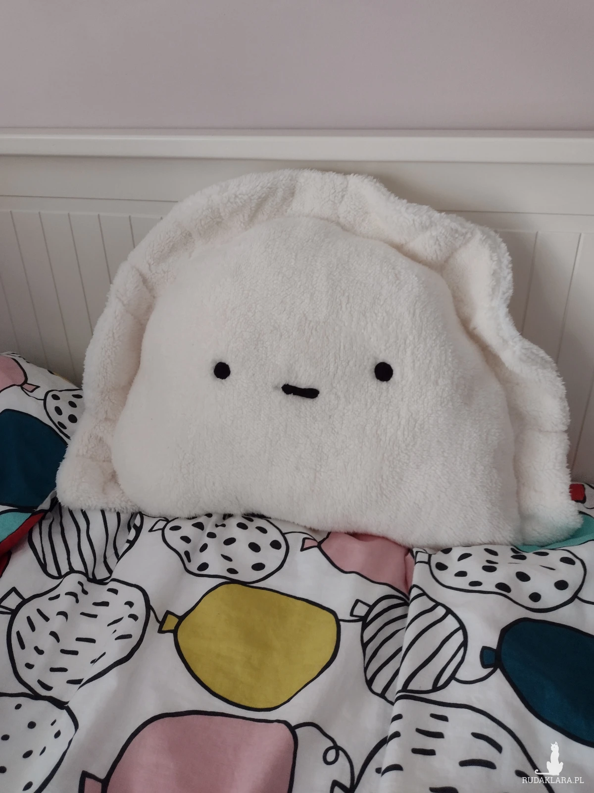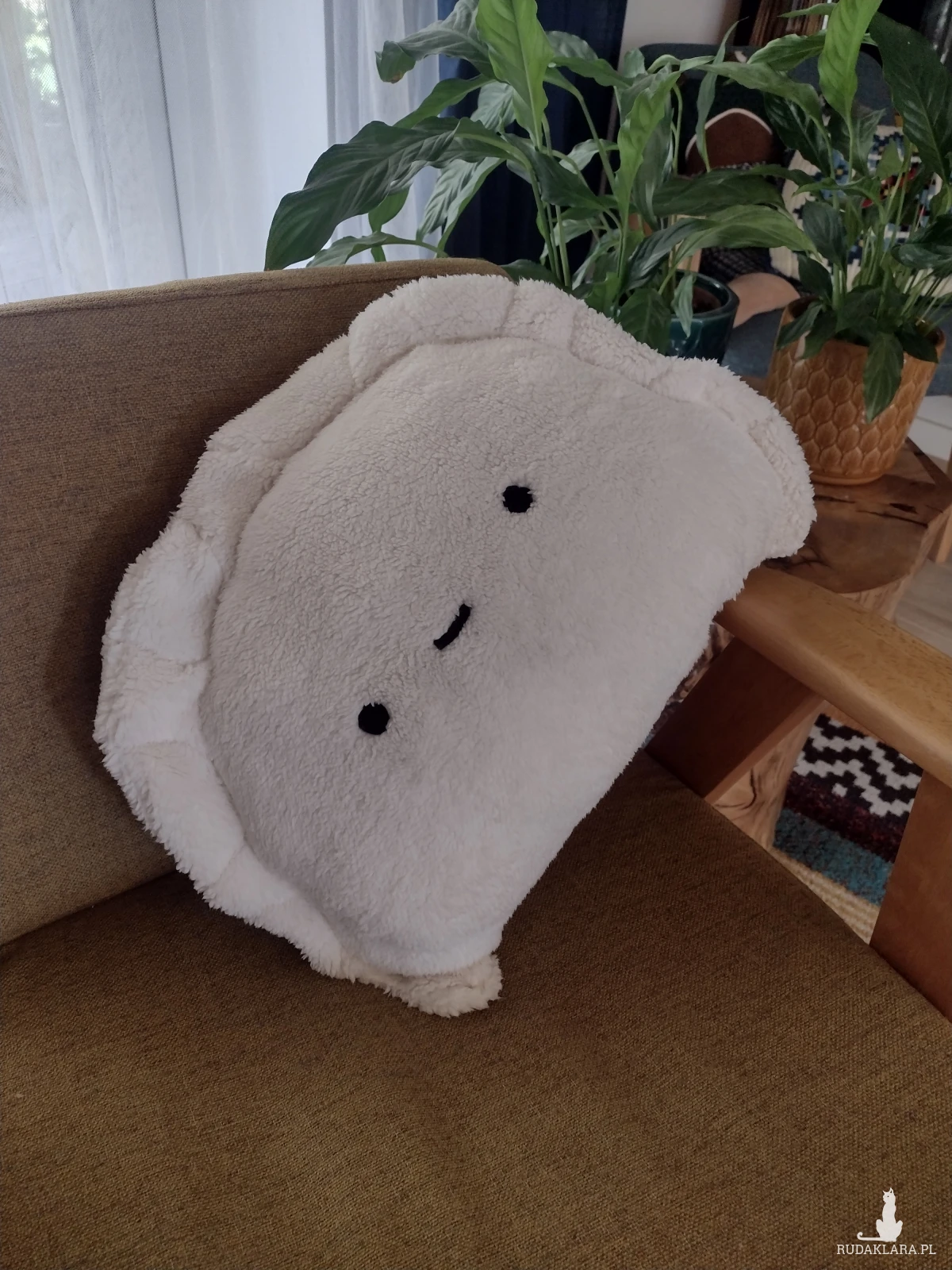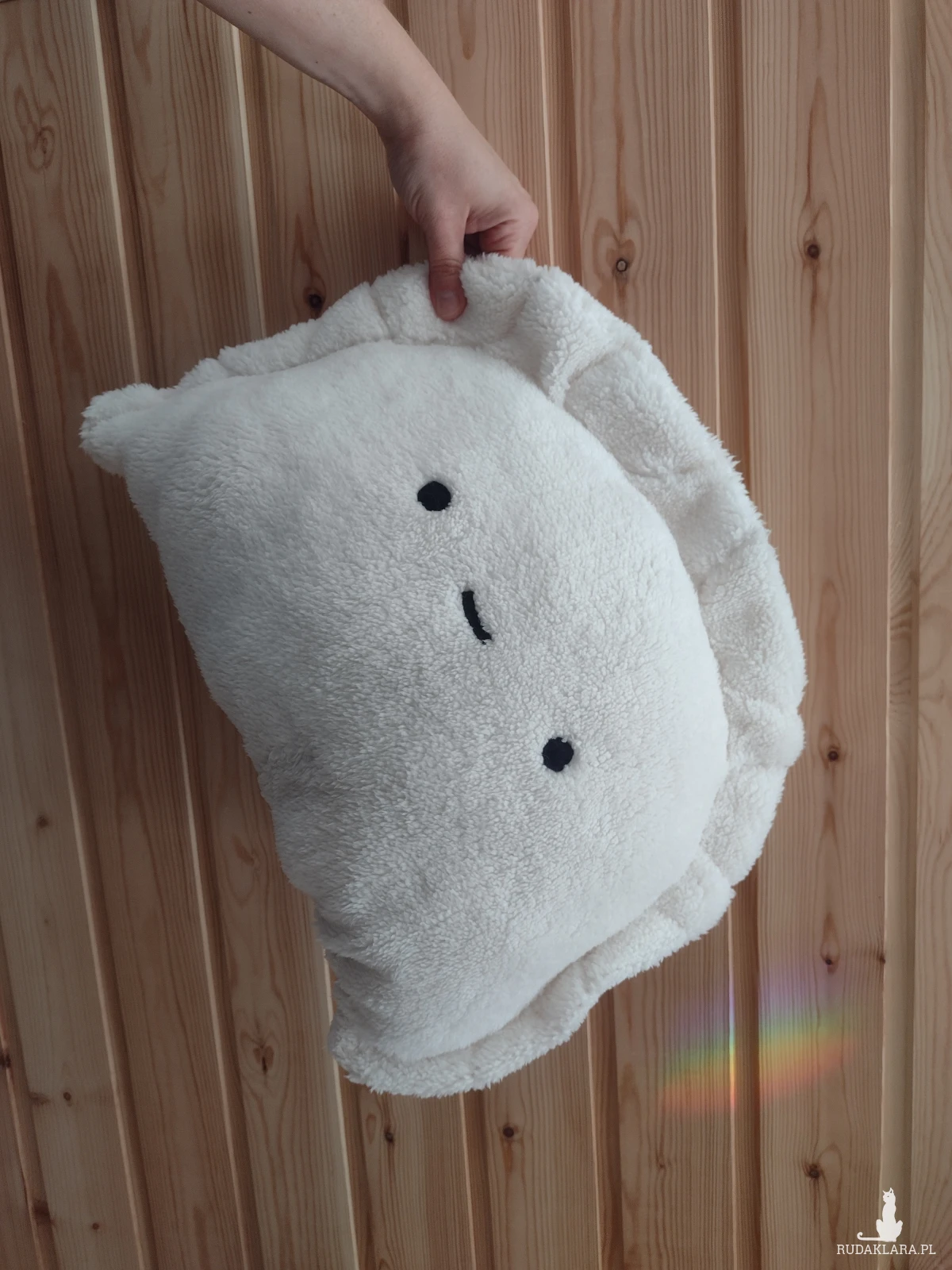 Pluszowy pieróg, duża poduszka pieroguszka, pierożek do kochania i tulenia. Świetny jako dekoracja nie tylko do pokoju dziecka. Uszyty z miękkiego niczym chmurka polaru Sherpa, wypełniony antyalergicznym puchem silikonowym. Oczy i buzia wykonane z naturalnego filcu.