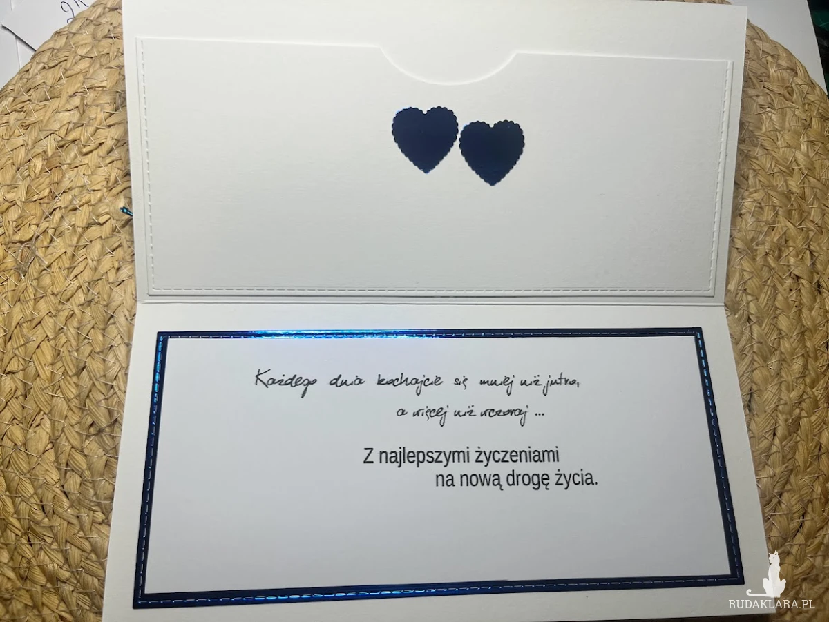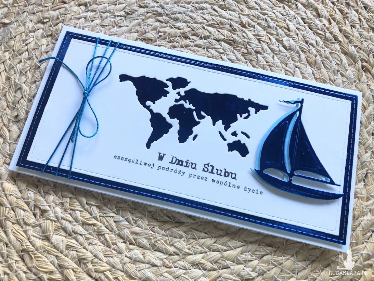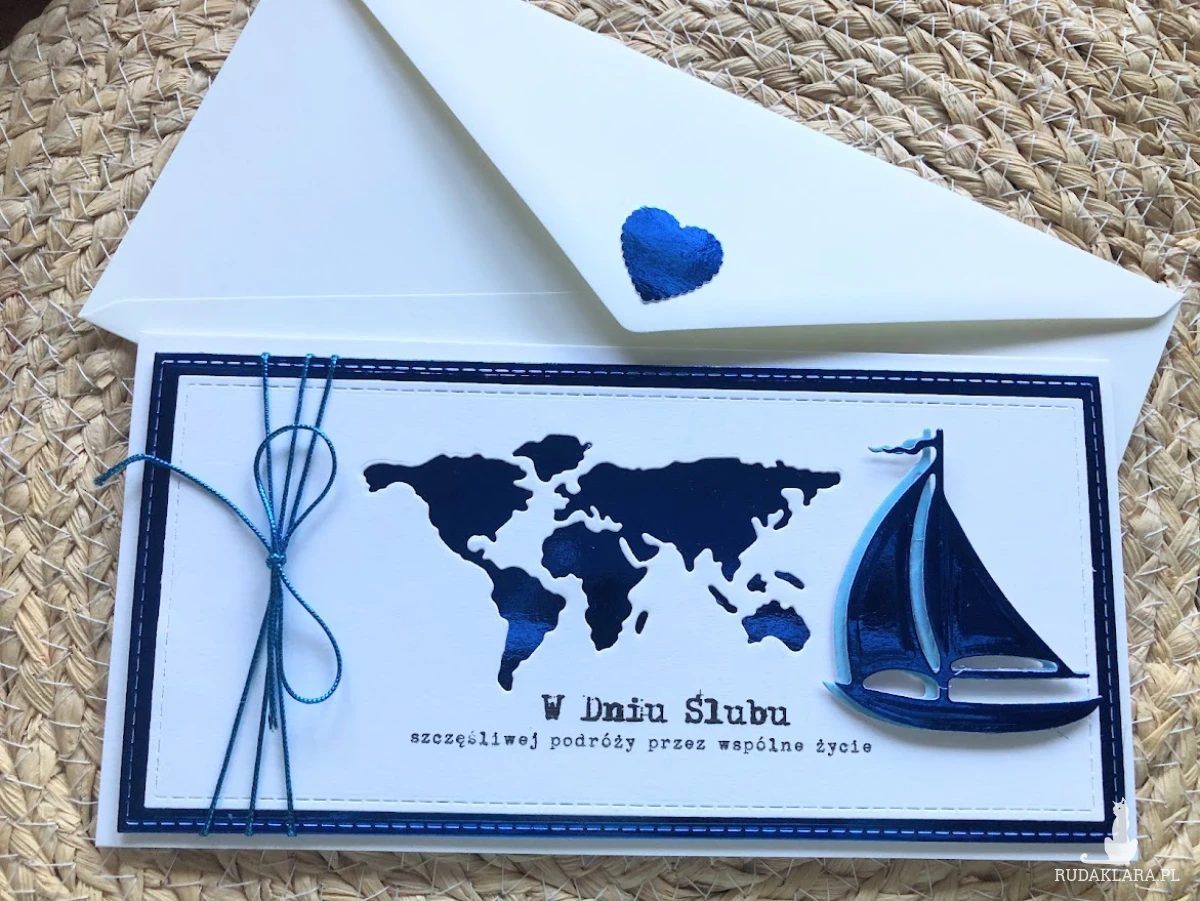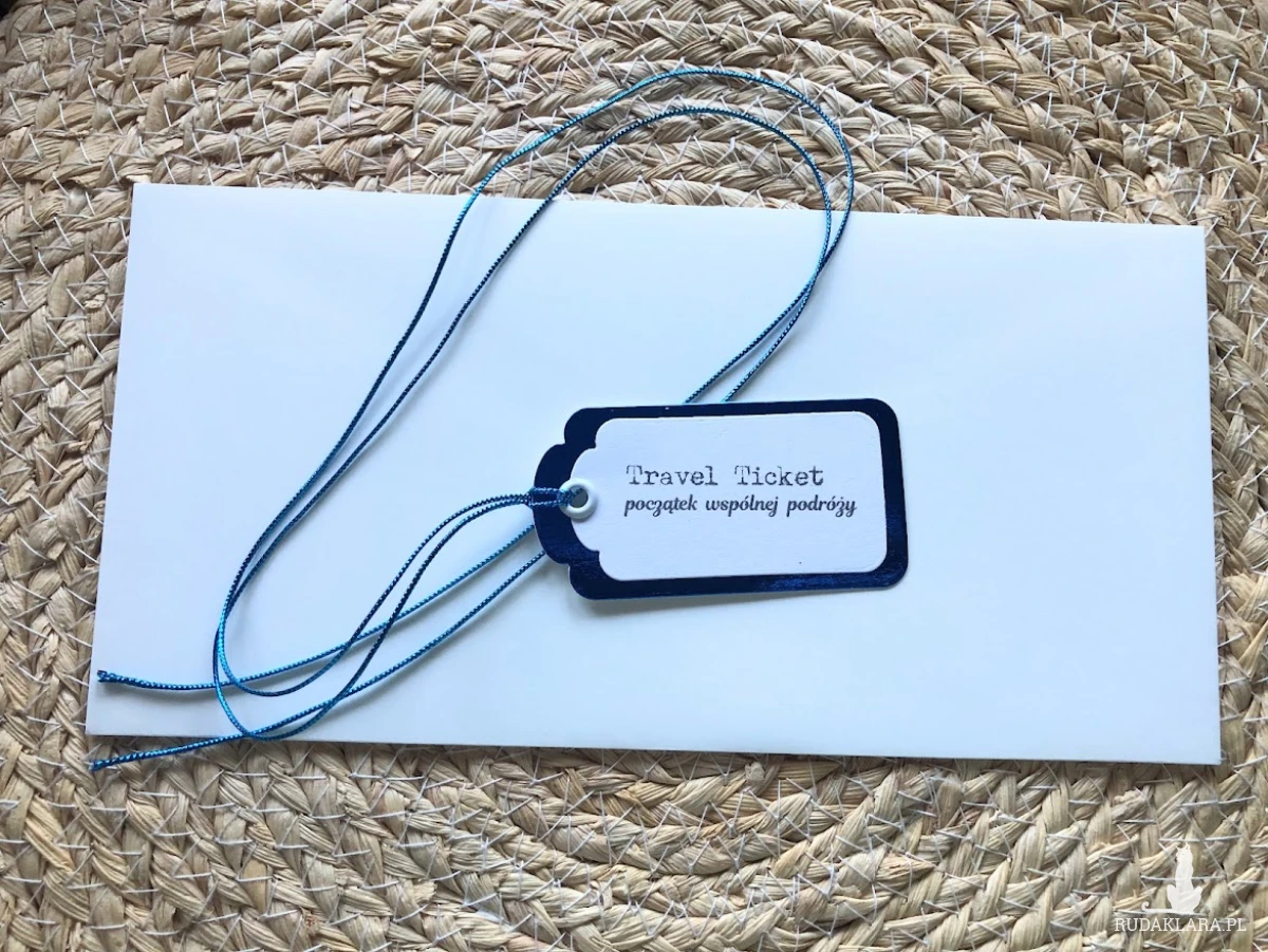 Kartka z okazji Ślubu do koperty dla Młodej Pary , która kocha podróże i wybiera się w szczęśliwą podróż przez wspólne życie. Komplet stworzony na bazie papieru białego z dodatkiem lustrzanego paryskiego błękitu. Kartka ma wymiary 10,5 x 21,0 , Całość obwiązana niebieskim sznurkiem z tagiem - biletem .W środku kartki znajdują się gotowe życzenia do własnoręcznego podpisu oraz kieszonka na małe co nieco lub kupon lotto. W tej postaci produkt dostępny od ręki .Zapraszam