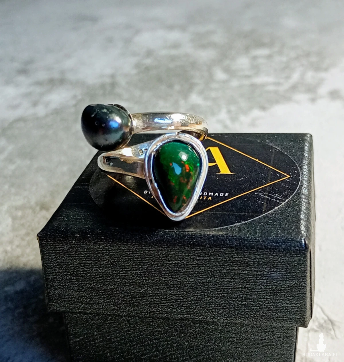 Srebrny ręcznie wykonany pierścionek z czarnym opalem i czarną perłą.