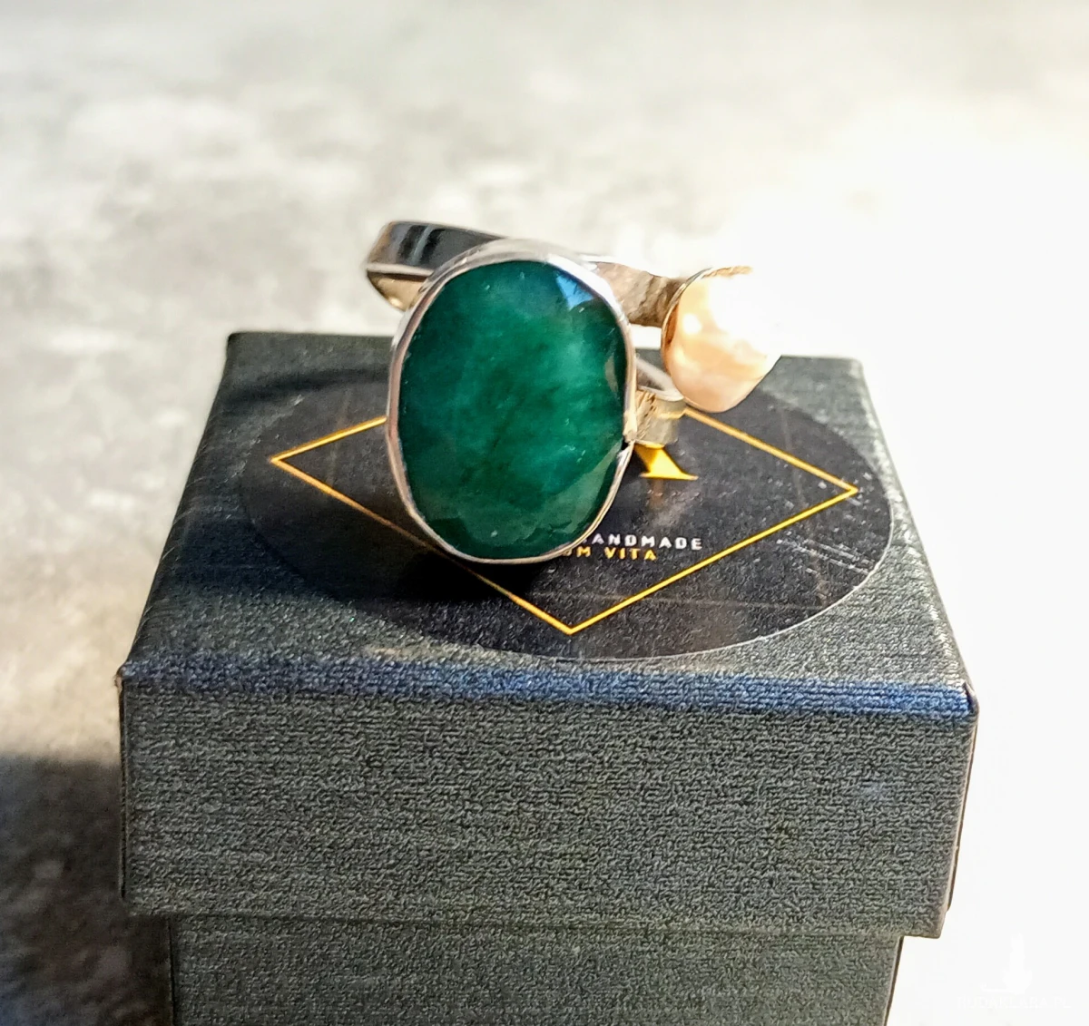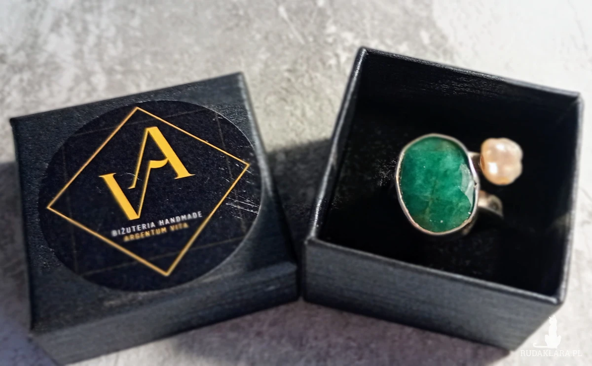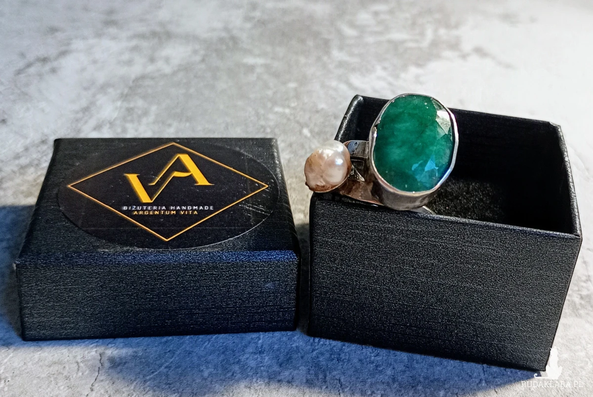 Srebrny ręcznie wykonany pierścionek z szmaragdem i barokową perłą.