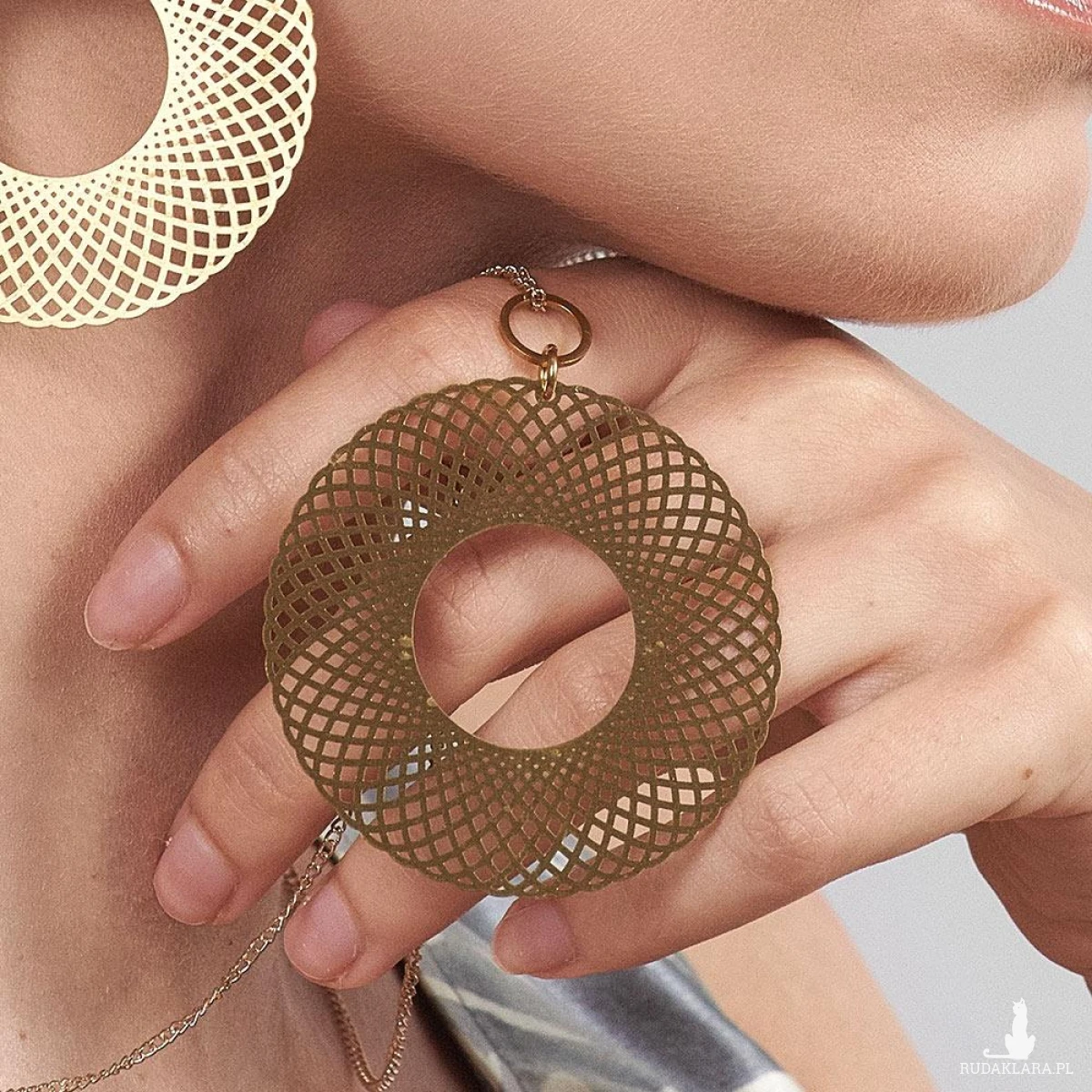 Naszyjnik z dużym ażurowym kołem to propozycja dla kobiet ceniących nowoczesny, a zarazem klasyczny styl. Jego geometryczna forma i złoty kolor sprawiają, że z łatwością dopasujesz go zarówno do eleganckiej sukienki, jak i codziennych stylizacji z dżinsami czy koszulą. Ażurowy wzór nadaje biżuterii lekkości i wizualnej delikatności, przyciągając wzrok i podkreślając indywidualny charakter właścicielki.