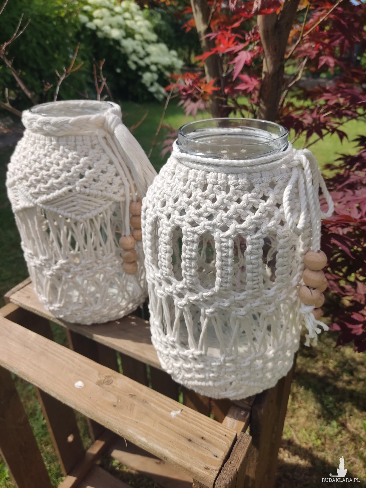 Ręcznie wykonany lampion wypleciony metodą makramy, wysokość lampionu 30 cm natomiast średnica podstawy 17 cm (słoik o pojemności 4 litrów) w kolorze naturalnym. W środku lampionu można umieścić świecę bądź lampki LED.