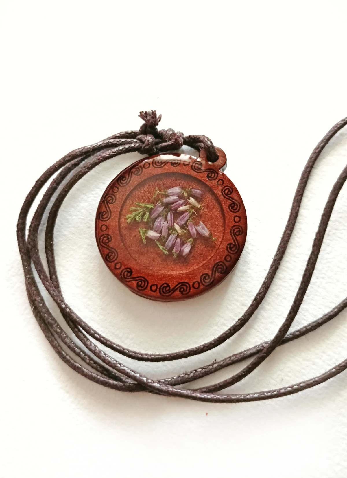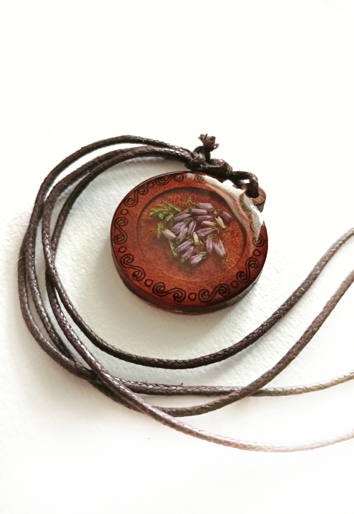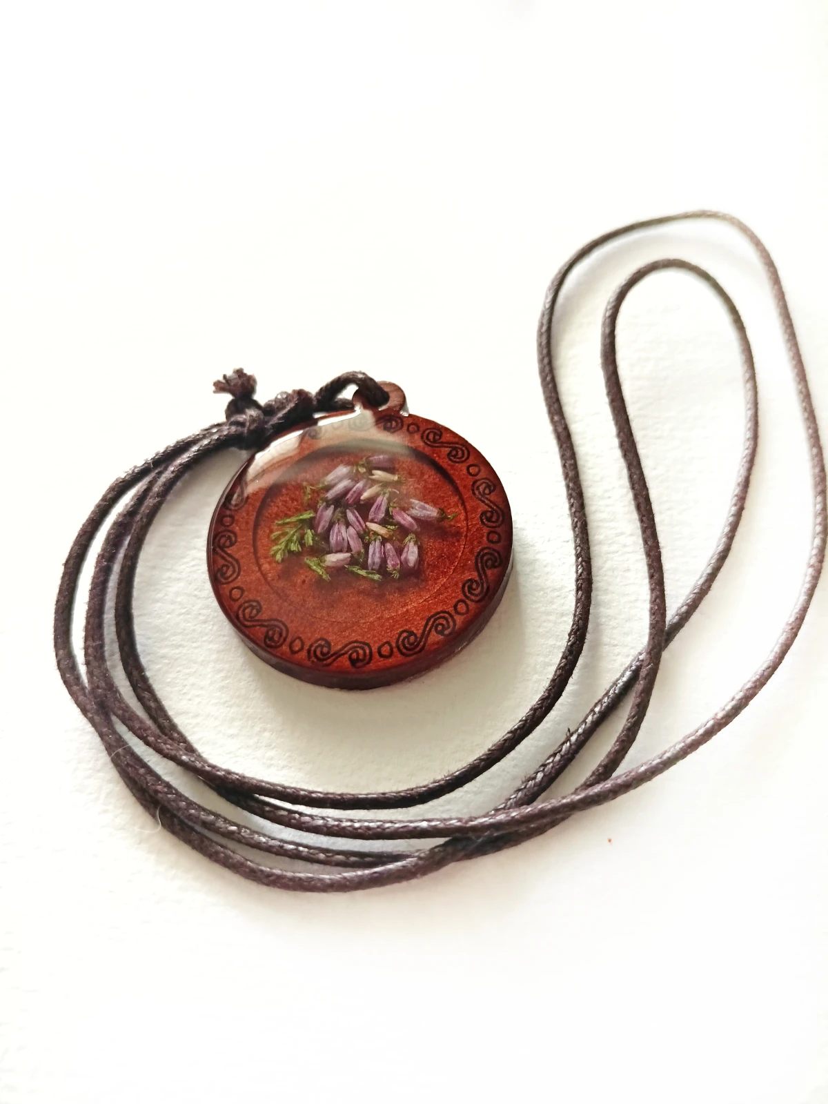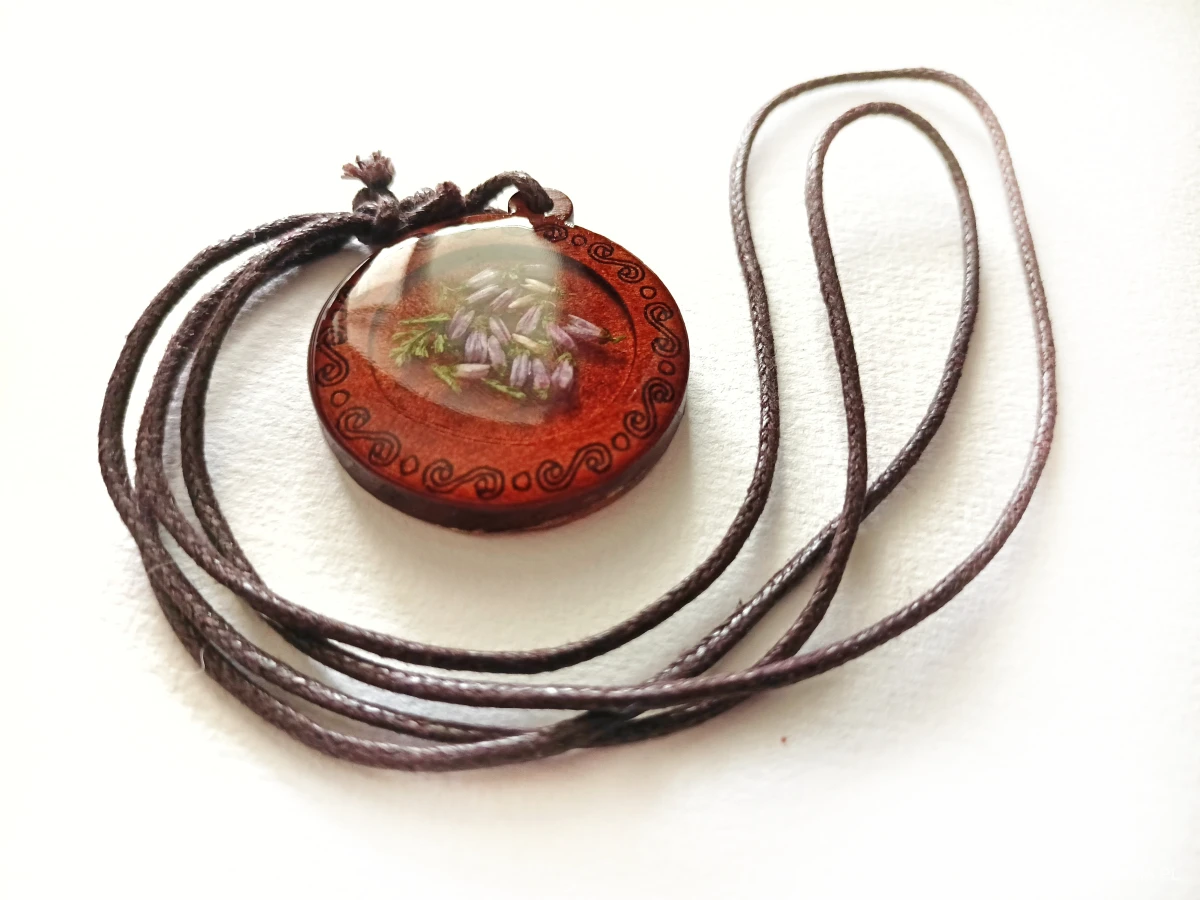 naszyjnik wrzos w żywicy, naszyjnik dla wiedźmy, biżuteria słowiańska handmade, medalion z żywicy i drewna, wisiorek boho, naszyjnik handmade z wrzosem, magiczna biżuteria, naturalna zawieszka, leśny naszyjnik, biżuteria dla zielarki, drewniana biżuteria z żywicą, prezent dla czarownicy