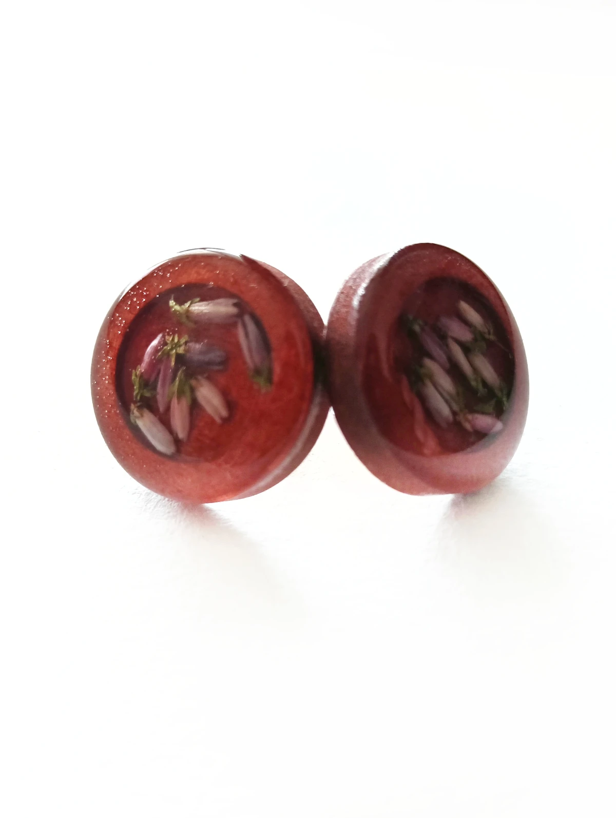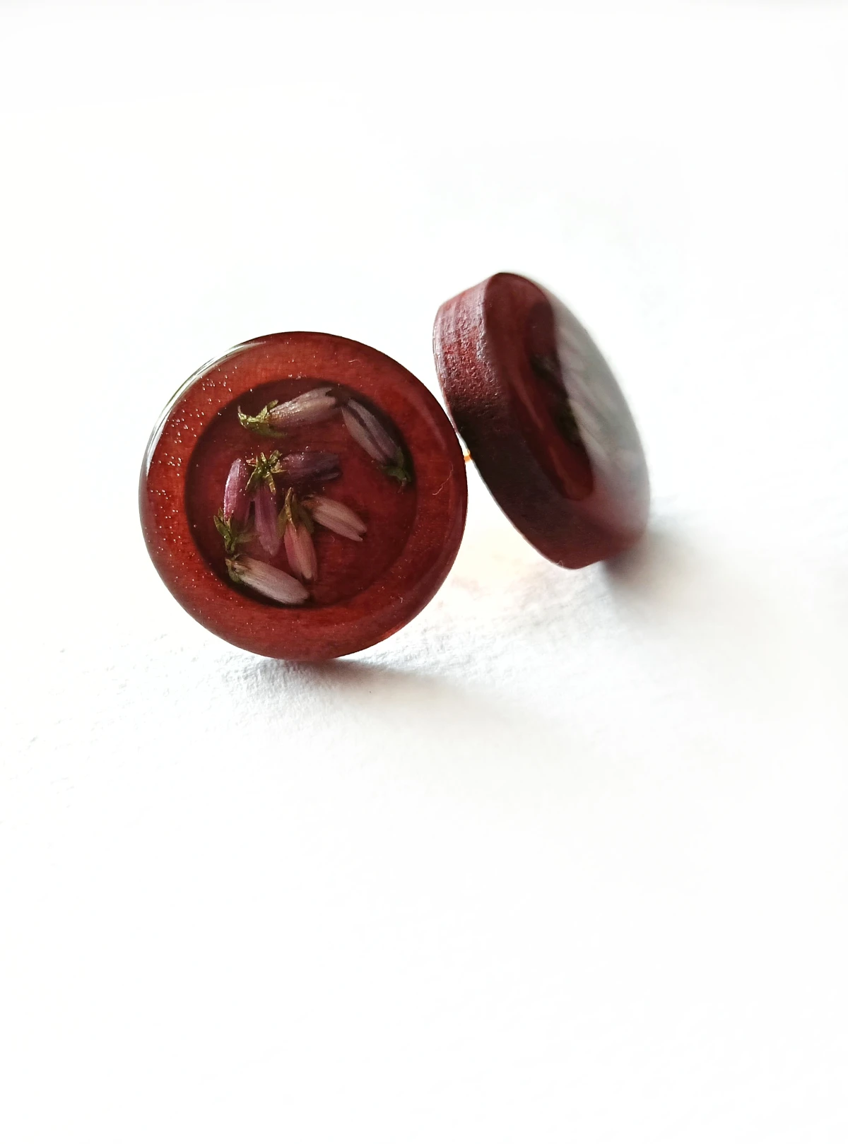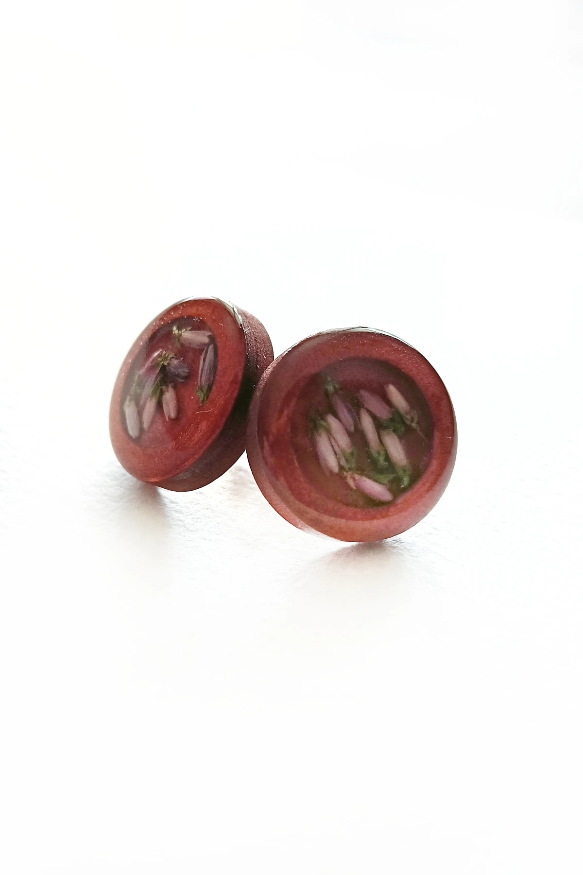 kolczyki wrzos w żywicy, kolczyki handmade z kwiatami, biżuteria z suszonymi roślinami, kolczyki wkrętki naturalne, drewniane kolczyki z żywicą, ręcznie robiona biżuteria, kolczyki pozłacane handmade, prezent dla kobiety boho, naturalna biżuteria, kolczyki las w żywicy