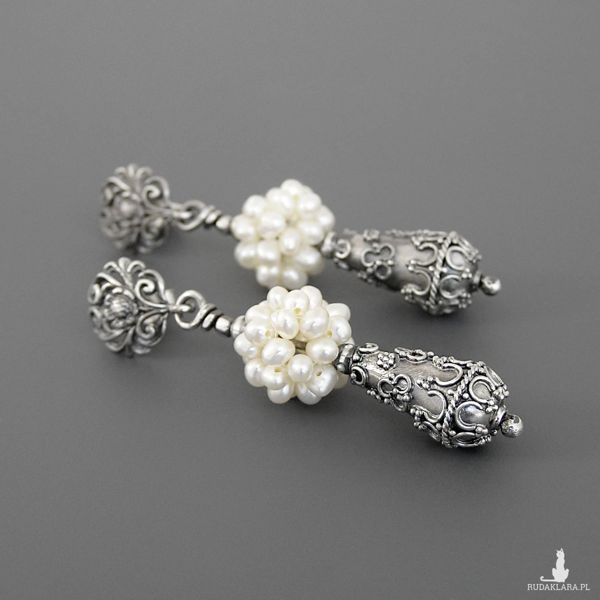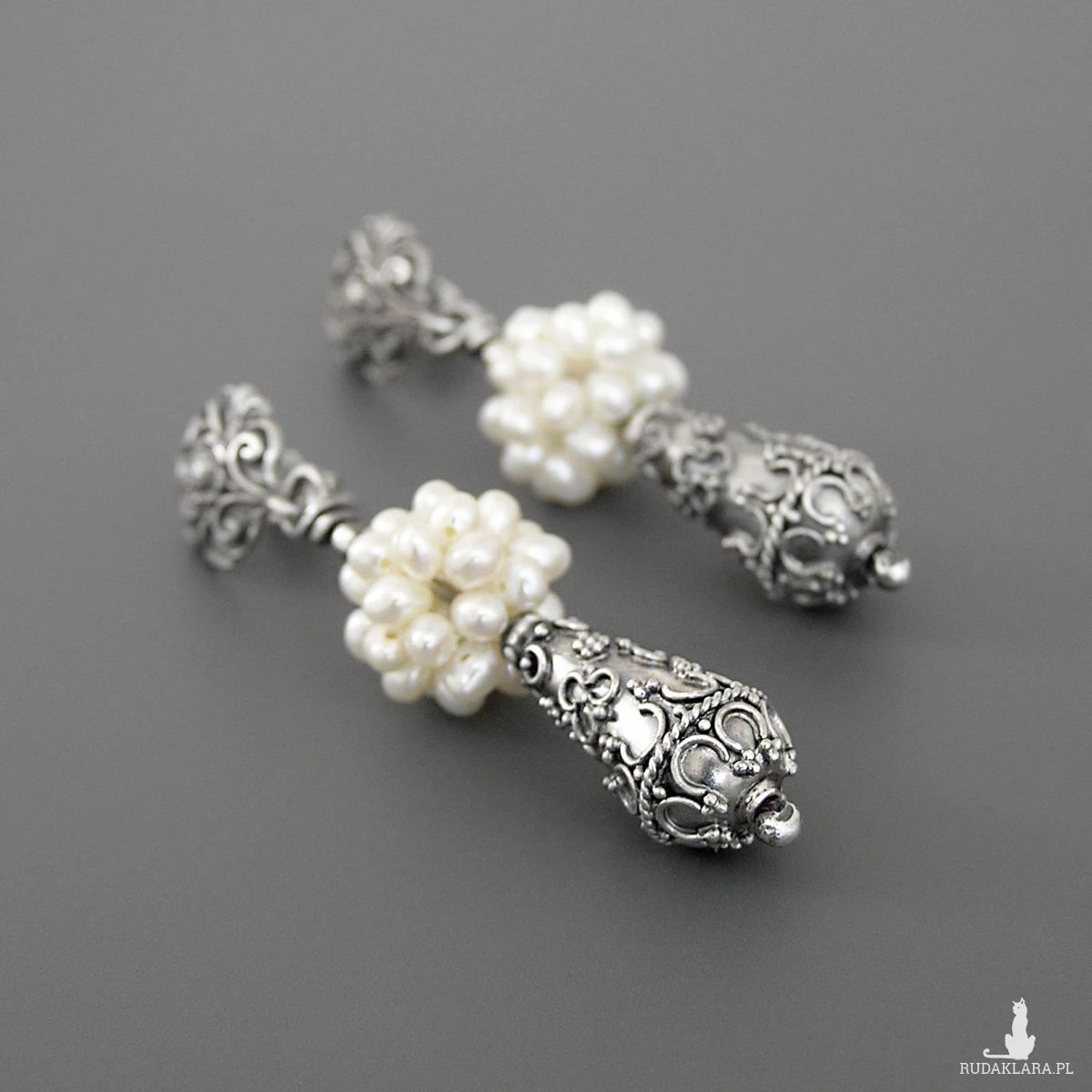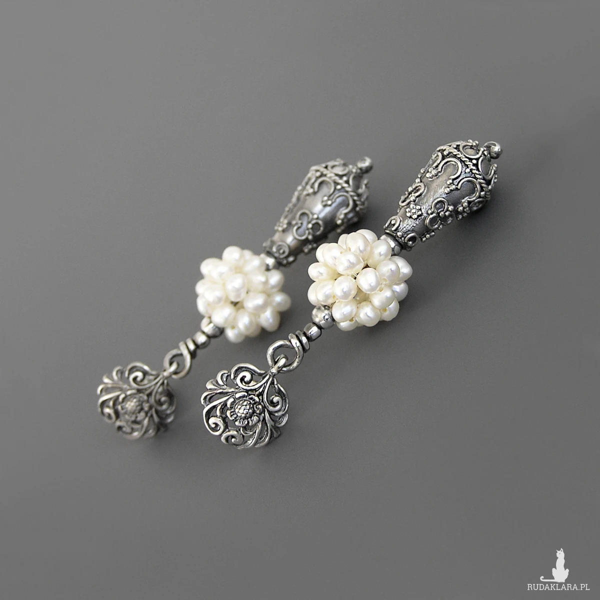 Długie kolczyki retro z "jeżynkami" z maleńkich 3 mm pereł (średnica 12 mm).