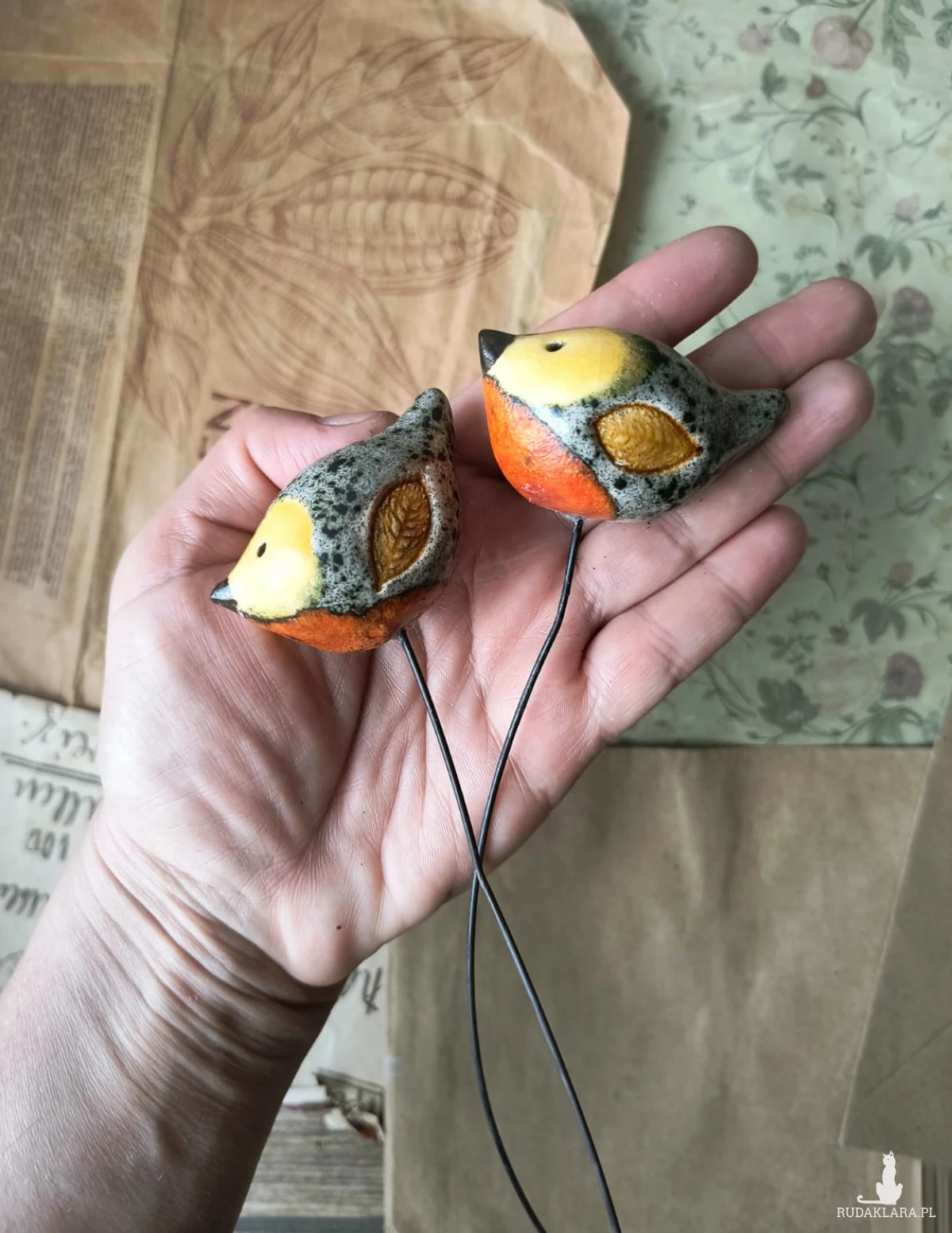 Komplet ptaszków ceramicznych na piku, wykonanych z gliny szamotowe, wypalonych na biskwit, a następnie szkliwionych w temp. ok 1260 stopni C. Wymiary 6 cm x 5,5 cm. Do postawienia na półeczce, lustrze lub jako przycisk do papieru czy serwetek. Dostępne również osobno. Serdecznie polecam!!!