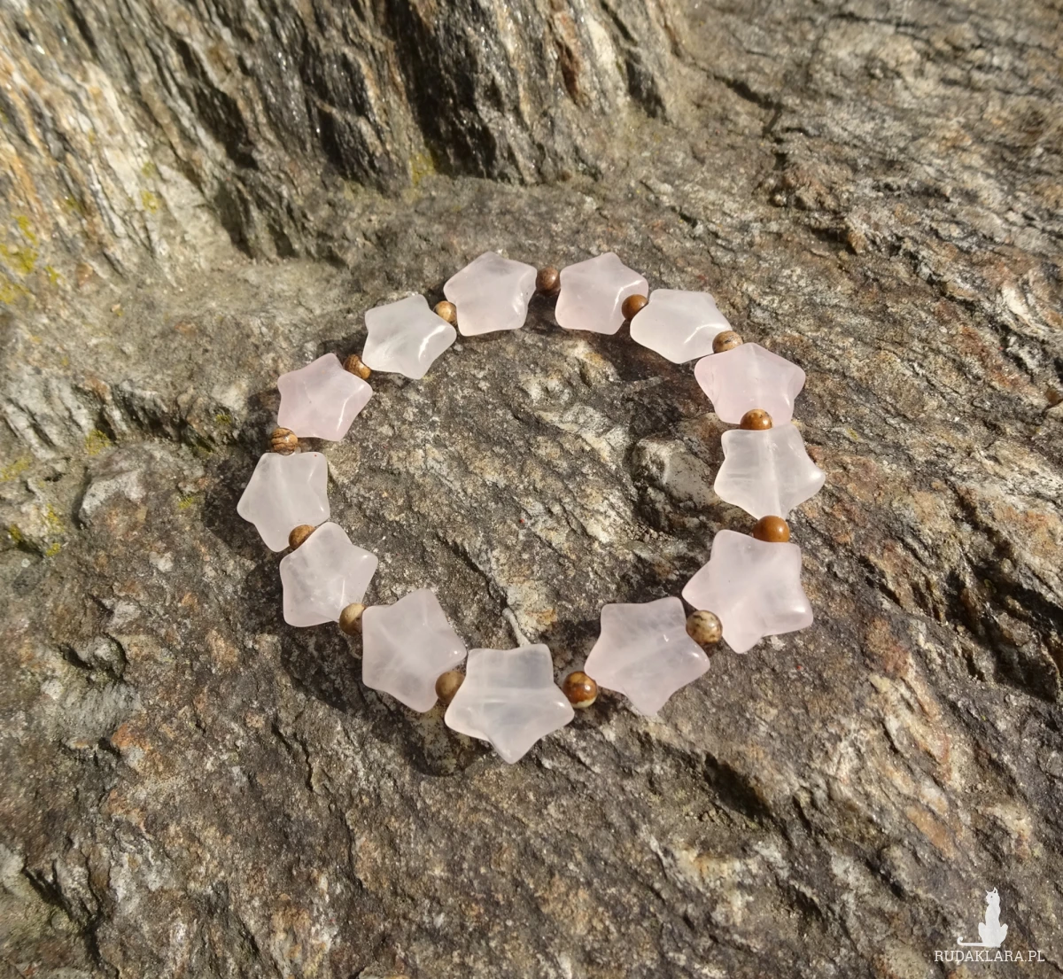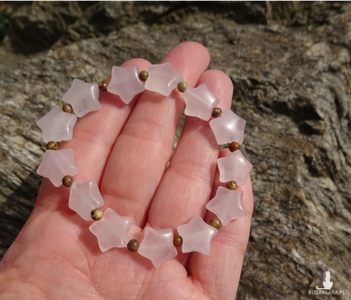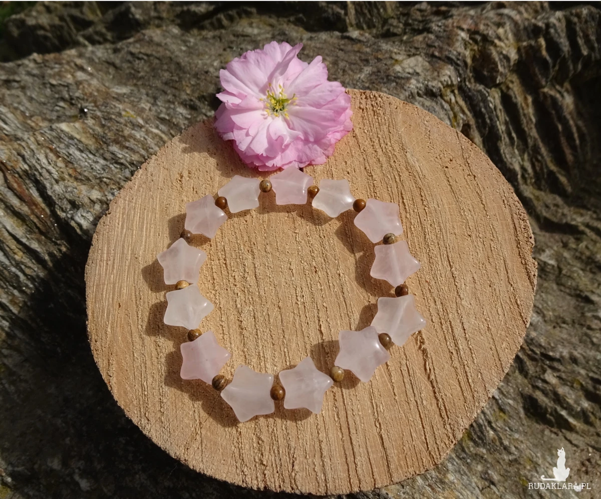 Ręcznie wykonana bransoletka z gwiazdek kwarcu różowego ok. 1,1cm i gładkich kulek jaspisu pejzażowego wielkości 3mm, na silikonowej gumce.