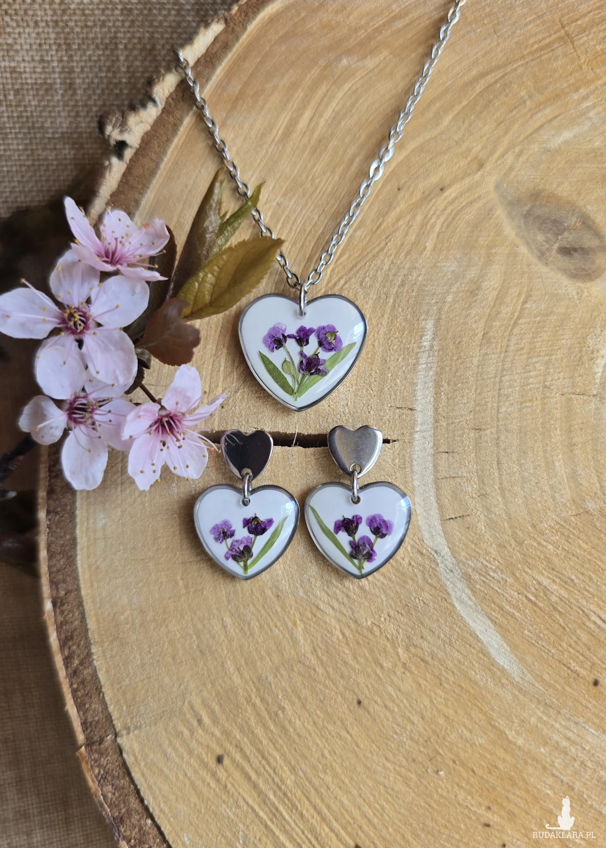 Oferuję Państwu unikalną biżuterię. Komplet jest wykonany z suszonych kwiatów i żywicy epoksydowej. Biżuteria jest wspaniałym i oryginalnym prezentem na lata.