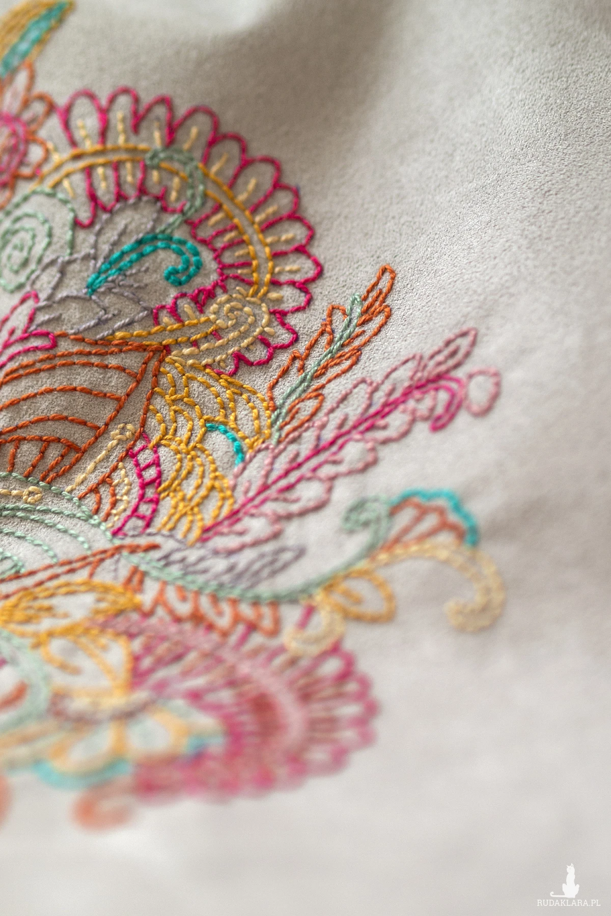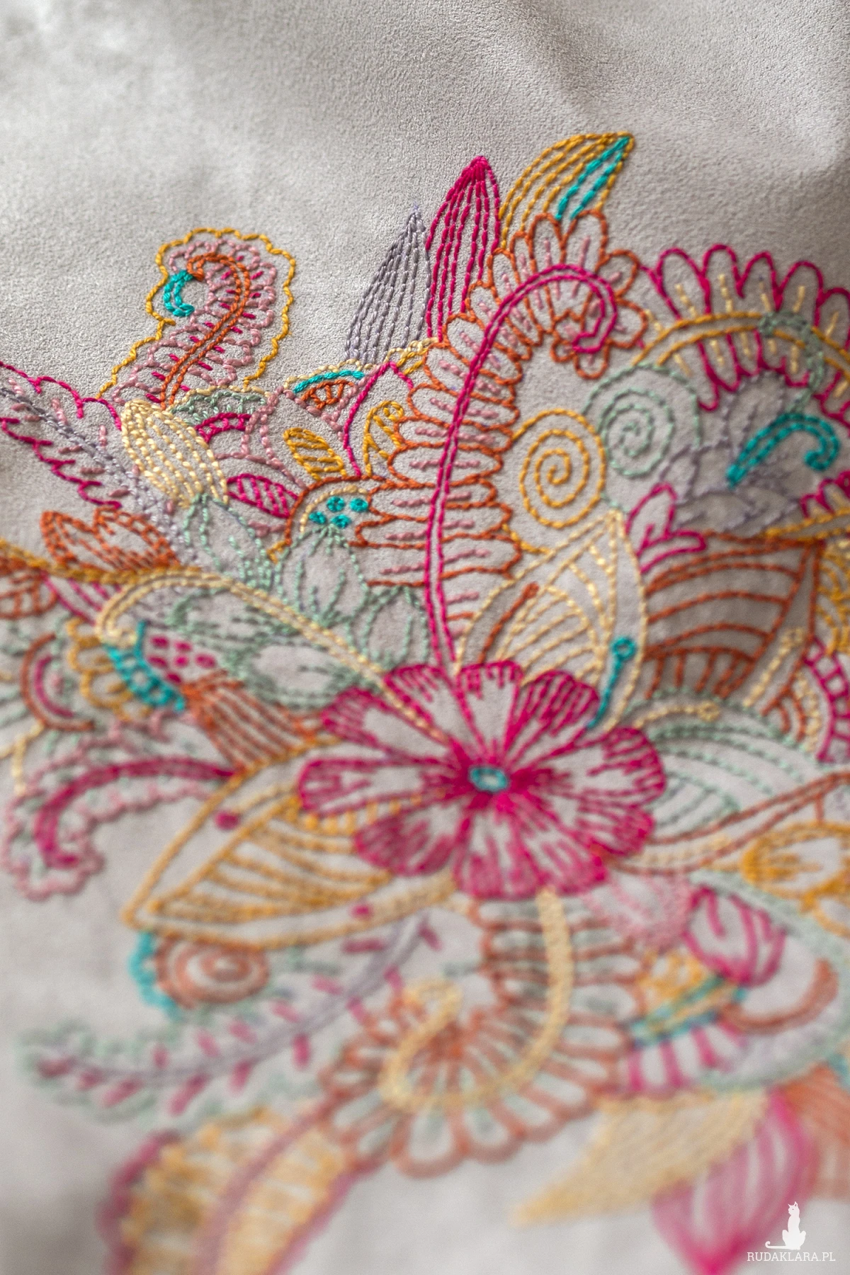 Duża torba na ramię typu shopper wykonana z jasnoszarego nubuku. Z przodu ręcznie haftowany kolorowy wzór.