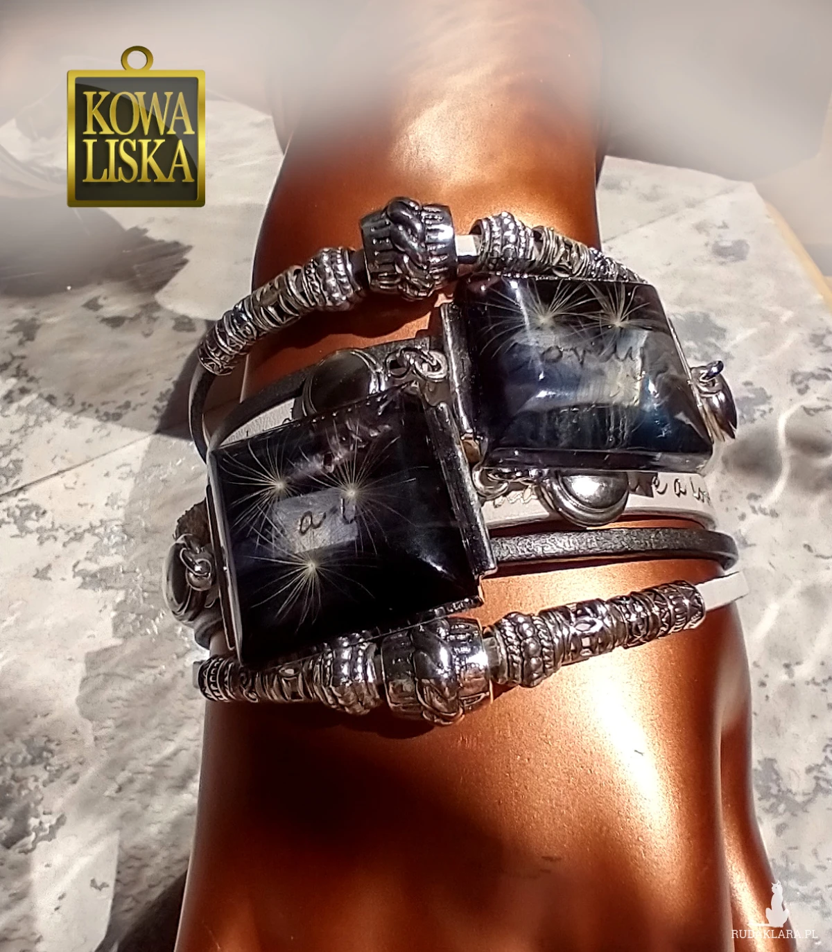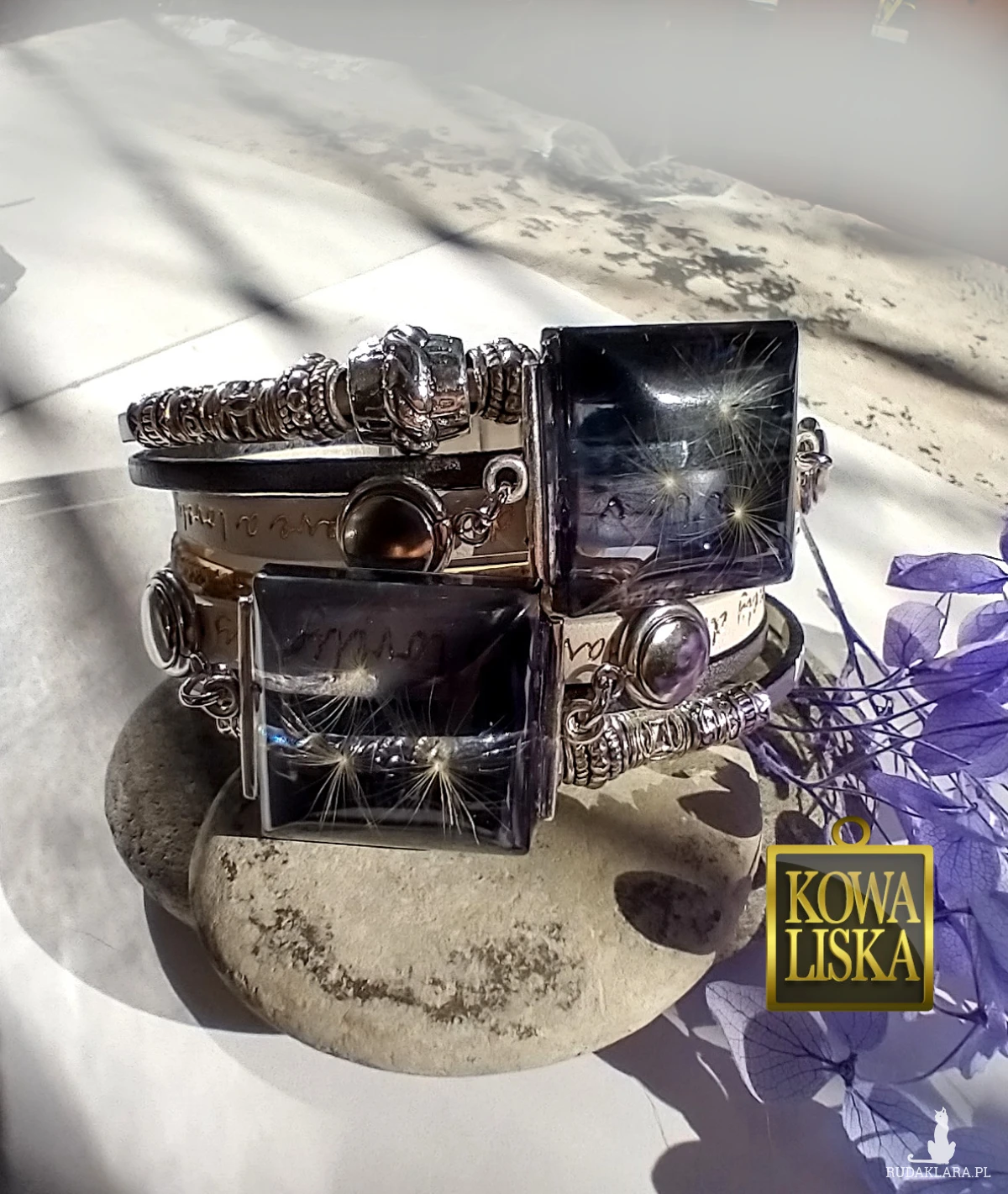 Ciężkość rzemieni i metalu pięknie się uzupełnia z eterycznością żywicy i kwiatów. Żywica pięknie odbija światło, a srebrzyste przekładki nadają charakteru i blasku - można je dowolnie przesuwać i układać po swojemu.