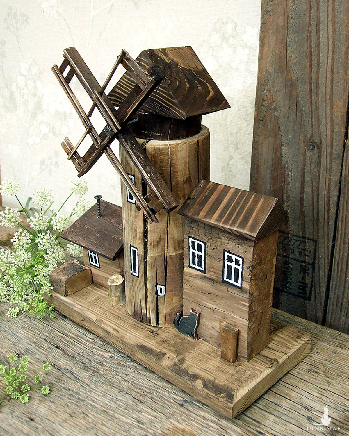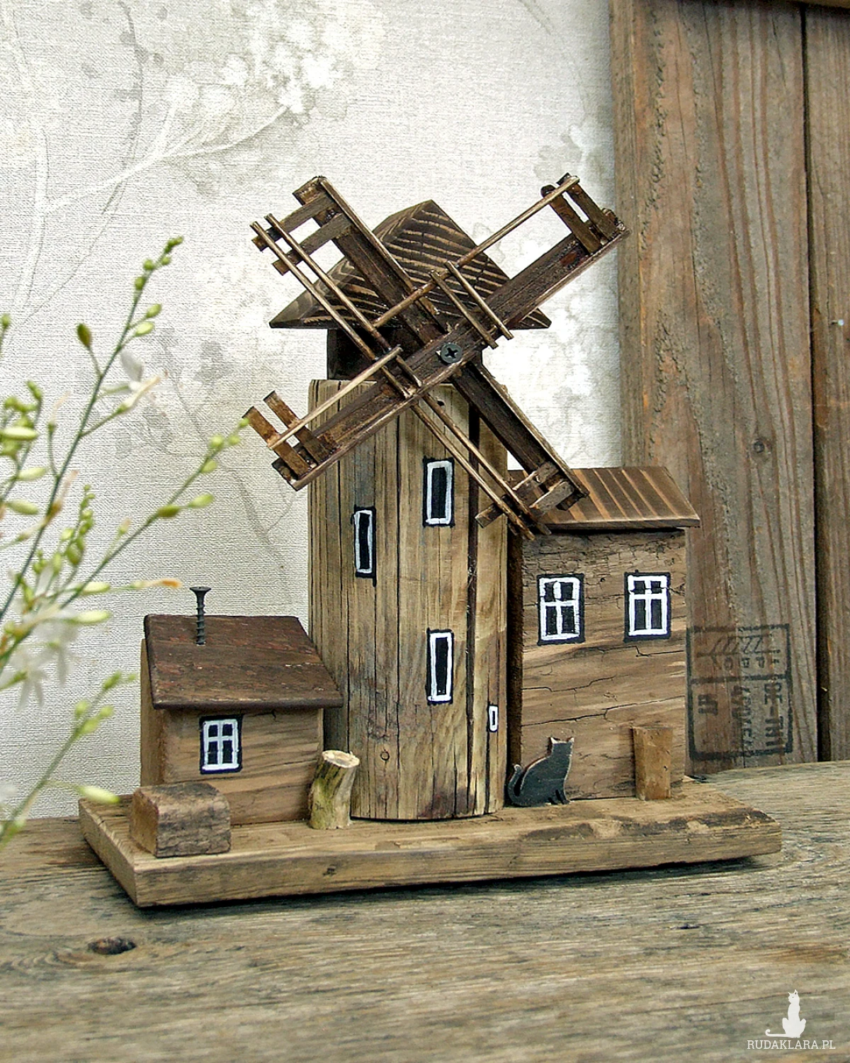 Dekoracja wykonana jest ze starego drewna sosnowego. Drewno ma ślady wcześniejszego użytkowania:pęknięcia, wgłębienia i otworki po gwoździach. Wszystko jest oczyszczone i zabezpieczone akrylowym matowym lakierem. Wykorzystaliśmy także różne patyczki i gałązki do budowy skrzydeł wiatraka. Dodatkowym elementem jest kot, wycięty ze sklejki.