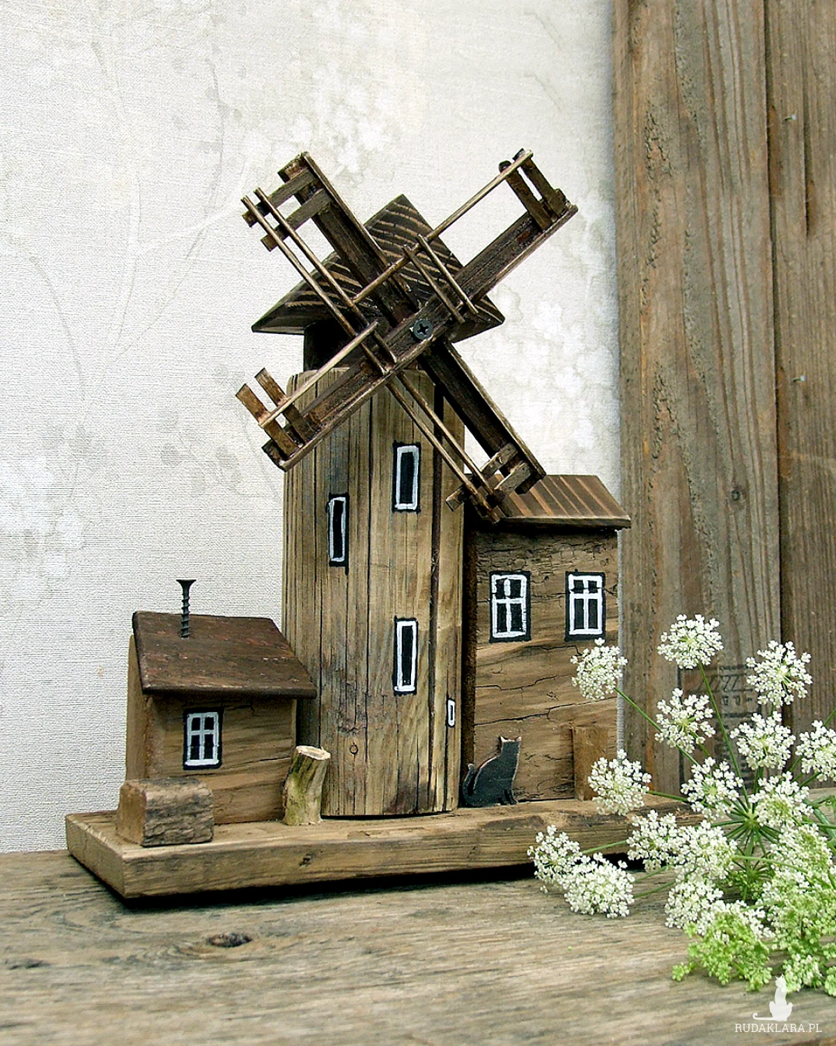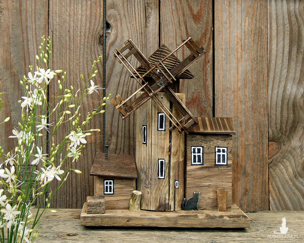 Młyn wiatrowy - dekoracja, ozdoba, ręcznie wykonana, w prostym sielskim klimacie. Domki z naszej pracowni, tworzą naturalny i przytulny klimat domu, i podkreślają bliskość z naturą.