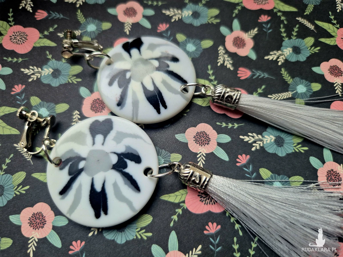Klipsy duże biało-szaro-czarne z białymi chwostami lekkie oryginalne robione ręcznie zwracają uwagę polecam, Jeśli chcesz żebym zamieniła je na kolczyki Napisz zrobię to cena pozostaje bez zmian:)  Box X1