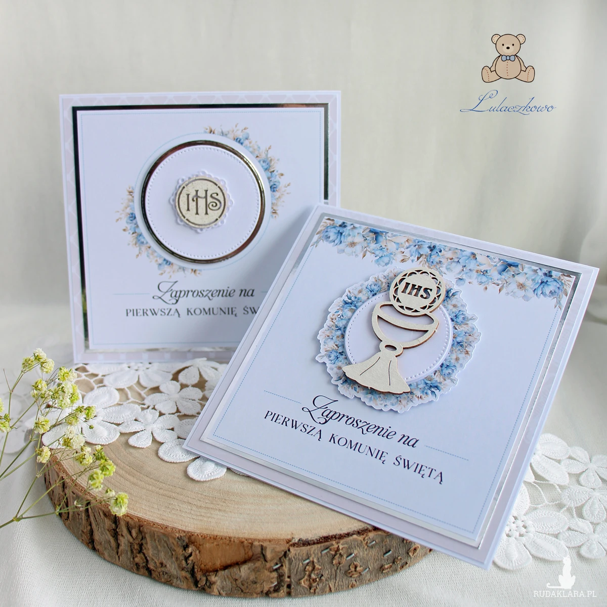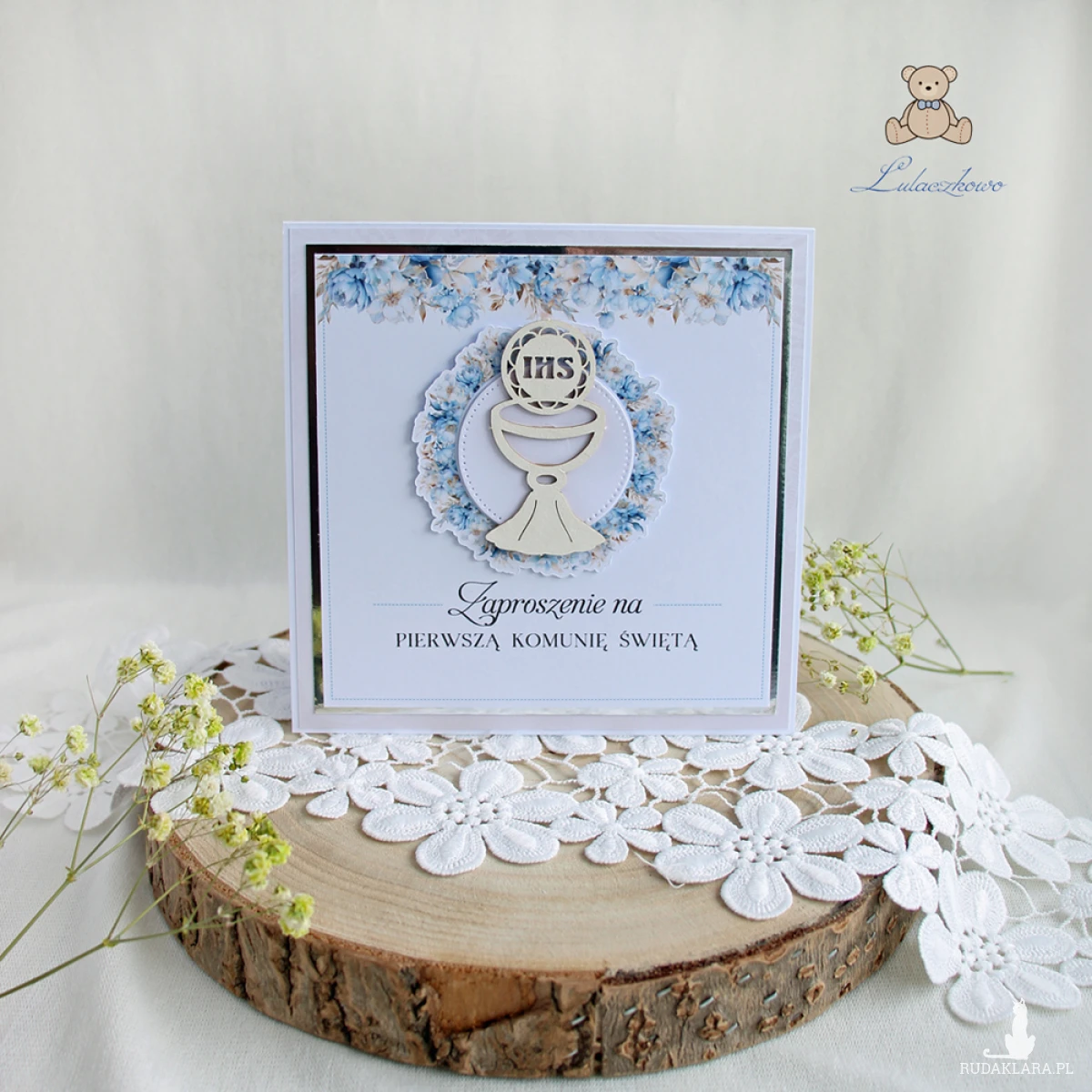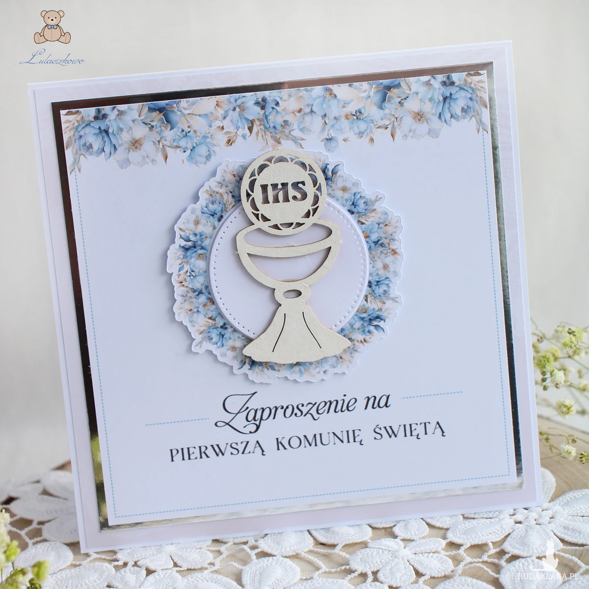 Przepiękne i eleganckie zaproszenia na Pierwszą Komunię Świętą, wykonane ręcznie z dbałością o każdy szczegół. Zaproszenia klejone warstwowo, dzięki czemu posiadają lekki efekt 3D. Centralny punkt zaproszenia stanowi przepiękna, tekturka kielich z hostią świętą, otoczona wianuszkiem z błękitno-kremowych kwiatów. Całość dopełnia papier scrapowy w odcieniu nude oraz błyszczący, srebrny papier lustrzany, a także nadrukowany napis "Zaproszenie na Pierwszą Komunię Świętą" (istnieje możliwość nadrukowania również imienia dziecka - w tym celu proszę o kontakt).