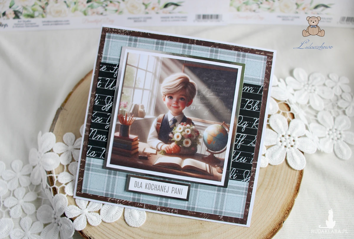 Podziękowanie dla nauczyciela/nauczycielki, w formie ręcznie robionej kartki pamiątkowej, idealnej jako prezent na zakończenie roku szkolnego. Kartka z motywem chłopczyka, ucznia trzymającego w rękach bukiet kwiatów. Kartka ozdobiona jest dodatkowo papierem scrapowym oraz błyszczącym, srebrnym papierem lustrzanym oraz napisem "Dla kochanej Pani" - na życzenie napis mogę zmienić na dowolny, np. "Kochanej Pani Beatce".