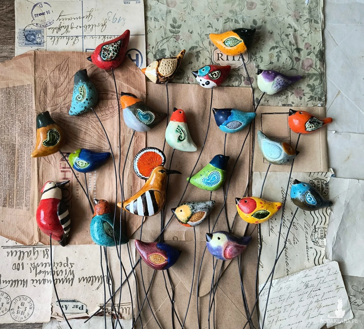 Zestaw 22 ptaszków ceramicznych na piku, wykonanych z gliny szamotowej, wypalonych na biskwit, a następnie szkliwionych w temp 1260 stopni C. Polecam serdecznie