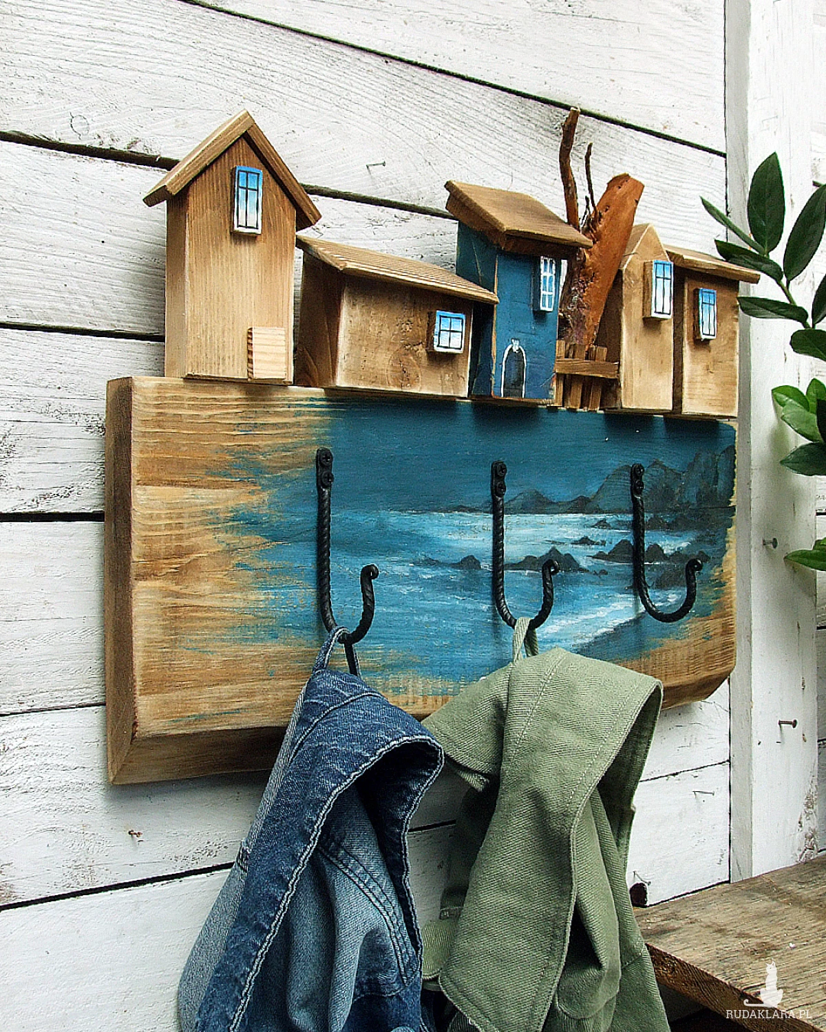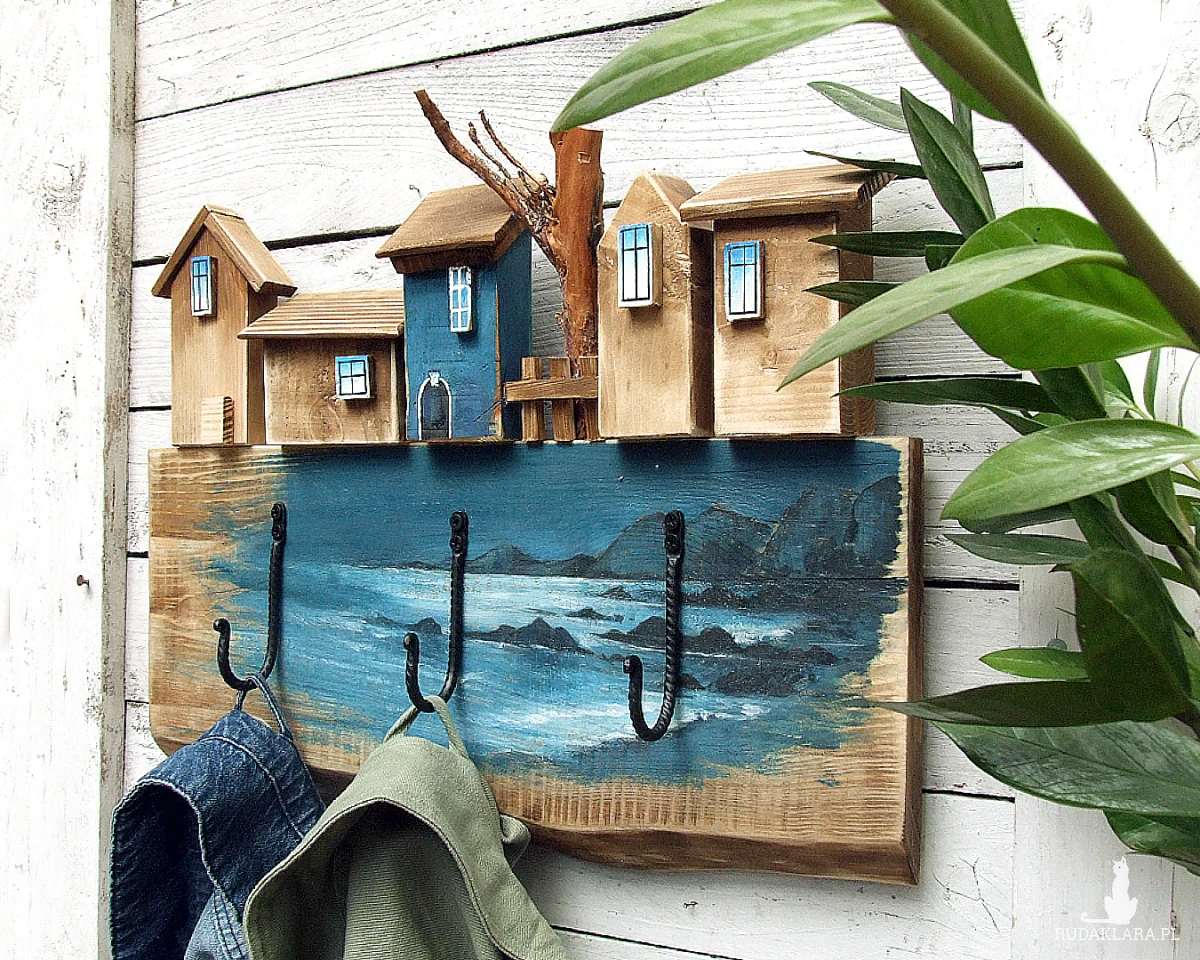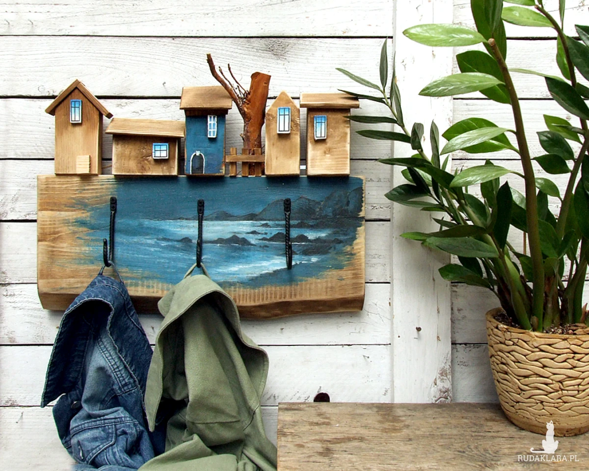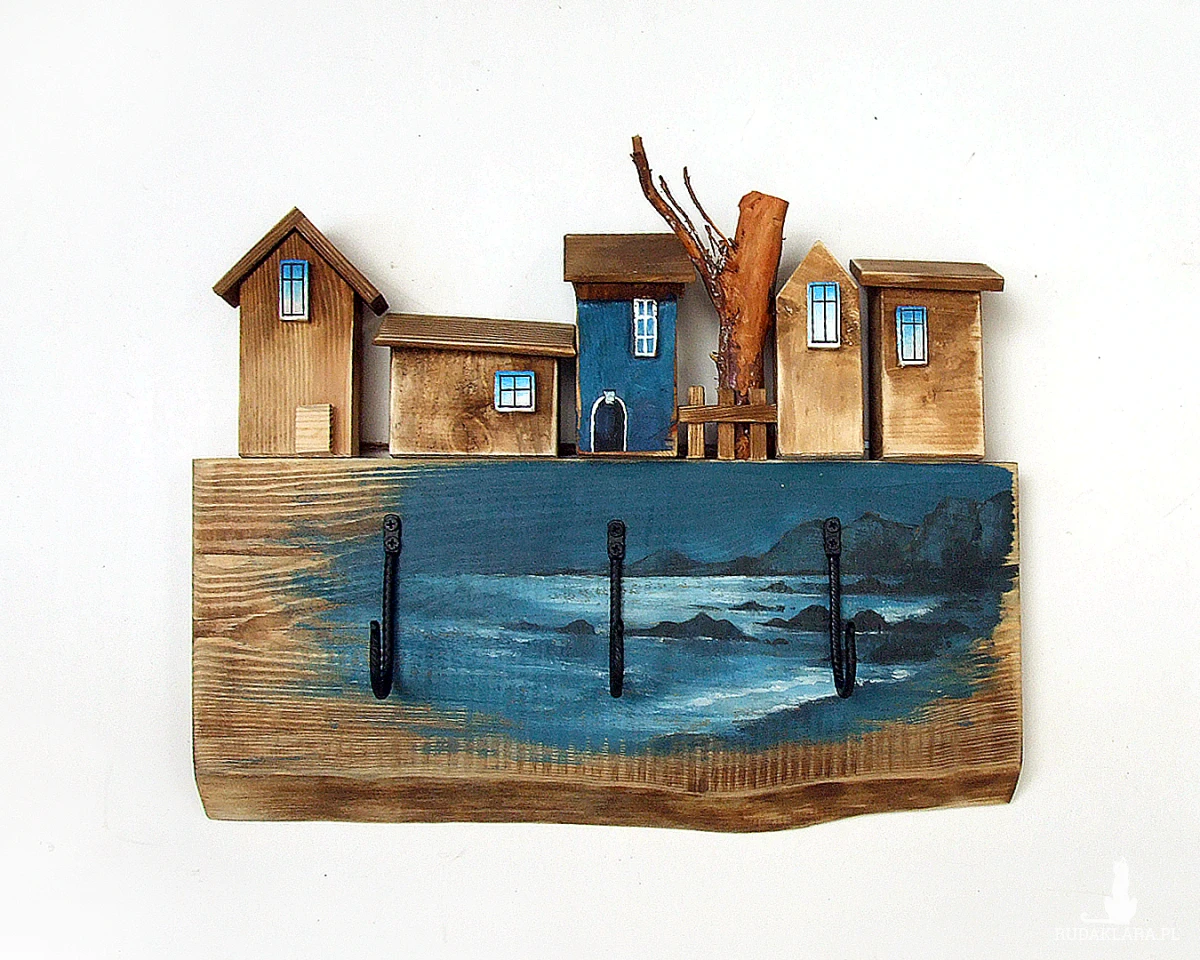 Drewniany wieszak z domkami i malowanym pejzażem.
