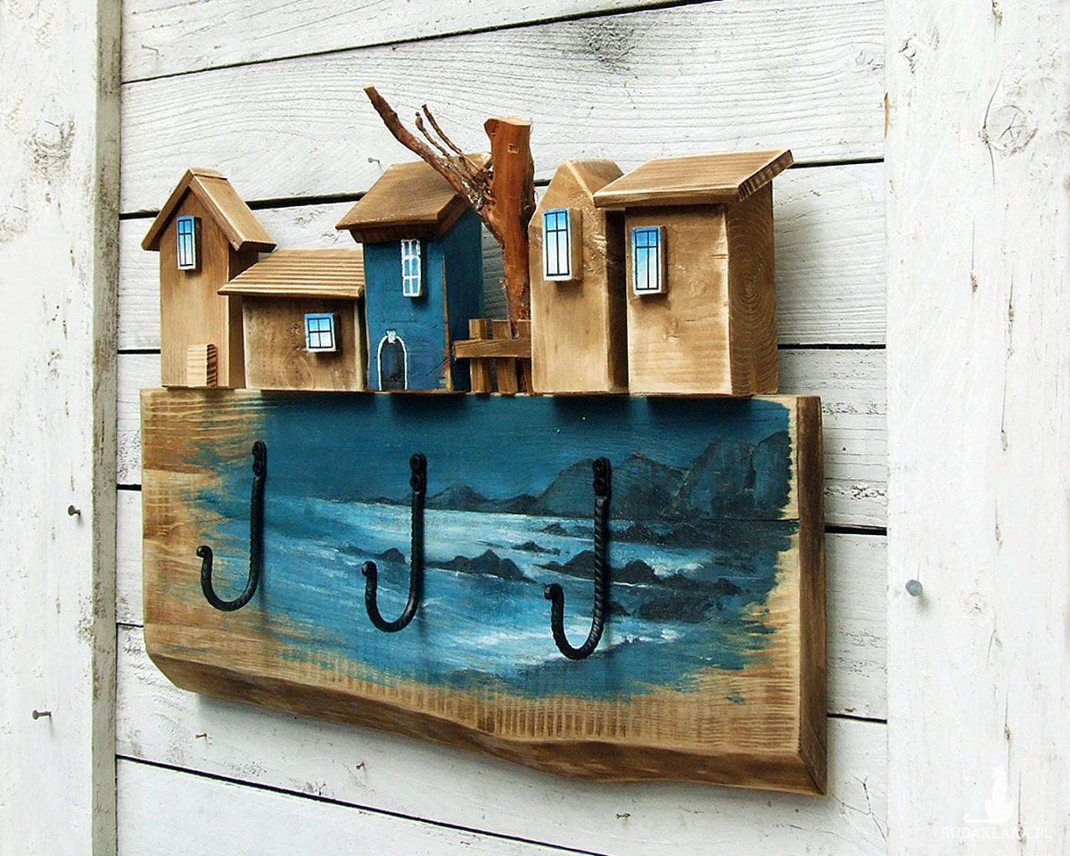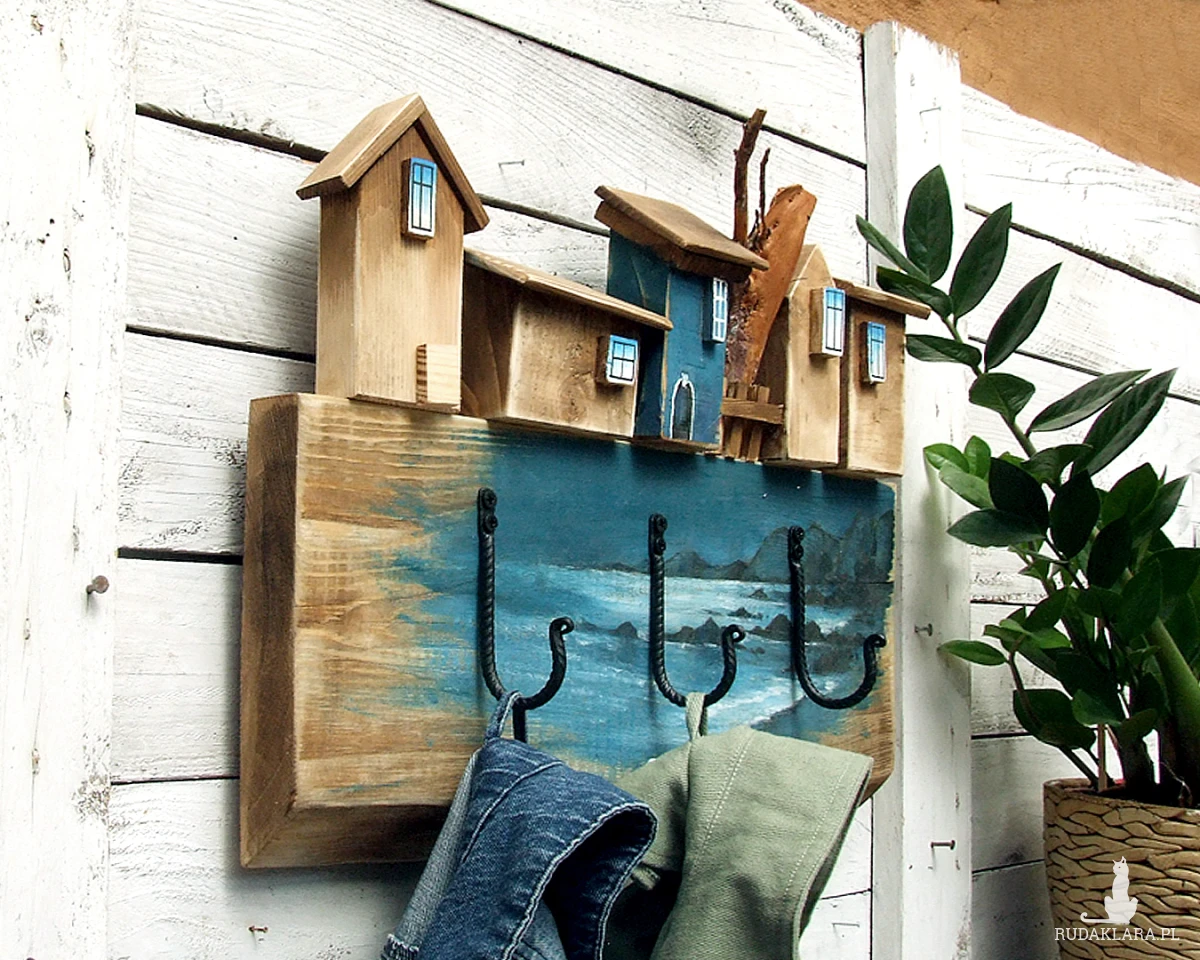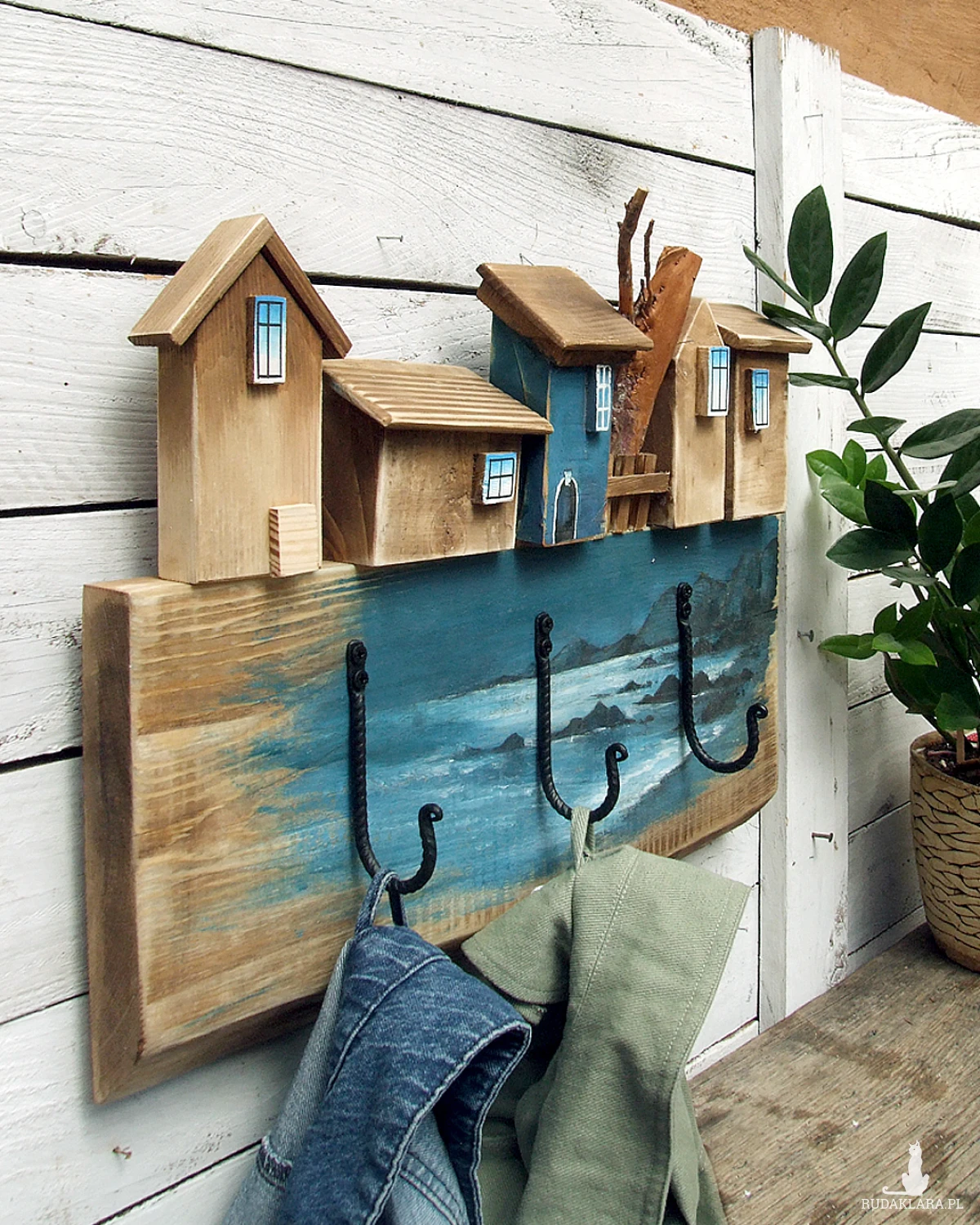 Drewniany wieszak z domkami i malowanym pejzażem.