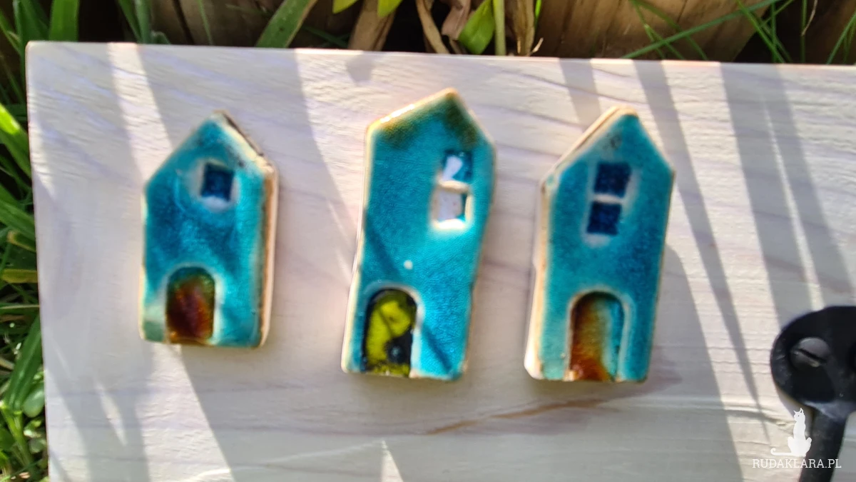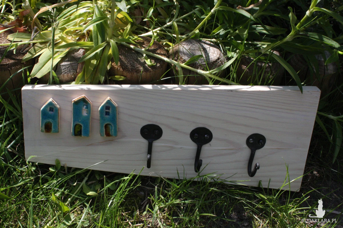 Wieszak na bielonej desce z domkami ceramicznymi. Wieszaki kute. Polecam