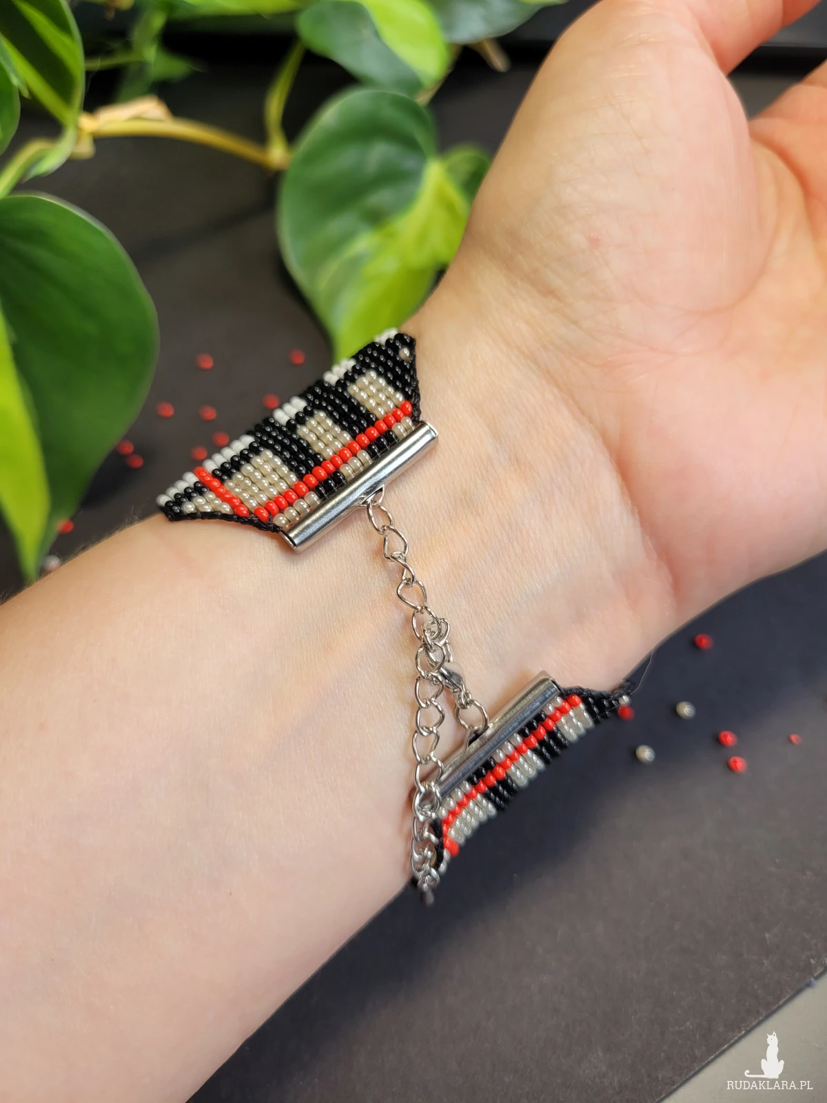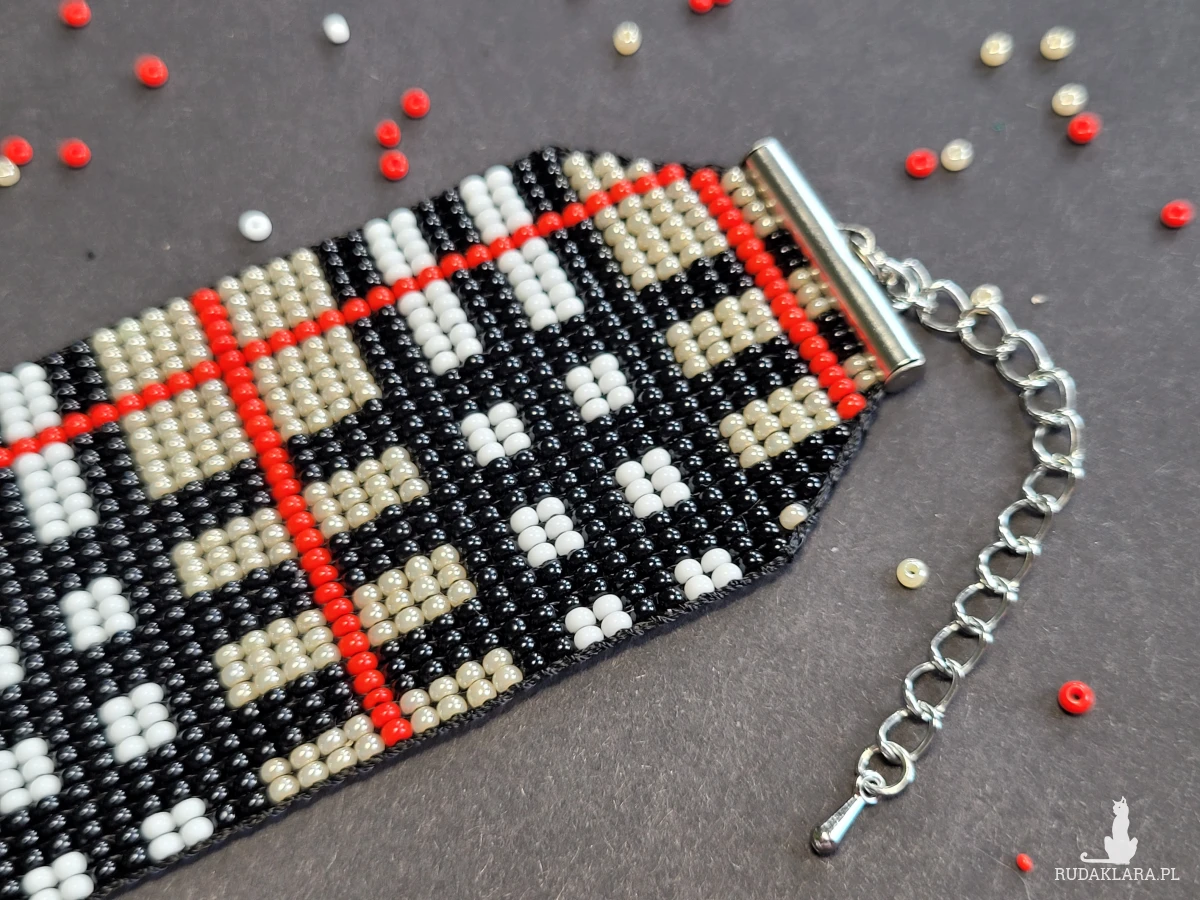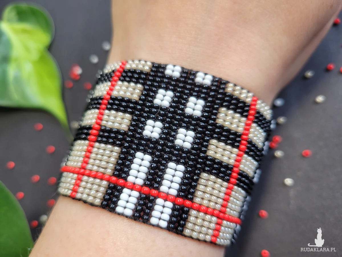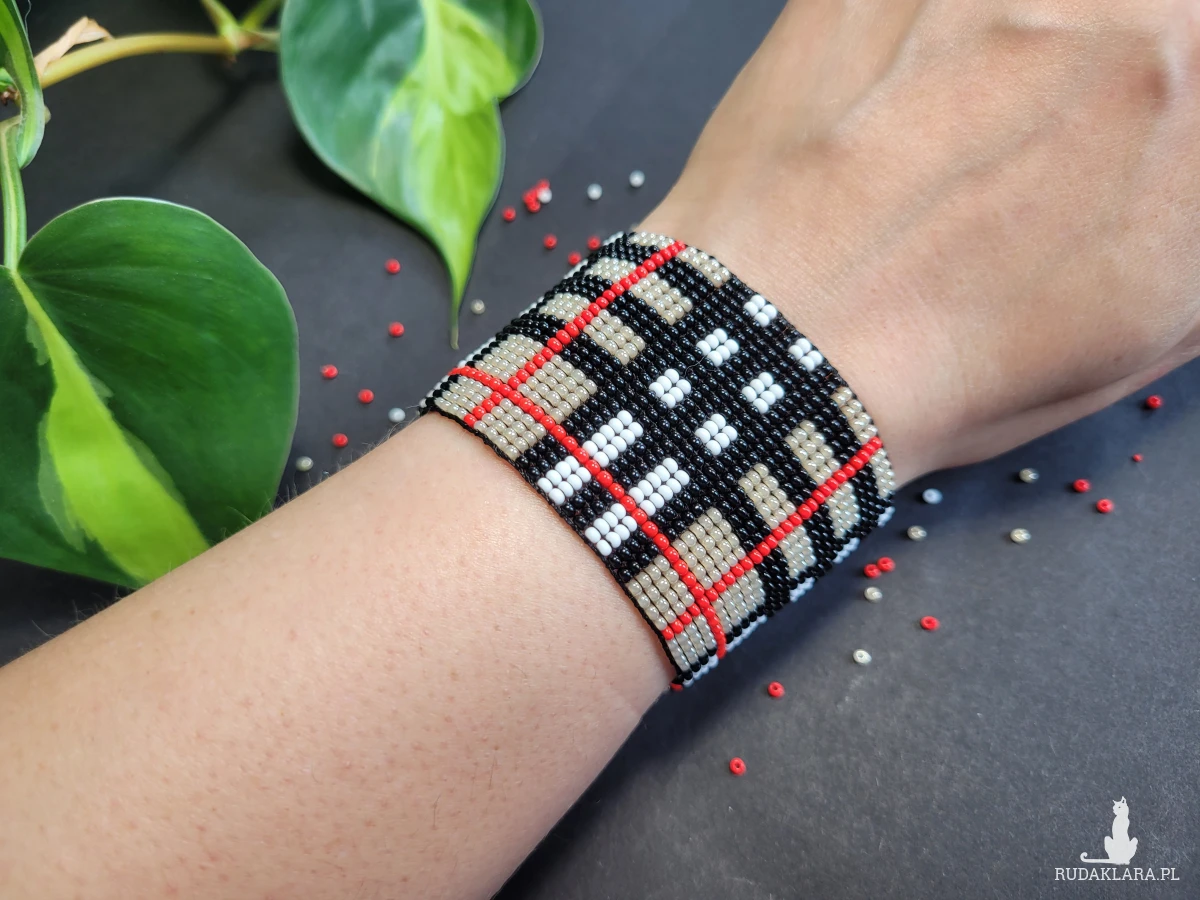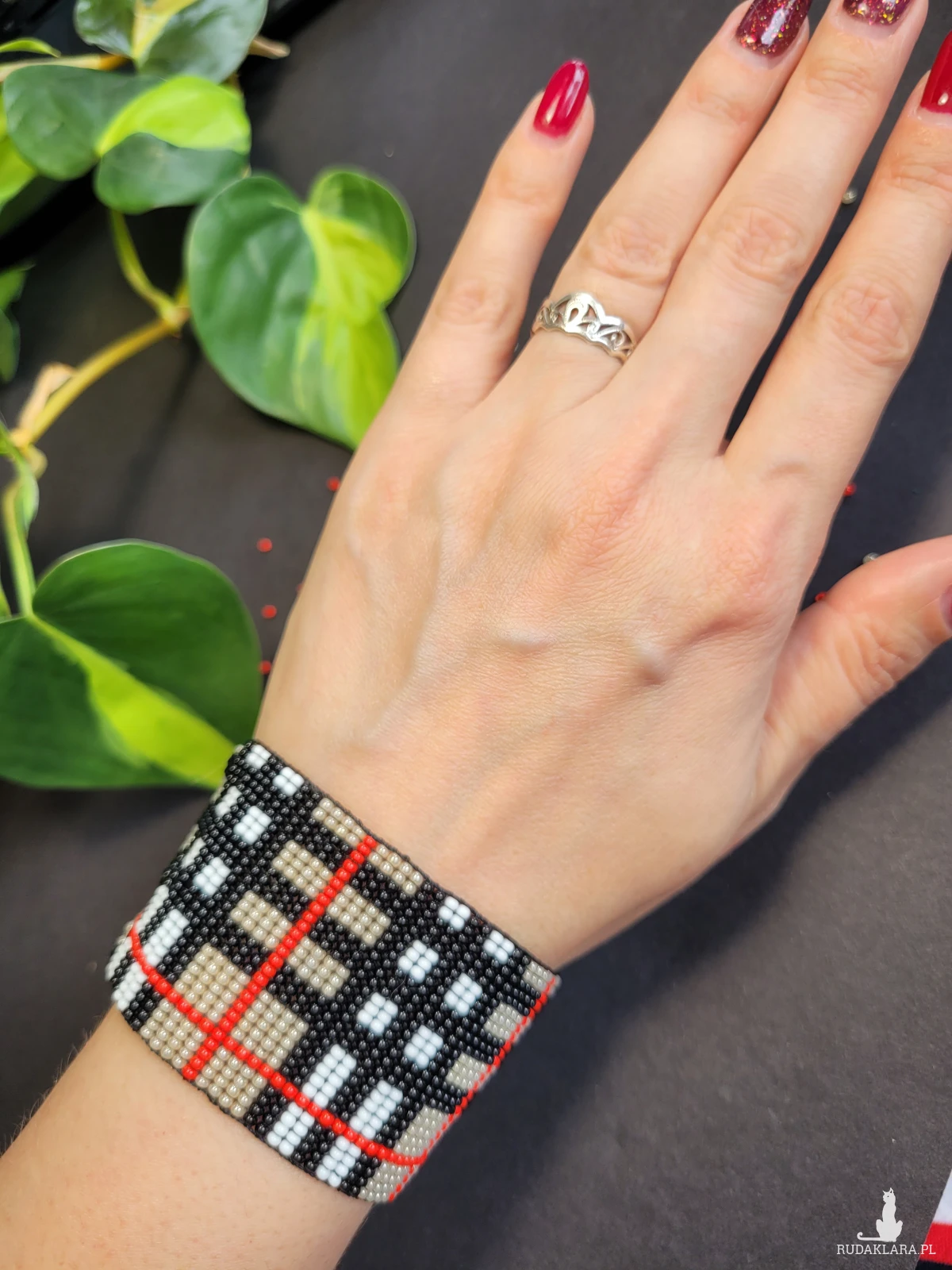 💃 Szeroka bransoletka w czarną i czerwoną kratkę własnoręcznie utkana na krosnie ze szklanych koralików czeskich Preciosa.