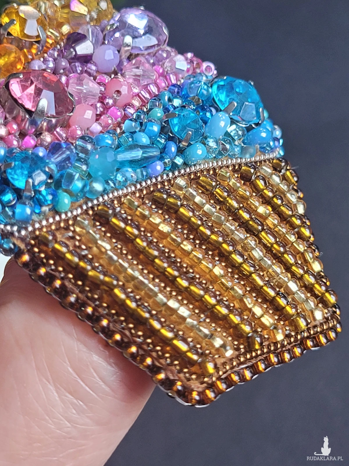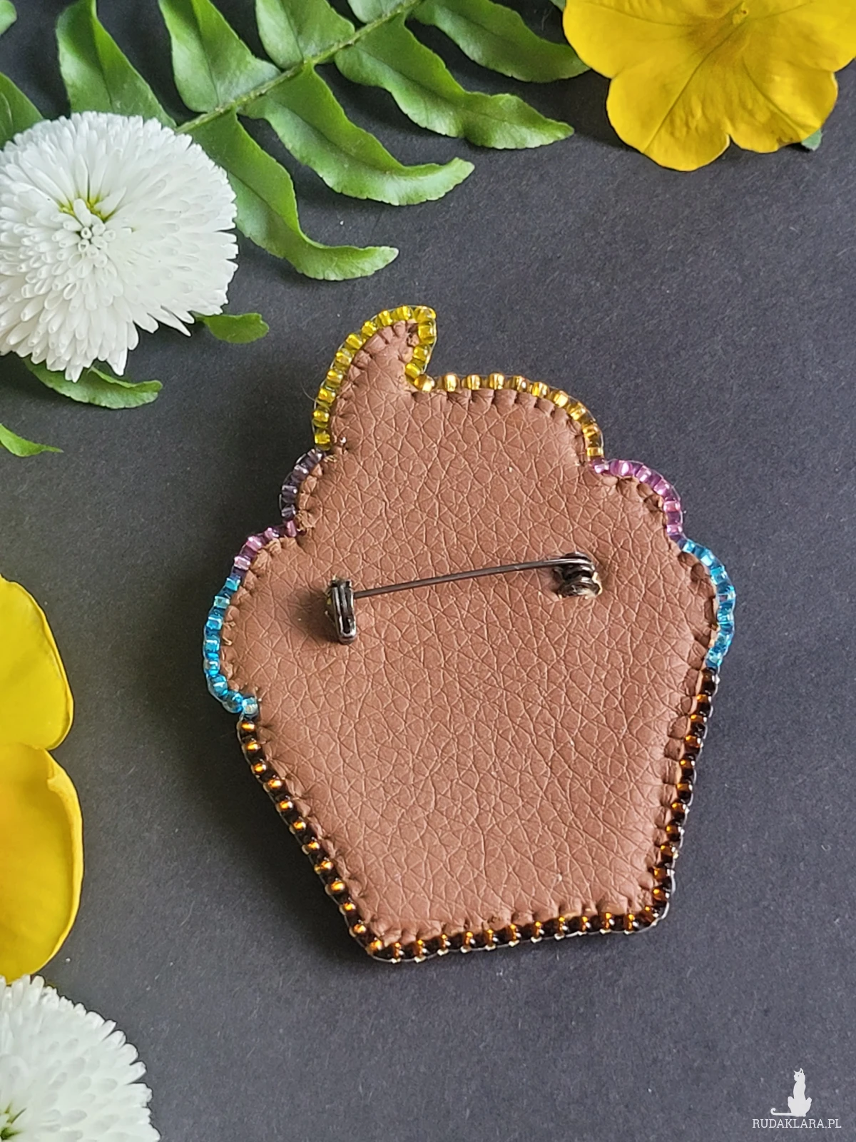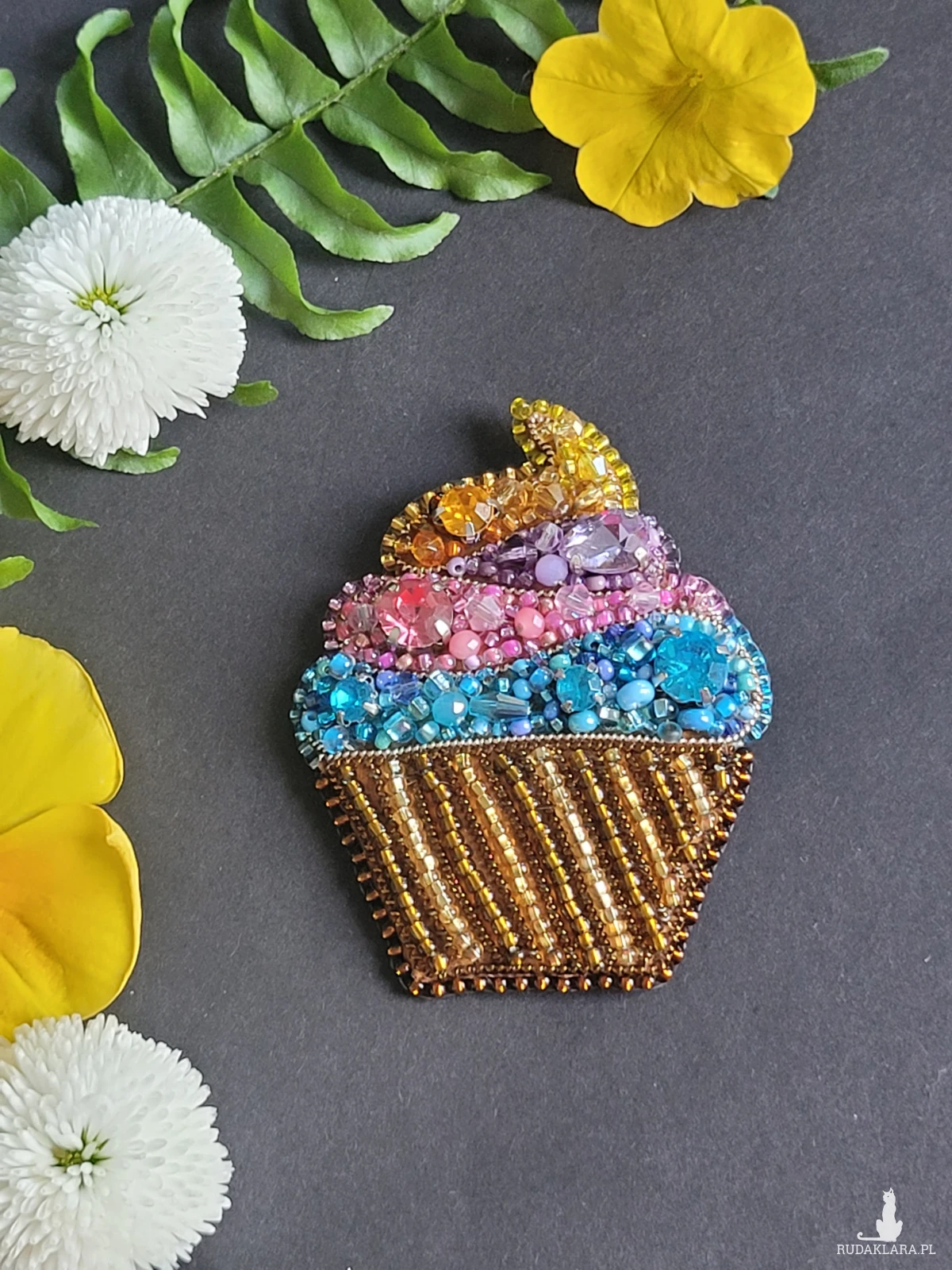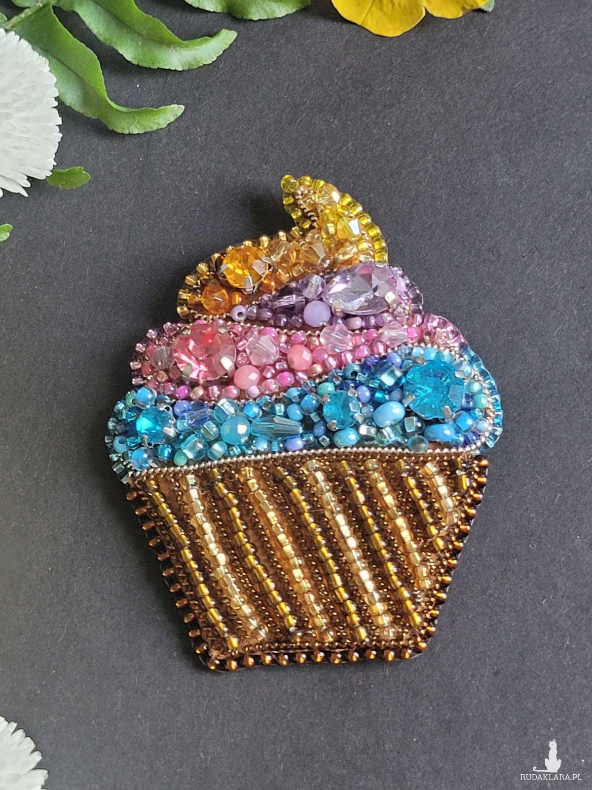 Broszka Muffinka babeczka haftowana kryształkami i koralikami Handmade