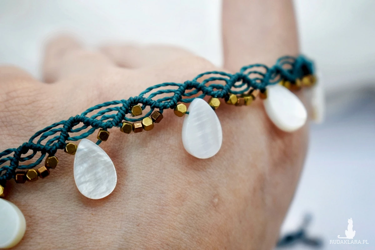 Bransoletka na stopę wykonana techniką mikro makramy.