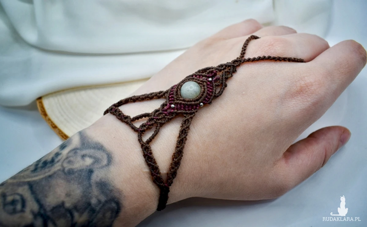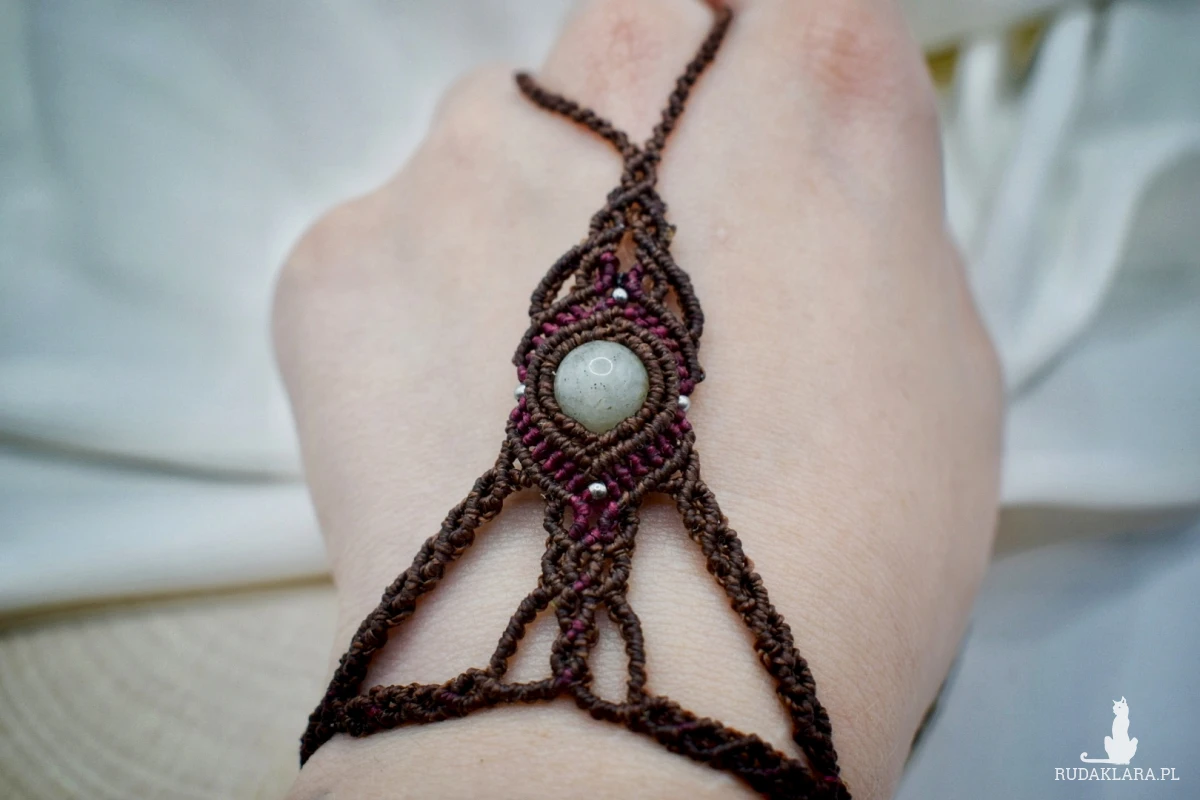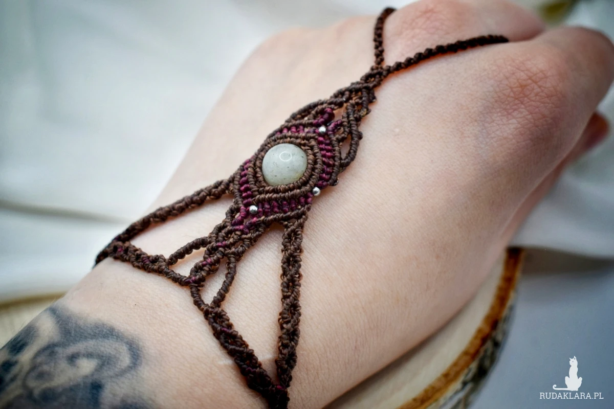 Makrama od środka nadgarstka do sznureczka który jest na palce (część z Labradorytem) Ok 11 cm.