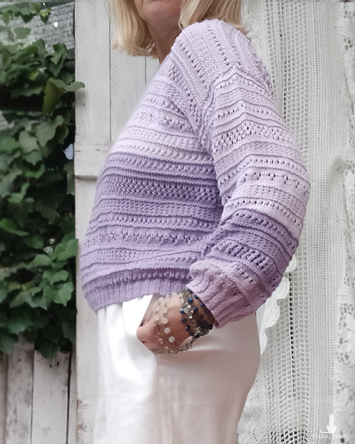 Ażurowy, krótki sweterek na lato. Wykonany ręcznie na drutach, z bawełny 100 %, miękki i luźno się układający.