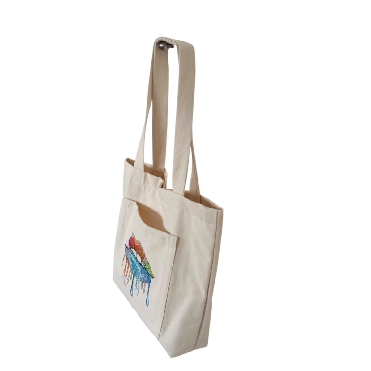 Przód torby z dużą kieszenią ozdobioną haftem. Dno torby poszerzone - tak aby mogła pomieścić wszystkie niezbędne drobiazgi i przydasie.
