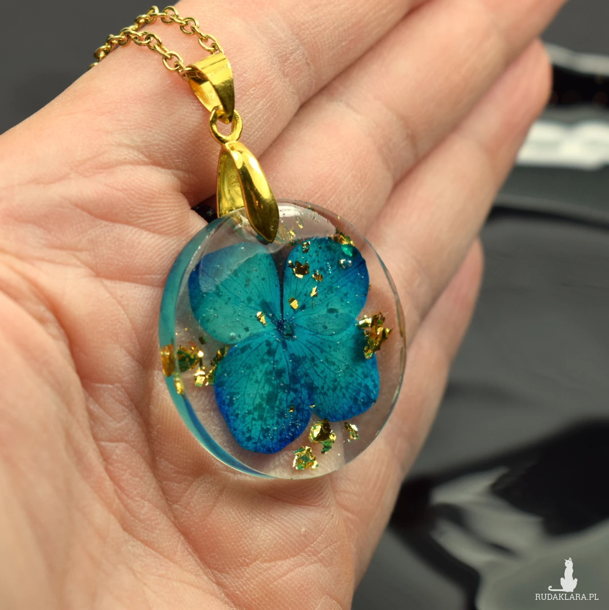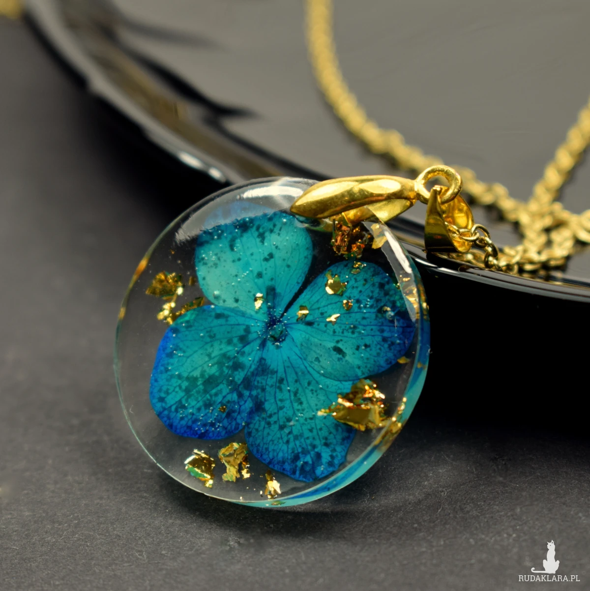 Subtelny, a zarazem wyjątkowy wisiorek z naturalnym kwiatem hortensji w