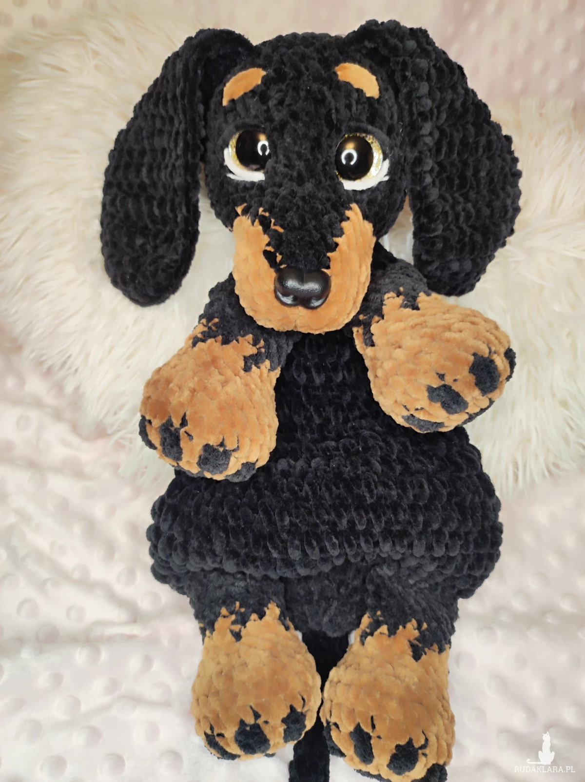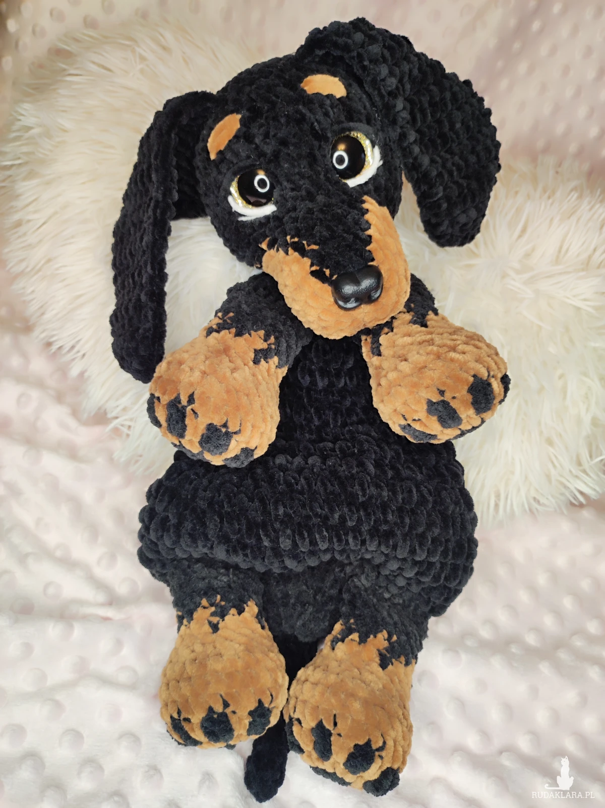 Maskotka jamnik -komforter na szydełku.